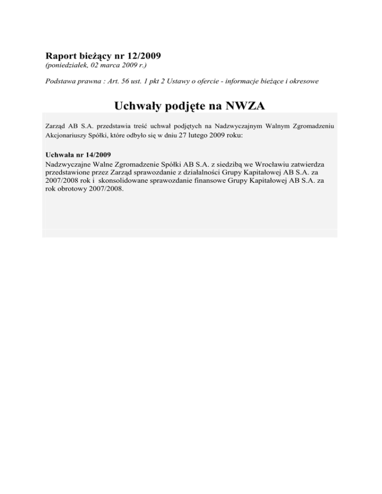 Raport bieŜący nr 12/2009 (poniedziałek, 02 marca 2009 r.) Podstawa prawna : Art. 56 ust. 1 pkt 2 Ustawy o ofercie - informacje bieŜące i okresowe Uchwały podjęte na NWZA Zarząd AB S.A. przedstawia treść uchwał podjętych na Nadzwyczajnym Walnym Zgromadzeniu Akcjonariuszy Spółki, które odbyło się w dniu 27 lutego 2009 roku: Uchwała nr 14/2009 Nadzwyczajne Walne Zgromadzenie Spółki AB S.A. z siedzibą we Wrocławiu zatwierdza przedstawione przez Zarząd sprawozdanie z działalności Grupy Kapitałowej AB S.A. za 2007/2008 rok i skonsolidowane sprawozdanie finansowe Grupy Kapitałowej AB S.A. za rok obrotowy 2007/2008.