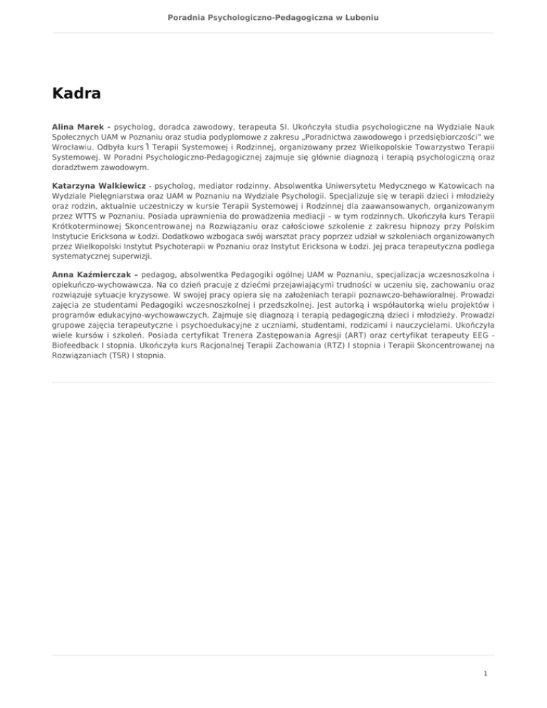 Poradnia Psychologiczno-Pedagogiczna w Luboniu Kadra Alina Marek - psycholog, doradca zawodowy, terapeuta SI. Ukończyła studia psychologiczne na Wydziale Nauk Społecznych UAM w Poznaniu oraz studia podyplomowe z zakresu „Poradnictwa zawodowego i przedsiębiorczości” we Wrocławiu. Odbyła kurs I̊ Terapii Systemowej i Rodzinnej, organizowany przez Wielkopolskie Towarzystwo Terapii Systemowej. W Poradni Psychologiczno-Pedagogicznej zajmuje się głównie diagnozą i terapią psychologiczną oraz doradztwem zawodowym. Katarzyna Walkiewicz - psycholog, mediator rodzinny. Absolwentka Uniwersytetu Medycznego w Katowicach na Wydziale Pielęgniarstwa oraz UAM w Poznaniu na Wydziale Psychologii. Specjalizuje się w terapii dzieci i młodzieży oraz rodzin, aktualnie uczestniczy w kursie Terapii Systemowej i Rodzinnej dla zaawansowanych, organizowanym przez WTTS w Poznaniu. Posiada uprawnienia do prowadzenia mediacji – w tym rodzinnych. Ukończyła kurs Terapii Krótkoterminowej Skoncentrowanej na Rozwiązaniu oraz całościowe szkolenie z zakresu hipnozy przy Polskim Instytucie Ericksona w Łodzi. Dodatkowo wzbogaca swój warsztat pracy poprzez udział w szkoleniach organizowanych przez Wielkopolski Instytut Psychoterapii w Poznaniu oraz Instytut Ericksona w Łodzi. Jej praca terapeutyczna podlega systematycznej superwizji. Anna Kaźmierczak – pedagog, absolwentka Pedagogiki ogólnej UAM w Poznaniu, specjalizacja wczesnoszkolna i opiekuńczo-wychowawcza. Na co dzień pracuje z dziećmi przejawiającymi trudności w uczeniu się, zachowaniu oraz rozwiązuje sytuacje kryzysowe. W swojej pracy opiera się na założeniach terapii poznawczo-behawioralnej. Prowadzi zajęcia ze studentami Pedagogiki wczesnoszkolnej i przedszkolnej. Jest autorką i współautorką wielu projektów i programów edukacyjno-wychowawczych. Zajmuje się diagnozą i terapią pedagogiczną dzieci i młodzieży. Prowadzi grupowe zajęcia terapeutyczne i psychoedukacyjne z uczniami, studentami, rodzicami i nauczycielami. Ukończyła wiele kursów i szkoleń. Posiada certyfikat Trenera Zastępowania Agresji (ART) oraz certyfikat terapeuty EEG Biofeedback I stopnia. Ukończyła kurs Racjonalnej Terapii Zachowania (RTZ) I stopnia i Terapii Skoncentrowanej na Rozwiązaniach (TSR) I stopnia. 1