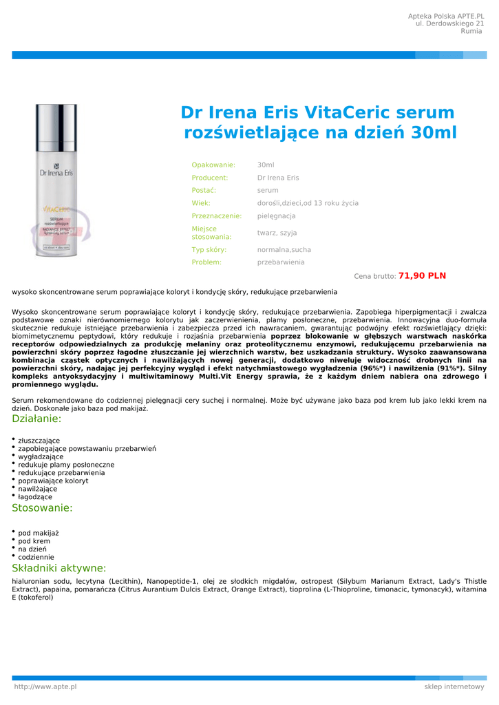 Apteka Polska APTE.PL ul. Derdowskiego 21 Rumia Dr Irena Eris VitaCeric serum rozświetlające na dzień 30ml Opakowanie: 30ml Producent: Dr Irena Eris Postać: serum Wiek: dorośli,dzieci,od 13 roku życia Przeznaczenie: pielęgnacja Miejsce stosowania: twarz, szyja Typ skóry: normalna,sucha Problem: przebarwienia Cena brutto: 71,90 PLN wysoko skoncentrowane serum poprawiające koloryt i kondycję skóry, redukujące przebarwienia Wysoko skoncentrowane serum poprawiające koloryt i kondycję skóry, redukujące przebarwienia. Zapobiega hiperpigmentacji i zwalcza podstawowe oznaki nierównomiernego kolorytu jak zaczerwienienia, plamy posłoneczne, przebarwienia. Innowacyjna duo-formuła skutecznie redukuje istniejące przebarwienia i zabezpiecza przed ich nawracaniem, gwarantując podwójny efekt rozświetlający dzięki: biomimetycznemu peptydowi, który redukuje i rozjaśnia przebarwienia poprzez blokowanie w głębszych warstwach naskórka receptorów odpowiedzialnych za produkcję melaniny oraz proteolitycznemu enzymowi, redukującemu przebarwienia na powierzchni skóry poprzez łagodne złuszczanie jej wierzchnich warstw, bez uszkadzania struktury. Wysoko zaawansowana kombinacja cząstek optycznych i nawilżających nowej generacji, dodatkowo niweluje widoczność drobnych linii na powierzchni skóry, nadając jej perfekcyjny wygląd i efekt natychmiastowego wygładzenia (96%*) i nawilżenia (91%*). Silny kompleks antyoksydacyjny i multiwitaminowy Multi.Vit Energy sprawia, że z każdym dniem nabiera ona zdrowego i promiennego wyglądu. Serum rekomendowane do codziennej pielęgnacji cery suchej i normalnej. Może być używane jako baza pod krem lub jako lekki krem na dzień. Doskonałe jako baza pod makijaż. Działanie: złuszczające zapobiegające powstawaniu przebarwień wygładzające redukuje plamy posłoneczne redukujące przebarwienia poprawiające koloryt nawilżające łagodzące Stosowanie: pod makijaż pod krem na dzień codziennie Składniki aktywne: hialuronian sodu, lecytyna (Lecithin), Nanopeptide-1, olej ze słodkich migdałów, ostropest (Silybum Marianum Extract, Lady's Thistle Extract), papaina, pomarańcza (Citrus Aurantium Dulcis Extract, Orange Extract), tioprolina (L-Thioproline, timonacic, tymonacyk), witamina E (tokoferol) http://www.apte.pl sklep internetowy