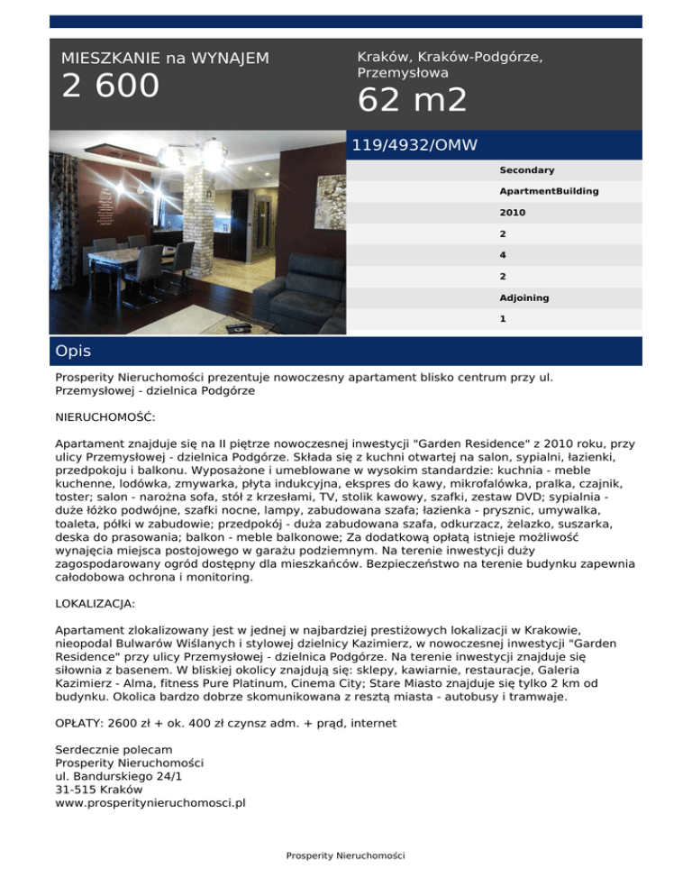 MIESZKANIE na WYNAJEM 2 600 Kraków, Kraków-Podgórze, Przemysłowa 62 m2 119/4932/OMW Secondary ApartmentBuilding 2010 2 4 2 Adjoining 1 Opis Prosperity Nieruchomości prezentuje nowoczesny apartament blisko centrum przy ul. Przemysłowej - dzielnica Podgórze NIERUCHOMOŚĆ: Apartament znajduje się na II piętrze nowoczesnej inwestycji "Garden Residence" z 2010 roku, przy ulicy Przemysłowej - dzielnica Podgórze. Składa się z kuchni otwartej na salon, sypialni, łazienki, przedpokoju i balkonu. Wyposażone i umeblowane w wysokim standardzie: kuchnia - meble kuchenne, lodówka, zmywarka, płyta indukcyjna, ekspres do kawy, mikrofalówka, pralka, czajnik, toster; salon - narożna sofa, stół z krzesłami, TV, stolik kawowy, szafki, zestaw DVD; sypialnia duże łóżko podwójne, szafki nocne, lampy, zabudowana szafa; łazienka - prysznic, umywalka, toaleta, półki w zabudowie; przedpokój - duża zabudowana szafa, odkurzacz, żelazko, suszarka, deska do prasowania; balkon - meble balkonowe; Za dodatkową opłatą istnieje możliwość wynajęcia miejsca postojowego w garażu podziemnym. Na terenie inwestycji duży zagospodarowany ogród dostępny dla mieszkańców. Bezpieczeństwo na terenie budynku zapewnia całodobowa ochrona i monitoring. LOKALIZACJA: Apartament zlokalizowany jest w jednej w najbardziej prestiżowych lokalizacji w Krakowie, nieopodal Bulwarów Wiślanych i stylowej dzielnicy Kazimierz, w nowoczesnej inwestycji "Garden Residence" przy ulicy Przemysłowej - dzielnica Podgórze. Na terenie inwestycji znajduje się siłownia z basenem. W bliskiej okolicy znajdują się: sklepy, kawiarnie, restauracje, Galeria Kazimierz - Alma, fitness Pure Platinum, Cinema City; Stare Miasto znajduje się tylko 2 km od budynku. Okolica bardzo dobrze skomunikowana z resztą miasta - autobusy i tramwaje. OPŁATY: 2600 zł + ok. 400 zł czynsz adm. + prąd, internet Serdecznie polecam Prosperity Nieruchomości ul. Bandurskiego 24/1 31-515 Kraków www.prosperitynieruchomosci.pl Prosperity Nieruchomości www.prosperity-group.pl Prosperity Nieruchomości tel. 727 634 784 email: [email protected] Prosperity Nieruchomości Powered by TCPDF (www.tcpdf.org)