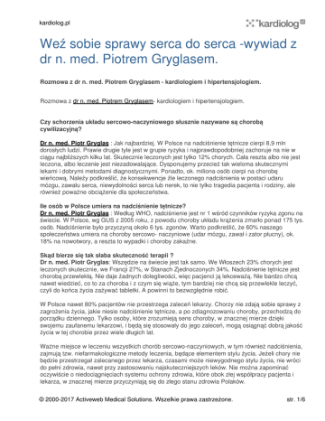 kardiolog.pl Weź sobie sprawy serca do serca -wywiad z dr n. med. Piotrem Gryglasem. Rozmowa z dr n. med. Piotrem Gryglasem - kardiologiem i hipertensjologiem. Rozmowa z dr n. med. Piotrem Gryglasem- kardiologiem i hipertensjologiem. Czy schorzenia układu sercowo-naczyniowego słusznie nazywane są chorobą cywilizacyjną? Dr n. med. Piotr Gryglas : Jak najbardziej. W Polsce na nadciśnienie tętnicze cierpi 8,9 mln dorosłych ludzi. Prawie drugie tyle jest w grupie ryzyka i najprawdopodobniej zachoruje na nie w ciągu najbliższych kilku lat. Skutecznie leczonych jest tylko 12% chorych. Cała reszta albo nie jest leczona, albo leczenie jest niezadowalające. Dysponujemy przecież tak wieloma skutecznymi lekami i dobrymi metodami diagnostycznymi. Ponadto, ok. miliona osób cierpi na chorobę wieńcową. Należy podkreślić, że konsekwencje źle leczonego nadciśnienia w postaci udaru mózgu, zawału serca, niewydolności serca lub nerek, to nie tylko tragedia pacjenta i rodziny, ale również poważne obciążenie dla społeczeństwa. Ile osób w Polsce umiera na nadciśnienie tętnicze? Dr n. med. Piotr Gryglas : Według WHO, nadciśnienie jest nr 1 wśród czynników ryzyka zgonu na świecie. W Polsce, wg GUS z 2005 roku, z powodu choroby układu krążenia zmarło ponad 175 tys. osób. Nadciśnienie było przyczyną około 6 tys. zgonów. Warto podkreślić, że 60% naszego społeczeństwa umiera na choroby sercowo- naczyniowe (udar mózgu, zawał i zator płucny), ok. 18% na nowotwory, a reszta to wypadki i choroby zakaźne. Skąd bierze się tak słaba skuteczność terapii ? Dr n. med. Piotr Gryglas: Wszędzie na świecie jest tak samo. We Włoszech 23% chorych jest leczonych skutecznie, we Francji 27%, w Stanach Zjednoczonych 34%. Nadciśnienie tętnicze jest chorobą przewlekłą. Nie daje żadnych dolegliwości, więc pacjenci ją lekceważą. Nie bardzo chcą nawet wiedzieć, co to za choroba i z czym się wiąże, tym bardziej nie chcą się przewlekle leczyć, czyli do końca życia zażywać tabletki. A powinni to bezwzględnie robić. W Polsce nawet 80% pacjentów nie przestrzega zaleceń lekarzy. Chorzy nie zdają sobie sprawy z zagrożenia życia, jakie niesie nadciśnienie tętnicze, a po zdiagnozowaniu choroby, przechodzą do porządku dziennego. Tylko osoby, które zrozumieją sens choroby, w znacznej mierze dzięki swojemu zaufanemu lekarzowi, i będą się stosowały do jego zaleceń, mogą osiągnąć dobrą jakość życia w tej chorobie przez wiele długich lat. Ważne miejsce w leczeniu wszystkich chorób sercowo-naczyniowych, w tym również nadciśnienia, zajmują tzw. niefarmakologiczne metody leczenia, będące elementem stylu życia. Jeżeli chory nie będzie przestrzegał zalecanego przez lekarza, czasami może niewygodnego stylu życia, nie wróci do pełni zdrowia, nawet przy zastosowaniu najskuteczniejszych leków. Nie można zapominać oczywiście o niedociągnięciach systemu ochrony zdrowia, które obok złej współpracy pacjenta i lekarza, w znacznej mierze przyczyniają się do złego stanu zdrowia Polaków. © 2000-2017 Activeweb Medical Solutions. Wszelkie prawa zastrzeżone. str. 1/6 kardiolog.pl Do czego prowadzi nieleczone nadciśnienie tętnicze? Dr n. med. Piotr Gryglas: Z niego wynikają wszystkie choroby sercowo-naczyniowe. Ale to nie jest tak, że kto na nie cierpi, to od razu umrze. Nieprawdą jest również to, że kto ma ciśnienie 160 -170/ 100 (mmHg) dostanie wylewu. Ciśnienie do 180/ 110 mm Hg to wartości umiarkowane. Oczywiście powinny być obniżone do mniej niż 140 na 90 mm Hg. Natomiast, ciśnienie 142/92 mm Hg może być niebezpieczne, jeśli trwa 20 lat, ponieważ przy tej wartości i w tak długim czasie trwania, uszkadza ono naczynia w sposób nieodwracalny. Nadciśnienie przyspiesza rozwój miażdżycy, powoduje pogrubianie ścian naczyń oraz ściany serca, co prowadzi do jego niedokrwienia. Jeżeli pacjent ma chorobą wieńcową, czyli zwężone naczynie wieńcowe z powodu miażdżycy albo przerostu jego ściany i zmniejszenia światła, to efekt jest ten sam - niedokrwienie mięśnia serca i w efekcie zawał. W tym przypadku chory zostaje kaleką, bo taki zawał prowadzi do przewlekłej niewydolności serca, w wyniku której pacjent nie zrobi pięciu kroków bez duszności. Niestety, może się również zdarzyć, że zawał będzie śmiertelny. Chorzy, którzy trafiają na nasze sale reanimacyjne są wypadkową 20-30 lat niezdrowego trybu życia, niekontrolowanego nadciśnienia oraz cukrzycy i diety. Jakie są najczęstsze czynniki ryzyka chorób serca? Dr n. med. Piotr Gryglas: Generalnie wyróżniamy: - trzy niezmienne czynniki, na które ani lekarz ani pacjent nie mają wpływu; wiek i płeć pacjenta oraz czynniki genetyczne. I tu oczywiście płeć męska jest bardziej zagrożona. Jeśli chodzi o wiek -kobiety powyżej 60. roku życia, mężczyźni powyżej 55. roku życia. - czynniki ryzyka zmienne, na które mamy wpływ to: nadciśnienie tętnicze, cukrzyca, otyłość i hipercholesterolemia. Do tego dochodzi palenie tytoniu, siedzący tryb życia -to jest dramat, w naszym kraju ludzie nie lubią zażywać ruchu i wreszcie stres - jeden z najsilniejszych czynników, który uszkadza naczynia i podnosi ciśnienie. Ponadto wysoki poziom fibrynogenów oraz kwasu moczowego. Te czynniki zwiększają wystąpienie miażdżycy i uszkodzenie naczyń. Cukrzyca biologicznie postarza organizm o 10 lat, a nadciśnienie łącznie z cukrzycą - o 20 lat. Czyli naczynia 40-latka są takie, jak u 60 latka. Palenie tytoniu bardzo niszczy naczynia, powoduje ich zwężenie. Kiedy oglądam dno oka i naczynia siatkówki oka u osiemnastolatka, który od czterech lat pali papierosy, widzę takie same naczynia, jak u człowieka chorego od 20 lat na nadciśnienie. Mówiłem o małych naczyniach, których zamknięcie prowadzi do tragedii. Pacjenci generalnie boją się efektu końcowego, czyli zawału, udaru bądź śmierci. Kiedy p