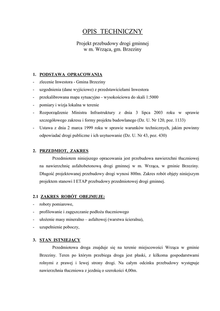 OPIS TECHNICZNY Projekt przebudowy drogi gminnej w m. Wrząca, gm. Brzeziny 1. PODSTAWA OPRACOWANIA - zlecenie Inwestora - Gmina Brzeziny - uzgodnienia (dane wyjściowe) z przedstawicielami Inwestora - przekalibrowana mapa sytuacyjno - wysokościowa do skali 1:5000 - pomiary i wizja lokalna w terenie - Rozporządzenie Ministra Infrastruktury z dnia 3 lipca 2003 roku w sprawie szczegółowego zakresu i formy projektu budowlanego (Dz. U. Nr 120, poz. 1133) - Ustawa z dnia 2 marca 1999 roku w sprawie warunków technicznych, jakim powinny odpowiadać drogi publiczne i ich usytuowanie (Dz. U. Nr 43, poz. 430) 2. PRZEDMIOT, ZAKRES Przedmiotem niniejszego opracowania jest przebudowa nawierzchni tłuczniowej na nawierzchnię asfaltobetonową drogi gminnej w m. Wrząca, w gminie Brzeziny. Długość projektowanej przebudowy drogi wynosi 800m. Zakres robót objęty niniejszym projektem stanowi I ETAP przebudowy przedmiotowej drogi gminnej. 2.1 ZAKRES ROBÓT OBEJMUJE: - roboty pomiarowe, - profilowanie i zagęszczanie podłoŜa tłuczniowego - ułoŜenie masy mineralno – asfaltowej (warstwa ścieralna), - uzupełnienie poboczy, 3. STAN ISTNIEJĄCY Przedmiotowa droga znajduje się na terenie miejscowości Wrząca w gminie Brzeziny. Teren po którym przebiega droga jest płaski, z kilkoma gospodarstwami rolnymi z prawej i lewej strony drogi. Na całym odcinku przebudowy występuje nawierzchnia tłuczniowa z jezdnią o szerokości 4,00m. 3.1 PARAMETRY DROGI ISTNIEJĄCEJ - nawierzchnia: tłuczniowa - szerokość jezdni: 4,00m - szerokość korony: 6,00m 4. STAN PROJEKTOWANY Projekt obejmuje przebudowę drogi gminnej w m. Wrząca w gminie Brzeziny. Długość przebudowywanej nawierzchni drogi wynosi 800m. Początek przebudowywanej drogi w km 0+000 znajduje się na krawędzi jezdni asfaltobetonowej drogi powiatowej nr 4628P odcinek 060. Przekrój poprzeczny drogi przyjęto daszkowy o szerokości jezdni 4,00m, poboczy po 1,00m. Ze względu na standard techniczny, wyposaŜenie i zgodnie z Dz. U. Nr 43, poz. 430 z dnia 2 marca 1999 r. o drogach publicznych przyjęto klasę techniczną D (droga dojazdowa). Przebudowywana droga jest drogą gminną dlatego teŜ droga klasy technicznej D jest ogólnodostępną drogą przeznaczoną dla wszystkich uŜytkowników. Cały zakres projektowanych robót zlokalizowany jest w istniejącym pasie drogowym drogi gminnej. 4.1 PARAMETRY TECHNICZNE - klasa drogi - D (dojazdowa) - kategoria obciąŜenia - KR1 - długość drogi - 800m - szerokość jezdni - 4,00m - szerokość poboczy - 1,00m - szerokość korony - 6,00m - spadek nawierzchni - 2 % - spadek poboczy -7% 4.2 ROZWIĄZANIA SYTUACYJNE Oś projektowanej drogi przyjęto w osi istniejącej drogi tłuczniowej. Projektowaną niweletę drogi gminnej (po osi) dostosowuje się do stanu istniejącego z uwzględnieniem warstw konstrukcyjnych i spadków niezbędnych do prawidłowego odwodnienia i wykonania drogi. 4.3 KONSTRUKCJA NAWIERZCHNI - istniejąca podbudowa tłuczniowa o szer. 4,00m - nawierzchnia z mieszanek mineralno-asf. dla ruchu KR1-KR2 (w-wa ścieralna) o gr. 4cm 4.4 ODWODNIENIE DROGI Odwodnienie powierzchniowe pasa drogowego uzyska się poprzez spadki poprzeczne i podłuŜne nawierzchni jezdni oraz poboczy. 4.5 POZOSTAŁE ROBOTY I CZYNNIKI Cały zakres robót zlokalizowany jest w istniejącym pasie drogowym drogi gminnej. Projektowana budowa drogi nie wprowadza zmian w funkcjonowaniu istniejącego środowiska, poniewaŜ zlokalizowana jest w uŜytkowym pasie drogowym. Roboty naleŜy wykonywać zgodnie z przepisami, zasadami i normami obowiązującymi w tym zakresie. 5. BEZPIECZEŃSTWO I HIGIENA PRACY Realizując przedmiotową inwestycję szczególną uwagę naleŜy zwrócić na to, aby: - zabezpieczenie i prawidłowe oznakowanie robót przez cały czas przebudowy nawierzchni w/w drogi gminnej, - pracownicy w czasie robót ubrani byli w kamizelki ostrzegawcze. Wymagane jest równieŜ zapewnienie na czas wykonywanych robót zminimalizowanie ograniczeń i utrudnień dla indywidualnego ruchu lokalnego. 6. OPINIE I UZGODNIENIA PROJEKTU Realizacja robót objętych niniejszym opracowaniem wymaga: - zaakceptowania do realizacji przez Inwestora – Gminę Brzeziny - zgłoszenie robót budowlanych do Starostwa Powiatowego do Wydziału Architektury i Budownictwa