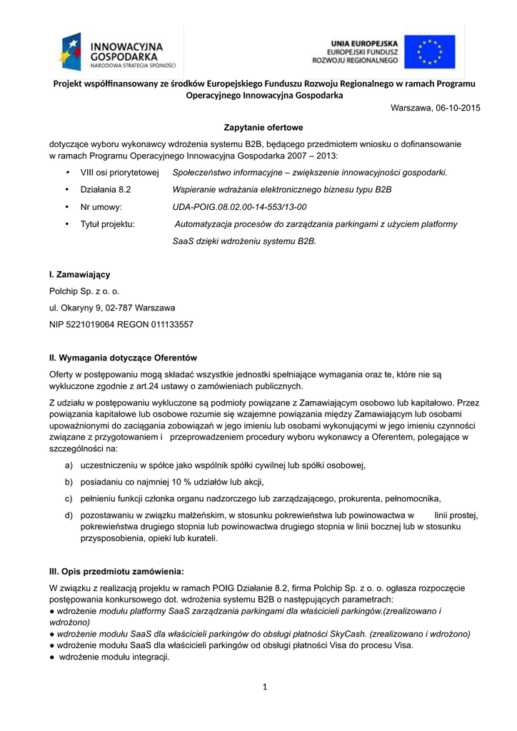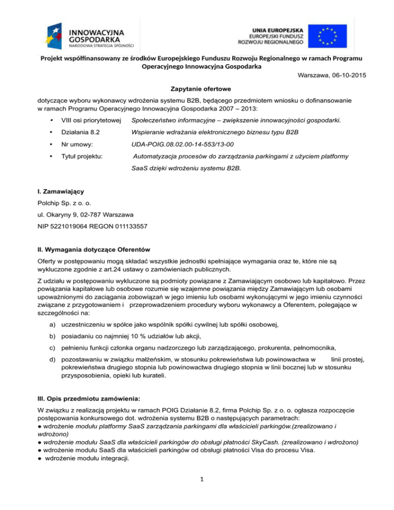 Projekt współfinansowany ze środków Europejskiego Funduszu Rozwoju Regionalnego w ramach Programu Operacyjnego Innowacyjna Gospodarka Warszawa, 06-10-2015 Zapytanie ofertowe dotyczące wyboru wykonawcy wdrożenia systemu B2B, będącego przedmiotem wniosku o dofinansowanie w ramach Programu Operacyjnego Innowacyjna Gospodarka 2007 – 2013: VIII osi priorytetowej Społeczeństwo informacyjne – zwiększenie innowacyjności gospodarki. Działania 8.2 Wspieranie wdrażania elektronicznego biznesu typu B2B Nr umowy: UDA-POIG.08.02.00-14-553/13-00 Tytuł projektu: Automatyzacja procesów do zarządzania parkingami z użyciem platformy SaaS dzięki wdrożeniu systemu B2B. I. Zamawiający Polchip Sp. z o. o. ul. Okaryny 9, 02-787 Warszawa NIP 5221019064 REGON 011133557 II. Wymagania dotyczące Oferentów Oferty w postępowaniu mogą składać wszystkie jednostki spełniające wymagania oraz te, które nie są wykluczone zgodnie z art.24 ustawy o zamówieniach publicznych. Z udziału w postępowaniu wykluczone są podmioty powiązane z Zamawiającym osobowo lub kapitałowo. Przez powiązania kapitałowe lub osobowe rozumie się wzajemne powiązania między Zamawiającym lub osobami upoważnionymi do zaciągania zobowiązań w jego imieniu lub osobami wykonującymi w jego imieniu czynności związane z przygotowaniem i przeprowadzeniem procedury wyboru wykonawcy a Oferentem, polegające w szczególności na: a) uczestniczeniu w spółce jako wspólnik spółki cywilnej lub spółki osobowej, b) posiadaniu co najmniej 10 % udziałów lub akcji, c) pełnieniu funkcji członka organu nadzorczego lub zarządzającego, prokurenta, pełnomocnika, d) pozostawaniu w związku małżeńskim, w stosunku pokrewieństwa lub powinowactwa w linii prostej, pokrewieństwa drugiego stopnia lub powinowactwa drugiego stopnia w linii bocznej lub w stosunku przysposobienia, opieki lub kurateli. III. Opis przedmiotu zamówienia: W związku z realizacją projektu w ramach POIG Działanie 8.2, firma Polchip Sp. z o. o. ogłasza rozpoczęcie postępowania konkursowego dot. wdrożenia systemu B2B o następujących parametrach: ● wdrożenie modułu platformy SaaS zarządzania parkingami dla właścicieli parkingów.(zrealizowano i wdrożono) ● wdrożenie modułu SaaS dla właścicieli parkingów do obsługi płatności SkyCash. (zrealizowano i wdrożono) ● wdrożenie modułu SaaS dla właścicieli parkingów od obsługi płatności Visa do procesu Visa. ● wdrożenie modułu integracji. 1 Projekt współfinansowany ze środków Europejskiego Funduszu Rozwoju Regionalnego w ramach Programu Operacyjnego Innowacyjna Gospodarka Przedmiotem zamówienia jest wdrożenie: · Modułu SaaS dla właścicieli parkingów od obsługi płatności Visa do procesu Visa. W związku z tym, że moduły stanowią integralną część tego samego systemu B2B technologia informatyczna niezbędna do wytworzenia oprogramowania jest taka sama we wszystkich modułach. Moduł ten będzie składał się z: 1. relacyjnej bazy danych (Postgre SQL lub innej o podobnej funkcjonalności); 2. silnika aplikacyjnego (middleware) odpowiadającego za integrację bazy danych, interfejsów oraz protokołów; Preferowane jest wykonanie logiki biznesowej w architekturze opartej na usługach (SOA). 3. technologia Python lub analogiczna interfejsów i protokołów wymiany danych, pomiędzy partnerami. Preferowane wykorzystanie strukturalizowanych metod zmiany danych, umożliwiających komunikację pomiędzy heterogenicznymi systemami (XML, JSON, EDI lub panel analogiczny) 4. panel administracyjny – podgląd, generowanie raportów, technologia Python GTK lub równoważna; Preferowane rozwiązania bazujące na wysoko konfigurowalnych silnikach raportowych (np. Jasper, Report, Pentaho). 5. strony internetowej (technologia PHP/Python/Javascript). Preferowane wykonanie przy użyciu technologii Angular JS. Moduł będzie automatyzował następujące elementy procesu: Przesyłanie do systemu informatycznego do urządzeń klienta informacji o finalizacji transakcji parkowania przez użytkowników parkingu na postawie uzyskanej autoryzacji transakcji. API udostępnione zostanie poprzez zestawiony tunel VPN, na protokole http lub w analogiczny sposób. Zalecanym protokołem komunikacyjnym jest SOAP lub podobny. Moduł SaaS dla właścicieli parkingów od obsługi płatności Visa zostanie zrealizowany jako usługa Software-as-aService, w której Właściciel parkingu będzie wiązał swoje konto płatności za pomocą kart kredytowych ze strefami parkingowymi i identyfikatorami klienta zdefiniowanymi w module platformy, SaaS do zarządzania parkingami. Proces ten opierać się będzie na Elektronicznej Wymianie Danych w standardzie EDI lub XML-RPC. Zostanie także użyty cienki klient lub zdalny dostęp przez klienta aplikacyjnego. Zautomatyzowanie tego procesu jest dużą innowacją, gdyż pozwala ona zapewnić jak najbardziej efektywny kontakt z klientem i niewątpliwie podnosi konkurencyjność oferty usług, co jest zgodne z w/w definicją innowacyjności. Termin wykonania zamówienia: do 30.11.2015 Przedmiotem zamówienia jest wdrożenie: · Modułu integracji: Specyfikacja uproszczona: - wielowymiarowe testy wdrażanego systemu; - integracja wszystkich wdrożonych wcześniej modułów. 2 Projekt współfinansowany ze środków Europejskiego Funduszu Rozwoju Regionalnego w ramach Programu Operacyjnego Innowacyjna Gospodarka Moduł będzie zawierał: ● narzędzia zarządzania procesami oraz przepływu danych typu Workflow uwzględniające automatyczną zmianę statusów elementów procesów oraz śledzenie elementów procesów. Narzędzie Workflow będzie zawierać interfejs graficzny pozwalający na modelowanie procesów na diagramie; ● narzędzia zarządzania niestandardowymi przypadkami w procesie (w tym przechwytywanie wyjątków) ● narzędzie router umożliwiające konfiguralne (ustawiane za pomocą GUI) sterowanie automatycznymi akcjami wykonywany