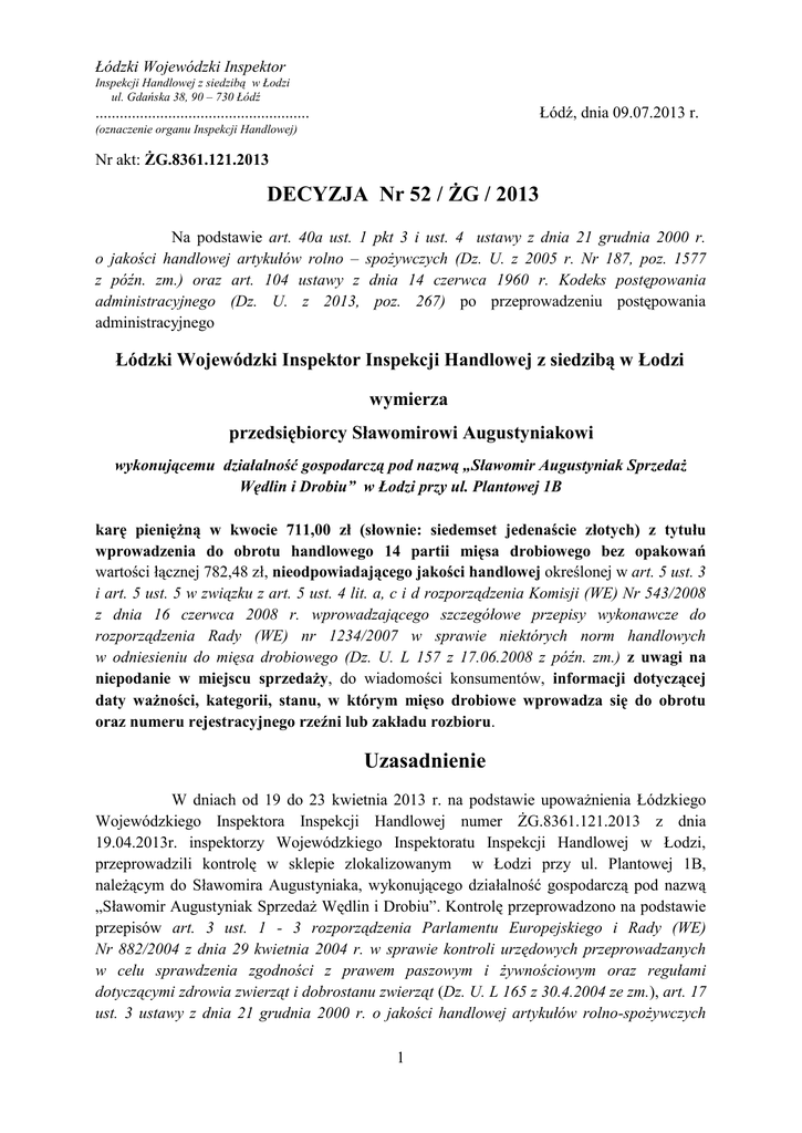 Łódzki Wojewódzki Inspektor Inspekcji Handlowej z siedzibą w Łodzi ul. Gdańska 38, 90 – 730 Łódź Łódź, dnia 09.07.2013 r. ..................................................... (oznaczenie organu Inspekcji Handlowej) Nr akt: ŻG.8361.121.2013 DECYZJA Nr 52 / ŻG / 2013 Na podstawie art. 40a ust. 1 pkt 3 i ust. 4 ustawy z dnia 21 grudnia 2000 r. o jakości handlowej artykułów rolno – spożywczych (Dz. U. z 2005 r. Nr 187, poz. 1577 z późn. zm.) oraz art. 104 ustawy z dnia 14 czerwca 1960 r. Kodeks postępowania administracyjnego (Dz. U. z 2013, poz. 267) po przeprowadzeniu postępowania administracyjnego Łódzki Wojewódzki Inspektor Inspekcji Handlowej z siedzibą w Łodzi wymierza przedsiębiorcy Sławomirowi Augustyniakowi wykonującemu działalność gospodarczą pod nazwą „Sławomir Augustyniak Sprzedaż Wędlin i Drobiu” w Łodzi przy ul. Plantowej 1B karę pieniężną w kwocie 711,00 zł (słownie: siedemset jedenaście złotych) z tytułu wprowadzenia do obrotu handlowego 14 partii mięsa drobiowego bez opakowań wartości łącznej 782,48 zł, nieodpowiadającego jakości handlowej określonej w art. 5 ust. 3 i art. 5 ust. 5 w związku z art. 5 ust. 4 lit. a, c i d rozporządzenia Komisji (WE) Nr 543/2008 z dnia 16 czerwca 2008 r. wprowadzającego szczegółowe przepisy wykonawcze do rozporządzenia Rady (WE) nr 1234/2007 w sprawie niektórych norm handlowych w odniesieniu do mięsa drobiowego (Dz. U. L 157 z 17.06.2008 z późn. zm.) z uwagi na niepodanie w miejscu sprzedaży, do wiadomości konsumentów, informacji dotyczącej daty ważności, kategorii, stanu, w którym mięso drobiowe wprowadza się do obrotu oraz numeru rejestracyjnego rzeźni lub zakładu rozbioru. Uzasadnienie W dniach od 19 do 23 kwietnia 2013 r. na podstawie upoważnienia Łódzkiego Wojewódzkiego Inspektora Inspekcji Handlowej numer ŻG.8361.121.2013 z dnia 19.04.2013r. inspektorzy Wojewódzkiego Inspektoratu Inspekcji Handlowej w Łodzi, przeprowadzili kontrolę w sklepie zlokalizowanym w Łodzi przy ul. Plantowej 1B, należącym do Sławomira Augustyniaka, wykonującego działalność gospodarczą pod nazwą „Sławomir Augustyniak Sprzedaż Wędlin i Drobiu”. Kontrolę przeprowadzono na podstawie przepisów art. 3 ust. 1 - 3 rozporządzenia Parlamentu Europejskiego i Rady (WE) Nr 882/2004 z dnia 29 kwietnia 2004 r. w sprawie kontroli urzędowych przeprowadzanych w celu sprawdzenia zgodności z prawem paszowym i żywnościowym oraz regułami dotyczącymi zdrowia zwierząt i dobrostanu zwierząt (Dz. U. L 165 z 30.4.2004 ze zm.), art. 17 ust. 3 ustawy z dnia 21 grudnia 2000 r. o jakości handlowej artykułów rolno-spożywczych 1 (Dz. U. z 2005 r. nr 187, poz. 1577, z późn. zm.) w związku z art. 3 ust. 1 pkt 1, 2 i 6 ustawy z dnia 15 grudnia 2000 r. o Inspekcji Handlowej (Dz. U. z 2009 r. Nr 151, poz. 1219 z późn. zm.) w obecności właściciela Sławomira Augustyniaka. W trakcie prowadzonych działań kontrolnych stwierdzono, że w obrocie handlowym znajdowało się 14 partii niepaczkowanego mięsa drobiowego tj.: kurczak tusze w ilości 15,00 kg w cenie 6,99 zł/kg, porcja rosołowa z kurcząt w ilości 5,10 kg w cenie 1,90 zł/kg, pałki z kurczaka w ilości 8,00 kg w cenie 9,90 zł/kg, filety z kurczaka w ilości 15,00 kg w cenie 16,90 zł/kg, udka z kurczaka w ilości 6,90 kg w cenie 4,99 zł/kg, skrzydełka z kurczaka w ilości 3,00 kg w cenie 7,90 zł/kg, wątróbka z kurczaka ilości 3,50 kg w cenie 7,50 zł/kg, żołądki z indyka w ilości 1,80 kg w cenie 14,90 zł/kg, wątróbki z indyka w ilości 2,40 kg w cenie 7,90 zł/kg, piersi z indyka w ilości 1,50 kg w cenie 19,90 zł/kg, golonka z indyka w ilości 4,00 kg w cenie 9,99 zł/kg, skrzydła z indyka w ilości 5,00 kg w cenie 8,90 zł/kg, szyje z indyka w ilości 5,50 kg w cenie 6,90 zł/kg, udziec z indyka w ilości 3,80 kg w cenie 13,90 zł/kg o łącznej wartości 782,48 zł, dla których, wbrew obowiązkowi wynikającemu z art. 5 ust. 3 i art. 5 ust. 5 w związku z art. 5 ust. 4 lit. a, c i d rozporządzenia Komisji (WE) Nr 543/2008 z dnia 16 czerwca 2008 r. wprowadzającego szczegółowe przepisy wykonawcze do rozporządzenia Rady (WE) nr 1234/2007 w sprawie niektórych norm handlowych w odniesieniu do mięsa drobiowego (Dz. U. L 157 z 17.06.2008 z późn. zm.), zwanego dalej „rozporządzeniem 543/2008” w miejscu sprzedaży nie podano do wiadomości konsumentów informacji co do daty ważności, kategorii, stanu, w którym mięso drobiowe wprowadza się do obrotu oraz numeru rejestracyjnego rzeźni lub zakładu rozbioru. Powyższe nieprawidłowości zostały udokumentowane w protokole kontroli z dnia 19 kwietnia 2013 r. (numer akt ŻG.8361.121.2013), zestawieniu artykułów żywnościowych skontrolowanych pod względem oznakowania oraz na zdjęciach wykonanych w trakcie kontroli. W związku z powyższym w dniu 10 czerwca 2013 r. zostało wszczęte z urzędu postępowanie administracyjne w przedmiocie wymierzenia, na podstawie art. 40 a ust. 1 pkt 3 ustawy z dnia 21 grudnia 2000 r. o jakości handlowej artykułów rolno – spożywczych (Dz. U. z 2005 r. Nr 187, poz. 1577 z późn. zm.) zwanej dalej „ustawą o jakości” kary pieniężnej z tytułu wprowadzenia do obrotu środków spożywczych nieodpowiadających jakości handlowej. Strona została poinformowana o wszczęciu postępowania z urzędu oraz o przysługującym prawie do zapoznania się z aktami sprawy, wypowiedzenia się co do zebranych dowodów i materiałów, lecz z tego prawa nie skorzystała. Jednocześnie poproszono stronę o przesłanie informacji na temat wielkości obrotu za rok 2012. 2 W dniu 18 czerwca 2013 r. bezpośrednio w Wojewódzkim Inspektoracie Inspekcji Handlowej w Łodzi strona złożyła pismo, w którym podała wielkość obrotu za rok 2012. Łódzki Wojewódzki Inspektor Inspekcji Handlowej z siedzibą w Łodzi mając na uwadze powyższe ustalił i stwierdził. Zgodnie z przepisem art. 17 ust. 1 rozporządze