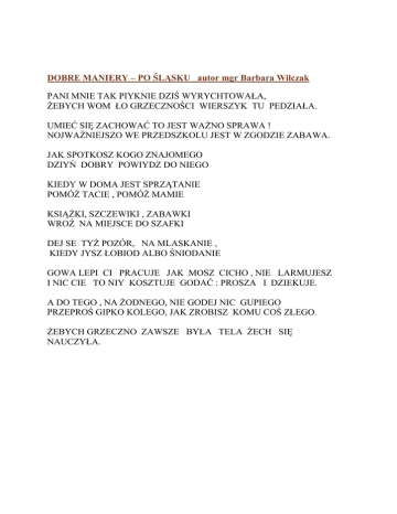 DOBRE MANIERY – PO ŚLĄSKU autor mgr Barbara Wilczak PANI MNIE TAK PIYKNIE DZIŚ WYRYCHTOWAŁA, ŻEBYCH WOM ŁO GRZECZNOŚCI WIERSZYK TU PEDZIAŁA. UMIEĆ SIĘ ZACHOWAĆ TO JEST WAŻNO SPRAWA ! NOJWAŻNIEJSZO WE PRZEDSZKOLU JEST W ZGODZIE ZABAWA. JAK SPOTKOSZ KOGO ZNAJOMEGO DZIYŃ DOBRY POWIYDZ DO NIEGO KIEDY W DOMA JEST SPRZĄTANIE POMÓŻ TACIE , POMÓŻ MAMIE KSIĄŻKI, SZCZEWIKI , ZABAWKI WROŹ NA MIEJSCE DO SZAFKI DEJ SE TYŻ POZÓR, NA MLASKANIE , KIEDY JYSZ ŁOBIOD ALBO ŚNIODANIE GOWA LEPI CI PRACUJE JAK MOSZ CICHO , NIE LARMUJESZ I NIC CIE TO NIY KOSZTUJE GODAĆ : PROSZA I DZIEKUJE. A DO TEGO , NA ŻODNEGO, NIE GODEJ NIC GUPIEGO PRZEPROŚ GIPKO KOLEGO, JAK ZROBISZ KOMU COŚ ZŁEGO. ŻEBYCH GRZECZNO ZAWSZE BYŁA TELA ŻECH SIĘ NAUCZYŁA.