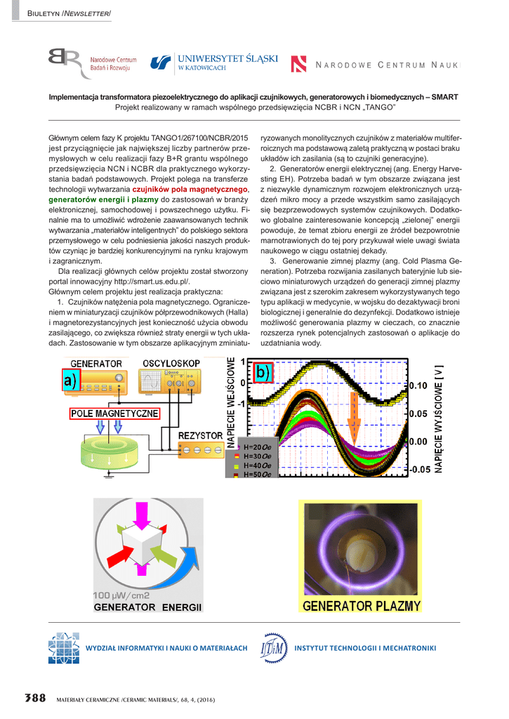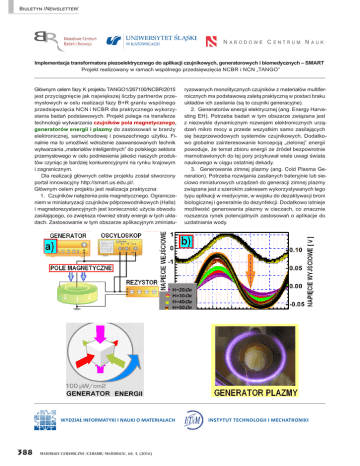 Biuletyn /Newsletter/ Implementacja transformatora piezoelektrycznego do aplikacji czujnikowych, generatorowych i biomedycznych – SMART Projekt realizowany w ramach wspólnego przedsięwzięcia NCBR i NCN „TANGO” Głównym celem fazy K projektu TANGO1/267100/NCBR/2015 jest przyciągnięcie jak największej liczby partnerów przemysłowych w celu realizacji fazy B+R grantu wspólnego przedsięwzięcia NCN i NCBR dla praktycznego wykorzystania badań podstawowych. Projekt polega na transferze technologii wytwarzania czujników pola magnetycznego, generatorów energii i plazmy do zastosowań w branży elektronicznej, samochodowej i powszechnego użytku. Finalnie ma to umożliwić wdrożenie zaawansowanych technik wytwarzania „materiałów inteligentnych” do polskiego sektora przemysłowego w celu podniesienia jakości naszych produktów czyniąc je bardziej konkurencyjnymi na rynku krajowym i zagranicznym. Dla realizacji głównych celów projektu został stworzony portal innowacyjny http://smart.us.edu.pl/. Głównym celem projektu jest realizacja praktyczna: 1. Czujników natężenia pola magnetycznego. Ograniczeniem w miniaturyzacji czujników półprzewodnikowych (Halla) i magnetorezystancyjnych jest konieczność użycia obwodu zasilającego, co zwiększa również straty energii w tych układach. Zastosowanie w tym obszarze aplikacyjnym zminiatu- WYDZIAŁ INFORMATYKI I NAUKI O MATERIAŁACH 388 MATERIA£Y CERAMICZNE /CERAMIC MATERIALS/, 68, 4, (2016) ryzowanych monolitycznych czujników z materiałów multiferroicznych ma podstawową zaletą praktyczną w postaci braku układów ich zasilania (są to czujniki generacyjne). 2. Generatorów energii elektrycznej (ang. Energy Harvesting EH). Potrzeba badań w tym obszarze związana jest z niezwykle dynamicznym rozwojem elektronicznych urządzeń mikro mocy a przede wszystkim samo zasilających się bezprzewodowych systemów czujnikowych. Dodatkowo globalne zainteresowanie koncepcją „zielonej” energii powoduje, że temat zbioru energii ze źródeł bezpowrotnie marnotrawionych do tej pory przykuwał wiele uwagi świata naukowego w ciągu ostatniej dekady. 3. Generowanie zimnej plazmy (ang. Cold Plasma Generation). Potrzeba rozwijania zasilanych bateryjnie lub sieciowo miniaturowych urządzeń do generacji zimnej plazmy związana jest z szerokim zakresem wykorzystywanych tego typu aplikacji w medycynie, w wojsku do dezaktywacji broni biologicznej i generalnie do dezynfekcji. Dodatkowo istnieje możliwość generowania plazmy w cieczach, co znacznie rozszerza rynek potencjalnych zastosowań o aplikacje do uzdatniania wody. INSTYTUT TECHNOLOGII I MECHATRONIKI