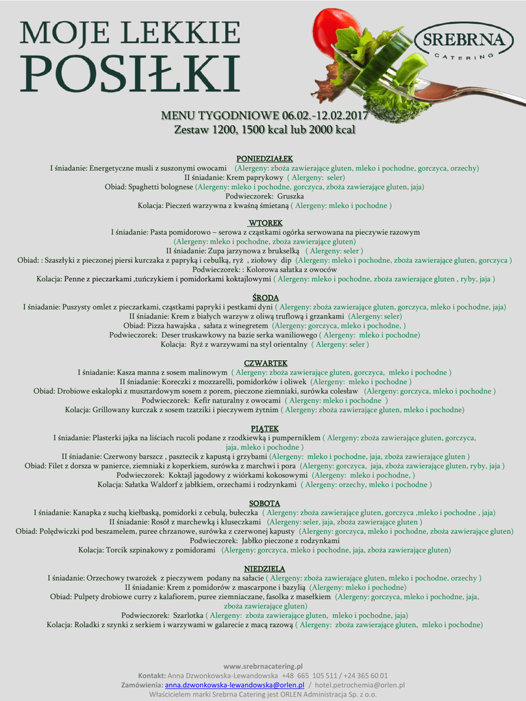 MENU TYGODNIOWE 06.02.-12.02.2017 Zestaw 1200, 1500 kcal lub 2000 kcal PONIEDZIAŁEK I śniadanie: Energetyczne musli z suszonymi owocami (Alergeny: zboża zawierające gluten, mleko i pochodne, gorczyca, orzechy) II śniadanie: Krem paprykowy ( Alergeny: seler) Obiad: Spaghetti bolognese (Alergeny: mleko i pochodne, gorczyca, zboża zawierające gluten, jaja) Podwieczorek: Gruszka Kolacja: Pieczeń warzywna z kwaśną śmietaną ( Alergeny: mleko i pochodne ) WTOREK I śniadanie: Pasta pomidorowo – serowa z cząstkami ogórka serwowana na pieczywie razowym (Alergeny: mleko i pochodne, zboża zawierające gluten) II śniadanie: Zupa jarzynowa z brukselką ( Alergeny: seler ) Obiad: : Szaszłyki z pieczonej piersi kurczaka z papryką i cebulką, ryż , ziołowy dip (Alergeny: mleko i pochodne, zboża zawierające gluten, gorczyca ) Podwieczorek: : Kolorowa sałatka z owoców Kolacja: Penne z pieczarkami ,tuńczykiem i pomidorkami koktajlowymi ( Alergeny: mleko i pochodne, zboża zawierające gluten , ryby, jaja ) ŚRODA I śniadanie: Puszysty omlet z pieczarkami, cząstkami papryki i pestkami dyni ( Alergeny: zboża zawierające gluten, gorczyca, mleko i pochodne, jaja) II śniadanie: Krem z białych warzyw z oliwą truflową i grzankami (Alergeny: seler) Obiad: Pizza hawajska , sałata z winegretem (Alergeny: gorczyca, mleko i pochodne, ) Podwieczorek: Deser truskawkowy na bazie serka waniliowego ( Alergeny: mleko i pochodne) Kolacja: Ryż z warzywami na styl orientalny ( Alergeny: seler ) CZWARTEK I śniadanie: Kasza manna z sosem malinowym ( Alergeny: zboża zawierające gluten, gorczyca, mleko i pochodne ) II śniadanie: Koreczki z mozzarelli, pomidorków i oliwek (Alergeny: mleko i pochodne ) Obiad: Drobiowe eskalopki z musztardowym sosem z porem, pieczone ziemniaki, surówka colesław (Alergeny: gorczyca, mleko i pochodne ) Podwieczorek: Kefir naturalny z owocami ( Alergeny: mleko i pochodne ) Kolacja: Grillowany kurczak z sosem tzatziki i pieczywem żytnim ( Alergeny: zboża zawierające gluten, mleko i pochodne) PIĄTEK I śniadanie: Plasterki jajka na liściach rucoli podane z rzodkiewką i pumperniklem ( Alergeny: zboża zawierające gluten, gorczyca, jaja, mleko i pochodne ) II śniadanie: Czerwony barszcz , pasztecik z kapustą i grzybami (Alergeny: mleko i pochodne, jaja, zboża zawierające gluten ) Obiad: Filet z dorsza w panierce, ziemniaki z koperkiem, surówka z marchwi i pora (Alergeny: gorczyca, jaja, zboża zawierające gluten, ryby, jaja ) Podwieczorek: Koktajl jagodowy z wiórkami kokosowymi (Alergeny: mleko i pochodne, ) Kolacja: Sałatka Waldorf z jabłkiem, orzechami i rodzynkami ( Alergeny: orzechy, mleko i pochodne ) SOBOTA I śniadanie: Kanapka z suchą kiełbaską, pomidorki z cebulą, bułeczka ( Alergeny: zboża zawierające gluten, gorczyca ,mleko i pochodne , jaja) II śniadanie: Rosół z marchewką i kluseczkami (Alergeny: seler, jaja, zboża zawierające gluten ) Obiad: Polędwiczki pod beszamelem, puree chrzanowe, surówka z czerwonej kapusty (Alergeny: gorczyca, mleko i pochodne, zboża zawierające gluten) Podwieczorek: Jabłko pieczone z rodzynkami Kolacja: Torcik szpinakowy z pomidorami (Alergeny: gorczyca, mleko i pochodne, jaja, zboża zawierające gluten) NIEDZIELA I śniadanie: Orzechowy twarożek z pieczywem podany na sałacie ( Alergeny: zboża zawierające gluten, mleko i pochodne, orzechy ) II śniadanie: Krem z pomidorów z mascarpone i bazylią (Alergeny: mleko i pochodne) Obiad: Pulpety drobiowe curry z kalafiorem, puree ziemniaczane, fasolka z masełkiem (Alergeny: gorczyca, mleko i pochodne, jaja, zboża zawierające gluten) Podwieczorek: Szarlotka ( Alergeny: zboża zawierające gluten, mleko i pochodne, jaja) Kolacja: Roladki z szynki z serkiem i warzywami w galarecie z macą razową ( Alergeny: zboża zawierające gluten, mleko i pochodne) www.srebrnacatering.pl Kontakt: Anna Dzwonkowska-Lewandowska +48 665 105 511 / +24 365 60 01 Zamówienia: [email protected] / [email protected] Właścicielem marki Srebrna Catering jest ORLEN Administracja Sp. z o.o.