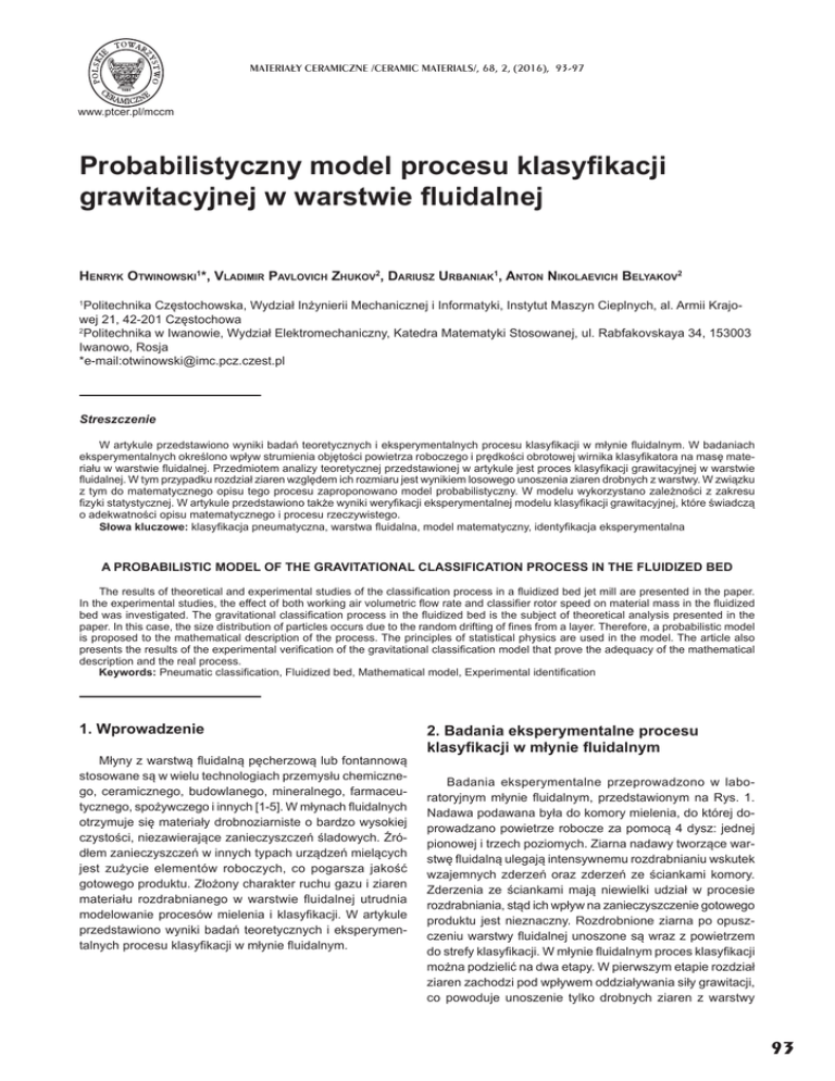 MATERIA£Y CERAMICZNE /CERAMIC MATERIALS/, 68, 2, (2016), 93-97 www.ptcer.pl/mccm Probabilistyczny model procesu klasy¿kacji grawitacyjnej w warstwie Àuidalnej HENRYK OTWINOWSKI1*, VLADIMIR PAVLOVICH ZHUKOV2, DARIUSZ URBANIAK1, ANTON NIKOLAEVICH BELYAKOV2 1 Politechnika CzĊstochowska, Wydziaá InĪynierii Mechanicznej i Informatyki, Instytut Maszyn Cieplnych, al. Armii Krajowej 21, 42-201 CzĊstochowa 2 Politechnika w Iwanowie, Wydziaá Elektromechaniczny, Katedra Matematyki Stosowanej, ul. Rabfakovskaya 34, 153003 Iwanowo, Rosja *e-mail:[email protected] Streszczenie W artykule przedstawiono wyniki badaĔ teoretycznych i eksperymentalnych procesu klasy¿kacji w máynie Àuidalnym. W badaniach eksperymentalnych okreĞlono wpáyw strumienia objĊtoĞci powietrza roboczego i prĊdkoĞci obrotowej wirnika klasy¿katora na masĊ materiaáu w warstwie Àuidalnej. Przedmiotem analizy teoretycznej przedstawionej w artykule jest proces klasy¿kacji grawitacyjnej w warstwie Àuidalnej. W tym przypadku rozdziaá ziaren wzglĊdem ich rozmiaru jest wynikiem losowego unoszenia ziaren drobnych z warstwy. W związku z tym do matematycznego opisu tego procesu zaproponowano model probabilistyczny. W modelu wykorzystano zaleĪnoĞci z zakresu ¿zyki statystycznej. W artykule przedstawiono takĪe wyniki wery¿kacji eksperymentalnej modelu klasy¿kacji grawitacyjnej, które Ğwiadczą o adekwatnoĞci opisu matematycznego i procesu rzeczywistego. Sáowa kluczowe: klasy¿kacja pneumatyczna, warstwa Àuidalna, model matematyczny, identy¿kacja eksperymentalna A PROBABILISTIC MODEL OF THE GRAVITATIONAL CLASSIFICATION PROCESS IN THE FLUIDIZED BED The results of theoretical and experimental studies of the classi¿cation process in a Àuidized bed jet mill are presented in the paper. In the experimental studies, the effect of both working air volumetric Àow rate and classi¿er rotor speed on material mass in the Àuidized bed was investigated. The gravitational classi¿cation process in the Àuidized bed is the subject of theoretical analysis presented in the paper. In this case, the size distribution of particles occurs due to the random drifting of ¿nes from a layer. Therefore, a probabilistic model is proposed to the mathematical description of the process. The principles of statistical physics are used in the model. The article also presents the results of the experimental veri¿cation of the gravitational classi¿cation model that prove the adequacy of the mathematical description and the real process. Keywords: Pneumatic classi¿cation, Fluidized bed, Mathematical model, Experimental identi¿cation 1. Wprowadzenie Máyny z warstwą Àuidalną pĊcherzową lub fontannową stosowane są w wielu technologiach przemysáu chemicznego, ceramicznego, budowlanego, mineralnego, farmaceutycznego, spoĪywczego i innych [1-5]. W máynach Àuidalnych otrzymuje siĊ materiaáy drobnoziarniste o bardzo wysokiej czystoĞci, niezawierające zanieczyszczeĔ Ğladowych. ħródáem zanieczyszczeĔ w innych typach urządzeĔ mielących jest zuĪycie elementów roboczych, co pogarsza jakoĞü gotowego produktu. ZáoĪony charakter ruchu gazu i ziaren materiaáu rozdrabnianego w warstwie Àuidalnej utrudnia modelowanie procesów mielenia i klasy¿kacji. W artykule przedstawiono wyniki badaĔ teoretycznych i eksperymentalnych procesu klasy¿kacji w máynie Àuidalnym. 2. Badania eksperymentalne procesu klasy¿kacji w máynie Àuidalnym Badania eksperymentalne przeprowadzono w laboratoryjnym máynie Àuidalnym, przedstawionym na Rys. 1. Nadawa podawana byáa do komory mielenia, do której doprowadzano powietrze robocze za pomocą 4 dysz: jednej pionowej i trzech poziomych. Ziarna nadawy tworzące warstwĊ Àuidalną ulegają intensywnemu rozdrabnianiu wskutek wzajemnych zderzeĔ oraz zderzeĔ ze Ğciankami komory. Zderzenia ze Ğciankami mają niewielki udziaá w procesie rozdrabniania, stąd ich wpáyw na zanieczyszczenie gotowego produktu jest nieznaczny. Rozdrobnione ziarna po opuszczeniu warstwy Àuidalnej unoszone są wraz z powietrzem do strefy klasy¿kacji. W máynie Àuidalnym proces klasy¿kacji moĪna podzieliü na dwa etapy. W pierwszym etapie rozdziaá ziaren zachodzi pod wpáywem oddziaáywania siáy grawitacji, co powoduje unoszenie tylko drobnych ziaren z warstwy 93 H. OTWINOWSKI, V.P. ZHUKOV, D. URBANIAK, A.N. BELYAKOV Rys. 1. Laboratoryjny máyn Àuidalny. Fig. 1. Laboratory Àuidized bed jet mill. Àuidalnej. W drugim etapie rozdziaá ziaren dokonuje siĊ pod wpáywem dziaáania siáy odĞrodkowej w klasy¿katorze wirnikowym. Po klasy¿kacji grube ziarna wracają do warstwy Àuidalnej, gdzie ulegają dalszemu rozdrabnianiu, a drobne transportowane są wraz z powietrzem do cyklonu. Podczas eksperymentów kontrolowane byáy nastĊpujące parametry: ciĞnienie atmosferyczne pĭ [kPa], ciĞnienie powietrza roboczego przed dyszą p [kPa], prĊdkoĞü obrotowa wirnika klasy¿katora n [1/s], czas trwania próby W [s], początkowa masa nadawy w komorze mielenia mp [kg], koĔcowa masa materiaáu w komorze mielenia mk [kg], masa produktu w cyklonie mc [kg], strumieĔ objĊtoĞci powietrza roboczego V [m3/h]. Skáad ziarnowy produktów rozdrabniania wyzna- czono przy uĪyciu analizatora elektronicznego IPS-A System (KAMIKA Instruments). Procesy rozdrabniania i klasy¿kacji w warstwie Àuidalnej przebiegają jednoczeĞnie. W badaniach eksperymentalnych procesu klasy¿kacji wykorzystano piasek kwarcowy, który w badanym zakresie parametrów praktycznie nie ulegaá rozdrabnianiu. Badania wstĊpne wykazaáy, Īe zmiana rozmiarów grubych ziaren, sprawdzana na sicie kontrolnym, nie przewyĪszaáa 1%, co uzasadnia zaáoĪenie, Īe zmiana skáadu ziarnowego piasku kwarcowego w komorze jest wynikiem oddziaáywania jedynie procesu klasy¿kacji. Podczas prób eksperymentalnych zmieniane byáy nastĊpujące parametry: strumieĔ objĊtoĞci powietrza roboczego, prĊdkoĞü obrotowa wirnika klasy¿katora i czas trwania próby. Przebi