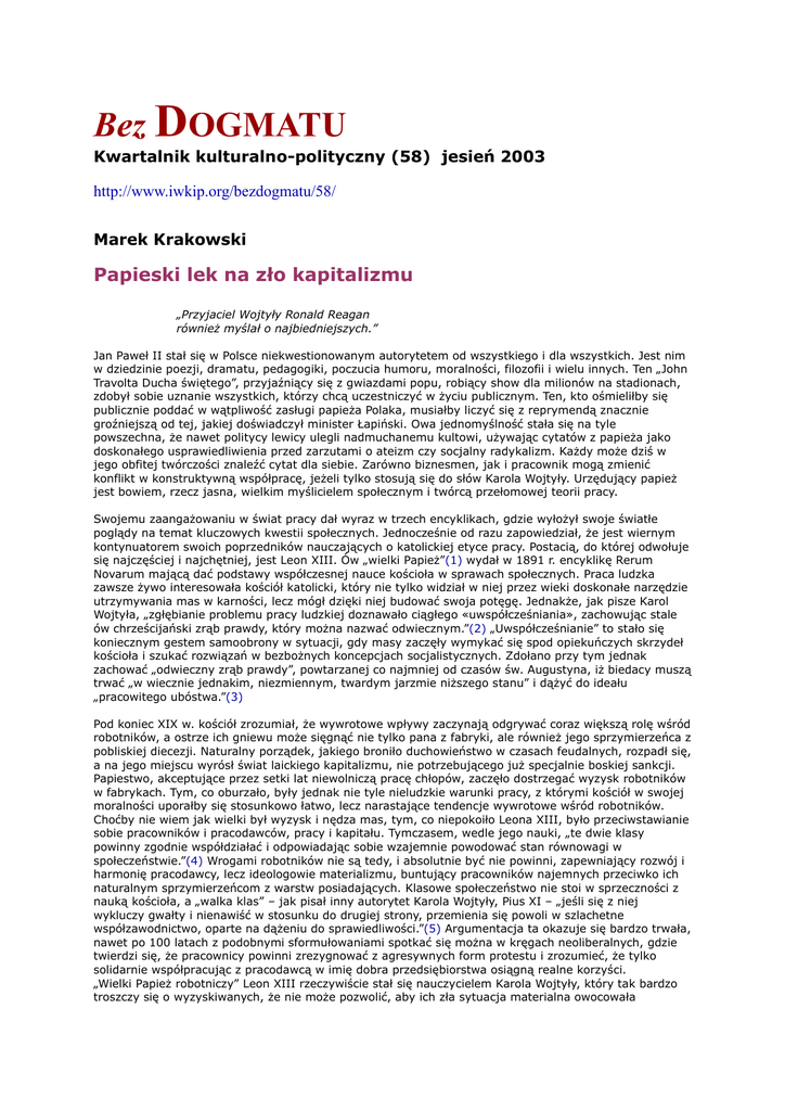 Bez DOGMATU Kwartalnik kulturalno-polityczny (58) jesień 2003 http://www.iwkip.org/bezdogmatu/58/ Marek Krakowski Papieski lek na zło kapitalizmu „Przyjaciel Wojtyły Ronald Reagan również myślał o najbiedniejszych.” Jan Paweł II stał się w Polsce niekwestionowanym autorytetem od wszystkiego i dla wszystkich. Jest nim w dziedzinie poezji, dramatu, pedagogiki, poczucia humoru, moralności, filozofii i wielu innych. Ten „John Travolta Ducha świętego”, przyjaźniący się z gwiazdami popu, robiący show dla milionów na stadionach, zdobył sobie uznanie wszystkich, którzy chcą uczestniczyć w życiu publicznym. Ten, kto ośmieliłby się publicznie poddać w wątpliwość zasługi papieża Polaka, musiałby liczyć się z reprymendą znacznie groźniejszą od tej, jakiej doświadczył minister Łapiński. Owa jednomyślność stała się na tyle powszechna, że nawet politycy lewicy ulegli nadmuchanemu kultowi, używając cytatów z papieża jako doskonałego usprawiedliwienia przed zarzutami o ateizm czy socjalny radykalizm. Każdy może dziś w jego obfitej twórczości znaleźć cytat dla siebie. Zarówno biznesmen, jak i pracownik mogą zmienić konflikt w konstruktywną współpracę, jeżeli tylko stosują się do słów Karola Wojtyły. Urzędujący papież jest bowiem, rzecz jasna, wielkim myślicielem społecznym i twórcą przełomowej teorii pracy. Swojemu zaangażowaniu w świat pracy dał wyraz w trzech encyklikach, gdzie wyłożył swoje światłe poglądy na temat kluczowych kwestii społecznych. Jednocześnie od razu zapowiedział, że jest wiernym kontynuatorem swoich poprzedników nauczających o katolickiej etyce pracy. Postacią, do której odwołuje się najczęściej i najchętniej, jest Leon XIII. Ów „wielki Papież”(1) wydał w 1891 r. encyklikę Rerum Novarum mającą dać podstawy współczesnej nauce kościoła w sprawach społecznych. Praca ludzka zawsze żywo interesowała kościół katolicki, który nie tylko widział w niej przez wieki doskonałe narzędzie utrzymywania mas w karności, lecz mógł dzięki niej budować swoja potęgę. Jednakże, jak pisze Karol Wojtyła, „zgłębianie problemu pracy ludzkiej doznawało ciągłego «uwspółcześniania», zachowując stale ów chrześcijański zrąb prawdy, który można nazwać odwiecznym.”(2) „Uwspółcześnianie” to stało się koniecznym gestem samoobrony w sytuacji, gdy masy zaczęły wymykać się spod opiekuńczych skrzydeł kościoła i szukać rozwiązań w bezbożnych koncepcjach socjalistycznych. Zdołano przy tym jednak zachować „odwieczny zrąb prawdy”, powtarzanej co najmniej od czasów św. Augustyna, iż biedacy muszą trwać „w wiecznie jednakim, niezmiennym, twardym jarzmie niższego stanu” i dążyć do ideału „pracowitego ubóstwa.”(3) Pod koniec XIX w. kościół zrozumiał, że wywrotowe wpływy zaczynają odgrywać coraz większą rolę wśród robotników, a ostrze ich gniewu może sięgnąć nie tylko pana z fabryki, ale również jego sprzymierzeńca z pobliskiej diecezji. Naturalny porządek, jakiego broniło duchowieństwo w czasach feudalnych, rozpadł się, a na jego miejscu wyrósł świat laickiego kapitalizmu, nie potrzebującego już specjalnie boskiej sankcji. Papiestwo, akceptujące przez setki lat niewolniczą pracę chłopów, zaczęło dostrzegać wyzysk robotników w fabrykach. Tym, co oburzało, były jednak nie tyle nieludzkie warunki pracy, z którymi kościół w swojej moralności uporałby się stosunkowo łatwo, lecz narastające tendencje wywrotowe wśród robotników. Choćby nie wiem jak wielki był wyzysk i nędza mas, tym, co niepokoiło Leona XIII, było przeciwstawianie sobie pracowników i pracodawców, pracy i kapitału. Tymczasem, wedle jego nauki, „te dwie klasy powinny zgodnie współdziałać i odpowiadając sobie wzajemnie powodować stan równowagi w społeczeństwie.”(4) Wrogami robotników nie są tedy, i absolutnie być nie powinni, zapewniający rozwój i harmonię pracodawcy, lecz ideologowie materializmu, buntujący pracowników najemnych przeciwko ich naturalnym sprzymierzeńcom z warstw posiadających. Klasowe społeczeństwo nie stoi w sprzeczności z nauką kościoła, a „walka klas” – jak pisał inny autorytet Karola Wojtyły, Pius XI – „jeśli się z niej wykluczy gwałty i nienawiść w stosunku do drugiej strony, przemienia się powoli w szlachetne współzawodnictwo, oparte na dążeniu do sprawiedliwości.”(5) Argumentacja ta okazuje się bardzo trwała, nawet po 100 latach z podobnymi sformułowaniami spotkać się można w kręgach neoliberalnych, gdzie twierdzi się, że pracownicy powinni zrezygnować z agresywnych form protestu i zrozumieć, że tylko solidarnie współpracując z pracodawcą w imię dobra przedsiębiorstwa osiągną realne korzyści. „Wielki Papież robotniczy” Leon XIII rzeczywiście stał się nauczycielem Karola Wojtyły, który tak bardzo troszczy się o wyzyskiwanych, że nie może pozwolić, aby ich zła sytuacja materialna owocowała grzechem nienawiści. Pisze: „nie można przeciwstawiać pracy kapitałowi, ani kapitału pracy, ani tym bardziej przeciwstawiać sobie konkretnych ludzi stojących za tymi pojęciami.”(6) Sentymentalna nauka obecnego papieża nie ma na celu zmiany porządku społecznego i jego podstawowych zasad. Pochlipując nad ciężkim losem robotnika, nie zapomina dodać, że jego największym wrogiem jest materializm: kierunek myślenia postrzegający ludzkość nie poprzez enigmatyczną „osobę”, lecz przez jej realne uczestnictwo w procesie historycznym, będącym wynikiem ekonomicznej i kulturowej działalności człowieka. Papież przystosowuje kościelne doktryny do zmieniających się warunków. Skoro nie da się przywrócić starych dobrych feudalnych czasów, kiedy każdy trzymał się przypisanego mu miejsca w hierarchii, trzeba oswoić kapitalizm dekorując go lukrowanymi koncepcjami „godności lu