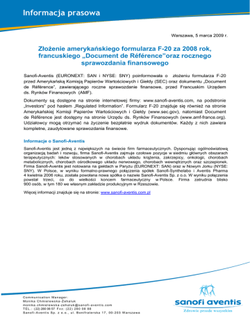 Informacja prasowa Warszawa, 5 marca 2009 r. Złożenie amerykańskiego formularza F-20 za 2008 rok, francuskiego „Document de Référence”oraz rocznego sprawozdania finansowego Sanofi-Aventis (EURONEXT: SAN i NYSE: SNY) poinformowała o złożeniu formularza F-20 przed Amerykańską Komisją Papierów Wartościowych i Giełdy (SEC) oraz dokumentu „Document de Référence”, zawierającego roczne sprawozdanie finansowe, przed Francuskim Urzędem ds. Rynków Finansowych (AMF). Dokumenty są dostępne na stronie internetowej firmy: www.sanofi-aventis.com, na podstronie „Investors” pod hasłem „Regulated Information”. Formularz F-20 znajduje się również na stronie Amerykańskiej Komisji Papierów Wartościowych i Giełdy (www.sec.gov), natomiast Document de Référence jest dostępny na stronie Urzędu ds. Rynków Finansowych (www.amf-france.org). Udziałowcy mogą otrzymać na życzenie bezpłatnie wydruk dokumentów. Każdy z nich zawiera kompletne, zaudytowane sprawozdania finansowe. Informacje o Sanofi-Aventis Sanofi-Aventis jest jedną z największych na świecie firm farmaceutycznych. Dysponując ogólnoświatową organizacją badań i rozwoju, firma Sanofi-Aventis zajmuje czołowe pozycje w siedmiu głównych obszarach terapeutycznych: leków stosowanych w chorobach układu krążenia, zakrzepicy, onkologii, chorobach metabolicznych, chorobach ośrodkowego układu nerwowego, chorobach wewnętrznych oraz szczepionek. Firma Sanofi-Aventis jest notowana na giełdach w Paryżu (EURONEXT: SAN) oraz w Nowym Jorku (NYSE: SNY). W Polsce, w wyniku formalno-prawnego połączenia spółek Sanofi-Synthelabo i Aventis Pharma 4 kwietnia 2006 roku, została powołana nowa spółka o nazwie Sanofi-Aventis Sp. z o.o. W wyniku połączenia powstał trzeci, co do wielkości koncern farmaceutyczny w Polsce. Firma zatrudnia blisko 900 osób, w tym 180 we własnym zakładzie produkcyjnym w Rzeszowie. Więcej informacji znajduje się na stronie: www.sanofi-aventis.com.pl Communication Manager: Monika Chmielewska-Żehaluk [email protected] T E L . : ( 22) 280 08 57 F A X : ( 2 2 ) 2 8 0 0 8 8 8 Sanofi-Aventis Sp. z o.o., ul. Bonifraterska 17, 00-203 Warszawa