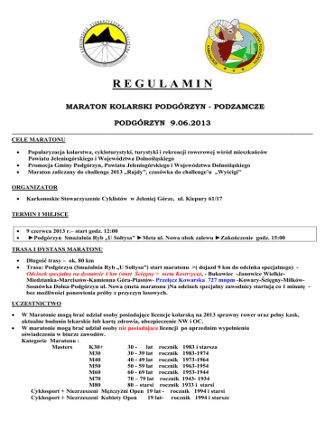 REGULAMIN MARATON KOLARSKI PODGÓRZYN - PODZAMCZE PODGÓRZYN 9.06.2013 ========================================================================================================================= CELE MARATONU Popularyzacja kolarstwa, cykloturystyki, turystyki i rekreacji rowerowej wśród mieszkańców Powiatu Jeleniogórskiego i Województwa Dolnośląskiego Promocja Gminy Podgórzyn, Powiatu Jeleniogórskiego i Województwa Dolnośląskiego Maraton zaliczany do challenge 2013 „Rajdy”, czasówka do challenge’u „Wyścigi” ORGANIZATOR Karkonoskie Stowarzyszenie Cyklistów w Jeleniej Górze, ul. Kiepury 61/17 TERMIN I MIEJSCE 9 czerwca 2013 r.– start godz. 12:00 ►Podgórzyn Smażalnia Ryb „U Sołtysa” ►Meta ul. Nowa obok zalewu ►Zakończenie godz. 15:00 TRASA I DYSTANS MARATONU Długość trasy – ok. 80 km Trasa: Podgórzyn (Smażalnia Ryb „U Sołtysa”) start maratonu >( dojazd 9 km do odcinka specjalnego) Odcinek specjalny na dystansie 4 km (start Ścięgny > meta Kostrzyca), - Bukowiec -Janowice WielkieMiedzianka-Marciszów-Kamienna Góra-Piastów- Przełęcz Kowarska 727 mnpm -Kowary-Ścięgny-MiłkówSosnówka Dolna-Podgórzyn ul. Nowa (meta maratonu )Na odcinek specjalny zawodnicy startują co 1 minutę bez możliwości ponowienia próby z przyczyn losowych. UCZESTNICTWO W Maratonie mogą brać udział osoby posiadające licencje kolarską na 2013 sprawny rower oraz pełny kask, aktualne badania lekarskie lub kartę zdrowia, ubezpieczenie NW i OC. W maratonie mogą brać udział osoby nie posiadające licencji po uprzednim wypełnieniu oświadczenia w biurze zawodów. Kategorie Maratonu : Masters K30+ 30 - lat rocznik 1983 i starsza M30 30 - 39 lat rocznik 1983-1974 M40 40 - 49 lat rocznik 1973-1964 M50 50 - 59 lat rocznik 1963-1954 M60 60 - 69 lat rocznik 1953-1944 M70 70 – 79 lat rocznik 1943- 1934 M80 80 – starsi rocznik 1933 i starsi Cyklosport + Niezrzeszeni Mężczyźni Open 19 lat - rocznik 1994 i starsi Cyklosport + Niezrzeszeni Kobiety Open 19 lat- rocznik 1994 i starsze -2SPOSÓB PRZEPROWADZENIA Każdy uczestnik bierze udział w Maratonie na własną odpowiedzialność. Maraton odbędzie się przy otwartym ruchu drogowym, w grupach po 15 kolarzy, w odstępach pięciominutowych. Zwycięzcą maratonu zostanie zawodnik, który osiągnie najlepszy czas na odcinku specjalnym i przejedzie trasę maratonu Uczestników obowiązują bezwzględnie przepisy ruchu drogowego !!! FINANSOWANIE Koszty organizacyjne Maratonu pokrywają organizatorzy. Koszty dojazdu, noclegów, zakwaterowania i wpisowego pokrywają uczestnicy lub jednostki delegujące. Opłata startowa zgodnie z przepisami PZKol W ramach startowego organizatorzy zapewniają: nagrody rzeczowe, dyplomy, zabezpieczenie medyczne, organizacyjne i sędziowskie. NAGRODY najlepsi uczestnicy Maratonu w poszczególnych kategoriach wiekowych otrzymają: w każdej kategorii I -III m-ca nagrody rzeczowe , I - VI m-ca dyplomy. ZGŁOSZENIA – BIURO ZAWODÓW * Biuro zawodów Podgórzyn Smażalnia Ryb „U Sołtysa” w dniu 09 czerwca 2013 r. w godz. 10.30 –11:30 * Odprawa techniczna godz. 11.45 POSTANOWIENIA KOŃCOWE Organizatorzy nie ponoszą odpowiedzialności za szkody wyrządzone osobom trzecim przez uczestników zawodów. Organizator nie odpowiada za rzeczy zaginione lub skradzione. W kwestiach spornych oraz nie objętych regulaminem, decyduje organizator oraz sędzia główny. Komisję sędziowską powoła DZKol Wrocław w porozumieniu z organizatorem Sędzia Główny – Wiesław Kucab z Jeleniej Góry tel. 607 495 737 e-mail [email protected] Organizatorzy zastrzegają sobie prawo do zmian w niniejszym regulaminie !!! • ADRES SZPITALA: Jelenia Góra ul. Ogińskiego 6, tel. 75 - 75 - 37 - 100 lub 75 - 75 - 37 - 118, 119 Organizator Regulamin zatwierdzono dn. 12.05.2013. DZKol Wrocław: Z. Jaszowski