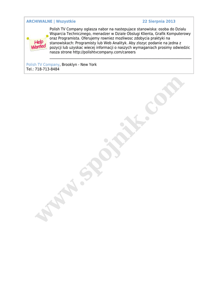 ARCHIWALNE | Wszystkie 22 Sierpnia 2013 Polish TV Company oglasza nabor na nastepujace stanowiska: osoba do Dzialu Wsparcia Technicznego, menadzer w Dziale Obslugi Klienta, Grafik Komputerowy oraz Programista. Oferujemy rowniez mozliwosc zdobycia praktyki na stanowiskach: Programisty lub Web Analityk. Aby zlozyc podanie na jedna z pozycji lub uzyskac wiecej informacji o naszych wymaganiach prosimy odwiedzic nasza strone http://polishtvcompany.com/careers __________________________________________________________________________________ w w w .s po jn ik .c o m Polish TV Company, Brooklyn - New York Tel.: 718-713-8484