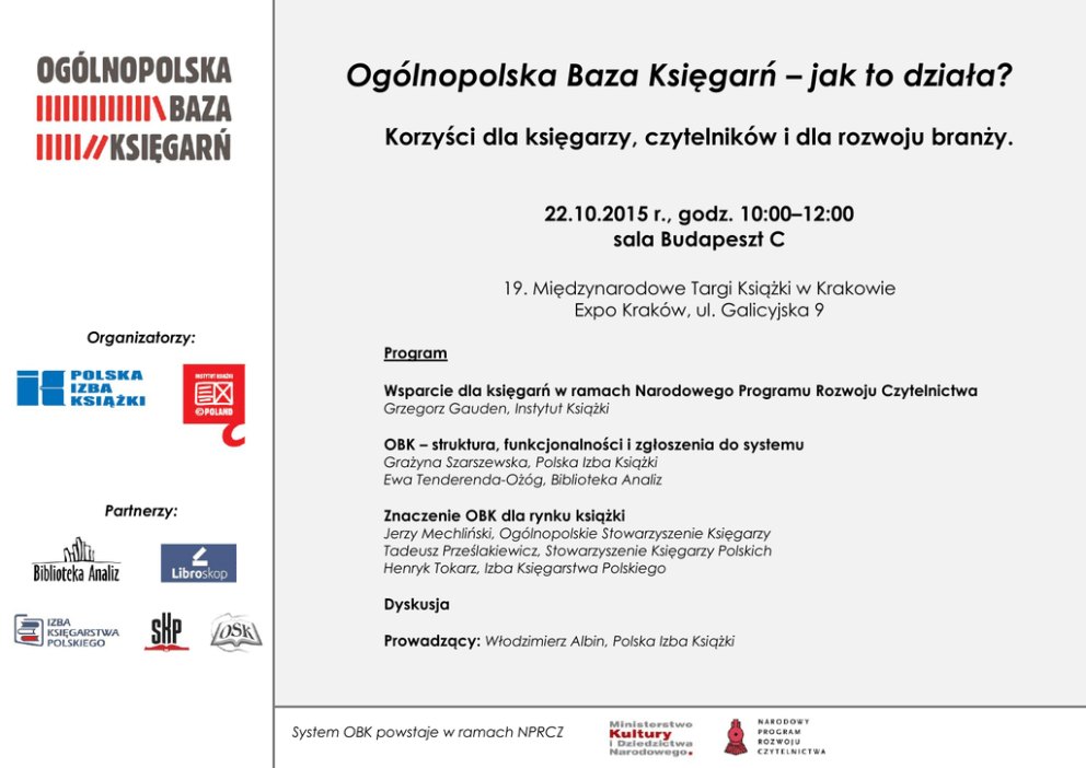 Ogólnopolska Baza Księgarń – jak to działa? Korzyści dla księgarzy, czytelników i dla rozwoju branży. 22.10.2015 r., godz. 10:00–12:00 sala Budapeszt C 19. Międzynarodowe Targi Książki w Krakowie Expo Kraków, ul. Galicyjska 9 Organizatorzy: Program Wsparcie dla księgarń w ramach Narodowego Programu Rozwoju Czytelnictwa Grzegorz Gauden, Instytut Książki OBK – struktura, funkcjonalności i zgłoszenia do systemu Grażyna Szarszewska, Polska Izba Książki Ewa Tenderenda-Ożóg, Biblioteka Analiz Partnerzy: Znaczenie OBK dla rynku książki Jerzy Mechliński, Ogólnopolskie Stowarzyszenie Księgarzy Tadeusz Prześlakiewicz, Stowarzyszenie Księgarzy Polskich Henryk Tokarz, Izba Księgarstwa Polskiego Dyskusja Prowadzący: Włodzimierz Albin, Polska Izba Książki System OBK powstaje w ramach NPRCZ