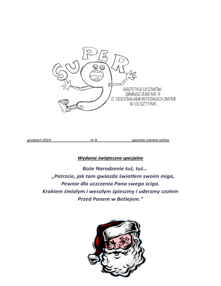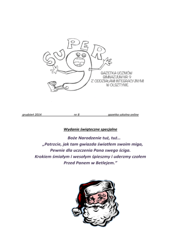 grudzień 2014 nr 8 gazetka szkolna online Wydanie świąteczne specjalne Boże Narodzenie tuż, tuż… „Patrzcie, jak tam gwiazda światłem swoim miga, Pewnie dla uczczenia Pana swego ściga. Krokiem śmiałym i wesołym śpieszmy i uderzmy czołem Przed Panem w Betlejem.” Na Wigilię, czeka chyba każdy. W tym magicznym dniu, spotykamy się z rodziną. Czekamy aż na niebie zaświeci pierwsza gwiazdka, na pamiątkę Gwiazdy Betlejemskiej, która prowadziła Trzech Króli do stajenki. Dzielimy się opłatkiem, zasiadamy przy stole, śpiewamy kolędy i czekamy na Świętego Mikołaja, który przyniesie nam prezenty. Trochę historii o świętach: Wigilię obchodzimy wieczorem 24 grudnia. O północy, idziemy do kościoła na Pasterkę, która upamiętnia oczekiwanie i modlitwę pasterzy, zmierzających do Betlejem. Rozpoczyna ona Boże Narodzenie - 25 grudnia. Zaś 26 grudnia, obchodzimy Drugi Dzień Świąt. Owe 3 dni, są dniami prawnie, wolnymi od pracy. Tradycje Świąt Bożego Narodzenia -DZIELNIE SIE OPLATKIEM Najważniejszym i najbardziej wzruszającym momentem było i jest dzielenie się poświęconym opłatkiem. Nazwa "opłatek" pochodzi od łacińskiego słowa "oblatum", czyli dar ofiarny. Praktyka pieczenia chleba przaśnego, niekwaszonego, takiego, jakiego używał Pan Jezus przy Ostatniej Wieczerzy, pochodziła z czasów biblijnych, od Mojżesza i zachowała się w Kościele do dziś, choć obecnie ten chleb ma inny wygląd, jest bielszy, cieńszy i delikatniejszy. Opłatki, jakie my dziś znamy (nebula - mgiełka) pierwsi zaczęli wypiekać zakonnicy z klasztoru benedyktyńskiego we Francji. Stamtąd zwyczaj ten rozpowszechnił się na całą Europę i wraz z chrześcijaństwem przybył także do Polski. -KOLĘDA Nierozłącznym elementem Świąt Bożego Narodzenia jest kolęda. Nazwa kolęda pojawiła się dawno temu. Wywodzi się ona od słowa "calendae", tak bowiem Rzymianie nazywali początek każdego miesiąca. Owe „kalendy”, szczególnie styczniowe, czyli noworoczne, obchodzili bardzo radośnie, bawili się, śpiewali, składali sobie życzenia i obdarowywali prezentami. Kościół katolicki zniósł stary, pogański zwyczaj obchodzenia „kalend”, zachowała się jednak tradycja śpiewania pobożnych pieśni, sławiących narodziny Chrystusa, odwiedzania się w domach, kupowania świątecznych podarunków. W ten sposób do języka naszych dziadków weszło łacińskie słowo "calendae”, czyli kolęda. -Wierzono, że o północy zwierzęta rozmawiają ludzkim językiem, lecz podsłuchanie takiej rozmowy nie przynosiło szczęścia. Powszechnym obyczajem jest kładzenie siana pod obrus, którym nakryto stół wigilijny. -CHOINKA Na wigilie Bożego Narodzenia niemal każda polska rodzina umieszcza w swoim mieszkaniu i dekoruje choinkę. Jest to jedna z najmłodszych tradycji wigilijnych. Choinka w obecnej formie przyjęła się w Polsce dopiero w XVIII w. i zwyczaj ten przeniósł się z Niemiec. Opisuje to m.in. Zygmunt Gloger w "Encyklopedii Staropolskiej": „Za czasów pruskich, tj. w latach 1795-1806, przyjęto od Niemców zwyczaj w Wigilie Bożego Narodzenia ubierania dla dzieci sosenki lub jodełki.” Kościół był początkowo niechętny temu zwyczajowi, lecz szybko nadał choince chrześcijańską symbolikę "biblijnego drzewa, wiadomości dobra i zła", przy którym rozpoczęła się historia ludzkości. Na choince nie może zabraknąć jabłek, bo właśnie te owoce były na biblijnym drzewie, a ponadto jabłko symbolizuje zdrowie. Wśród iglastych gałązek wiją się łańcuchy, lekkie, słomkowe i bibułkowe, są pamiątka po wężu-kusicielu. Gwiazda na szczycie drzewka symbolizuje gwiazdę betlejemską, która wiodła Trzech Króli do Dzieciatka Jezus. -ŚWIĘTY MIKOŁAJ Uwielbiają go wszyscy - dorośli i dzieci, bogaci i biedni, mieszkańcy dużych miast i małych miasteczek. Wieść głosi, iż urodził się na przełomie wieków III i IV w Turcji. Krąży o nim wiele legend. Niegdyś był patronem żeglarzy i wędrownych kupców (urodził się w rodzinie bogatych kupców). Chronił ich od niebezpieczeństw podróży i zapewniał powodzenie w handlu. Patronował też wielkim przedświątecznym jarmarkom. Urodzeni 6 grudnia chłopcy dostawali imię - Mikołaj. Niektóre miasta uczyniły go swoim patronem: Nowy Jork, Amsterdam. Za opiekuna obrali go również uczeni, pasterze, bankierzy, a nawet więźniowie. Święty Mikołaj ukończył seminarium duchowne i przez wiele lat był biskupem Miry, portowego miasteczka w Azji Mniejszej. Był człowiekiem wielkiego serca, pomagał biednym i potrzebującym. Rozdał cały swój majątek ubogim. Prawdopodobnie czynił też cuda. W Polsce czekamy na niego 6 grudnia oraz w wigilię Bożego Narodzenia. Ubrany jest w czerwony płaszcz, a na plecach dźwiga ogromny wór z prezentami, ma także piękną, długą i białą brodę. Jeszcze nie tak dawno do polskich dzieci przychodził w asyście anioła i diabła. Anioł rozdawał grzecznym maluchom słodycze, a niegrzecznym diabeł wręczał rózgi. Tym optymistycznym i świątecznym akcentem, chcielibyśmy życzyć Wam: Zdrowych, wesołych i śnieżnych Świąt Bożego Narodzenia. Jest to nasz ostatni numer w roku 2014. Dziękujemy Wam, że czytaliście naszą gazetkę i byliście z nami. Mamy nadzieję, że w przyszłym roku znów się zobaczymy. WESOŁYCH ŚWIĄT! 77 sprawdzonych pomysłów na prezenty pod choinkę Do świąt Bożego narodzenia mamy jeszcze sporo czasu, ale aby obdarować bliskich naprawdę pięknymi i trafionymi prezentami pod choinkę, warto pomyśleć o nich już teraz. Zdecydowanie mniejszy ruch w sklepach, niższe ceny i większy wybór towarów - czego chcieć więcej? Poniżej znajdziesz listę tradycyjnych i innowacyjnych pomysłów gwiazdkowych. Wybierając prezenty dla bliskich, warto zwrócić uwagę na potrzebę kolekcjonowania wspomnień i wrażeń, a nie przedmiotów. Cena nie jest najważniejsza, staraliśmy się prz