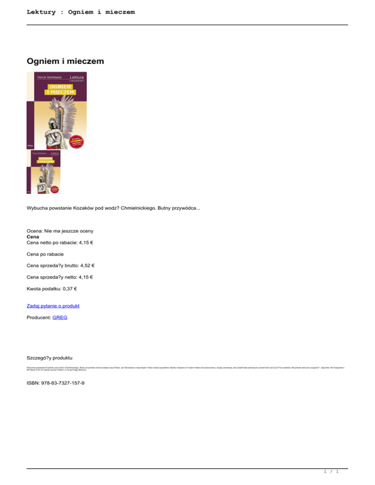Lektury : Ogniem i mieczem Ogniem i mieczem Wybucha powstanie Kozaków pod wodz? Chmielnickiego. Butny przywódca... Ocena: Nie ma jeszcze oceny Cena Cena netto po rabacie: 4,15 € Cena po rabacie Cena sprzeda?y brutto: 4,52 € Cena sprzeda?y netto: 4,15 € Kwota podatku: 0,37 € Zadaj pytanie o produkt Producent: GREG Szczegó?y produktu Wybucha powstanie Kozaków pod wodz? Chmielnickiego. Butny przywódca odnosi kolejne zwyci?stwa. Jan Skrzetuski z niepokojem ?ledzi rozwój wypadków. Bardzo niepokoi si? losem Heleny Kurcewiczówny, swojej ukochanej, ale przedk?ada patriotyczny obowi?zek nad szcz??cie osobiste. Ma jednak wiernych przyjació? - Zag?oba, Wo?odyjowski i Rz?dzian b?d? si? starali wyrwa? Helen? z r?k gro?nego Bohuna. ISBN: 978-83-7327-157-9 1 / 1 Powered by TCPDF (www.tcpdf.org)