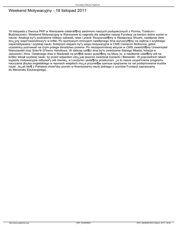 Foundation Effectus Papilionis Weekend Motywacyjny - 18 listopad 2011 18 listopada z Dworca PKP w Warszawie odebrali¶my siedmioro naszych podopiecznych z Pcimia, Trzebuni i Budzieszowic. Weekend Motywacyjny w Warszawie to nagroda dla adeptów naszej Fundacji za bardzo dobre wyniki w nauce. Atrakcje by³y podzielone miêdzy zabawê, relax i pracê: Rozpoczeli¶my w Restauracji Shushi, nastêpnie dwie dru¿yny wspó³zawodniczy³y w krêle. Po sportowych emocjach nastêpnego dnia wyruszyli¶my na zajêcia z szybkiego zapamiêtywania i szybkiej nauki. Kolejnym etapem by³y sesja motywacyjna w CMS Cameron McKenna, gdzie uczestnicy poznawali na czym polega doradztwo prawne. Po niezapomnianej wizycie w CMS zwiedzili¶my Uniwersytet Warszawski oraz Szko³ê G³ówn± Handlow±. W dalszej czê¶ci dnia by³o zwiedzanie Starego Miasta, kolacja w Jazzowini i Kino. Ostatniego dnia w Niedzielê na pro¶bê dzieci poszli¶my na Mszy ¦w. a nastêpnie udali¶my siê na krótk± lekcjê szybkiej nauki, by przed odjazdem zd±¿yæ jeszcze zwiedziæ £azienki i Belweder. W poprzednich latach wyjazdy motywacyjne odbywa³y siê równie¿ w Londynie i jeste¶my przekonani, ¿e to nasze uzupe³nienie programu nauczania jêzyka angielskiego w rejonach wiejskich mo¿e przynie¶æ szersze spojrzenie na cel podejmowania trudów nauki. Je¿eli kto¶ z Pañstwa chcia³oby pomóc w finansowaniu nauki jednego z uczniów Fundacji zapraszamy do Mecenatu Edukacyjnego . http://www.papilionis.org _PDF_POWERED _PDF_GENERATED 8 March, 2017, 16:46