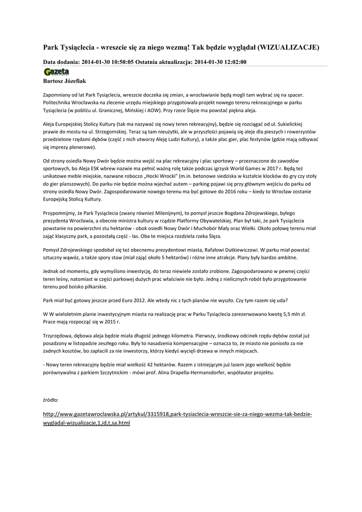 Park Tysiąclecia - wreszcie się za niego wezmą! Tak będzie wyglądał (WIZUALIZACJE) Data dodania: 2014-01-30 10:50:05 Ostatnia aktualizacja: 2014-01-30 12:02:00 Bartosz Józefiak Zapomniany od lat Park Tysiąclecia, wreszcie doczeka się zmian, a wrocławianie będą mogli tam wybrać się na spacer. Politechnika Wrocławska na zlecenie urzędu miejskiego przygotowała projekt nowego terenu rekreacyjnego w parku Tysiąclecia (w pobliżu ul. Granicznej, Mińskiej i AOW). Przy rzece Ślęzie ma powstać piękna aleja. Aleja Europejskiej Stolicy Kultury (tak ma nazywać się nowy teren rekreacyjny), będzie się rozciągać od ul. Sukielickiej prawie do mostu na ul. Strzegomskiej. Teraz są tam nieużytki, ale w przyszłości pojawią się aleje dla pieszych i rowerzystów przedzielone rzędami dębów (część z nich utworzy Aleję Ludzi Kultury), a także plac gier, plac festynów (gdzie mają odbywać się imprezy plenerowe). Od strony osiedla Nowy Dwór będzie można wejść na plac rekreacyjny i plac sportowy – przeznaczone do zawodów sportowych, bo Aleja ESK wbrew nazwie ma pełnić ważną rolę także podczas igrzysk World Games w 2017 r. Będą też unikatowe meble miejskie, nazwane roboczo „Hocki Wrocki” (m.in. betonowe siedziska w kształcie klocków do gry czy stoły do gier planszowych). Do parku nie będzie można wjechać autem – parking pojawi się przy głównym wejściu do parku od strony osiedla Nowy Dwór. Zagospodarowanie nowego terenu ma być gotowe do 2016 roku – kiedy to Wrocław zostanie Europejską Stolicą Kultury. Przypomnijmy, że Park Tysiąclecia (zwany również Milenijnym), to pomysł jeszcze Bogdana Zdrojewskiego, byłego prezydenta Wrocławia, a obecnie ministra kultury w rządzie Platformy Obywatelskiej. Plan był taki, że park Tysiąclecia powstanie na powierzchni stu hektarów - obok osiedli Nowy Dwór i Muchobór Mały oraz Wielki. Około połowę terenu miał zająć klasyczny park, a pozostałą część - las. Oba te miejsca rozdziela rzeka Ślęza. Pomysł Zdrojewskiego spodobał się też obecnemu prezydentowi miasta, Rafałowi Dutkiewiczowi. W parku miał powstać sztuczny wąwóz, a także spory staw (miał zająć około 5 hektarów) i różne inne atrakcje. Plany były bardzo ambitne. Jednak od momentu, gdy wymyślono inwestycję, do teraz niewiele zostało zrobione. Zagospodarowano w pewnej części teren leśny, natomiast w części parkowej dużych prac właściwie nie było. Jedną z nielicznych robót było przygotowanie terenu pod boisko piłkarskie. Park miał być gotowy jeszcze przed Euro 2012. Ale wtedy nic z tych planów nie wyszło. Czy tym razem się uda? W W wieloletnim planie inwestycyjnym miasta na realizację prac w Parku Tysiąclecia zarezerwowano kwotę 5,5 mln zł. Prace mają rozpocząć się w 2015 r. Trzyrzędowa, dębowa aleja będzie miała długość jednego kilometra. Pierwszy, środkowy odcinek rzędu dębów został już posadzony w listopadzie zeszłego roku. Były to nasadzenia kompensacyjne – oznacza to, że miasto nie poniosło za nie żadnych kosztów, bo zapłacili za nie inwestorzy, którzy kiedyś wycięli drzewa w innych miejscach. - Nowy teren rekreacyjny będzie miał wielkość 42 hektarów. Razem z istniejącym już lasem jego wielkość będzie porównywalna z parkiem Szczytnickim - mówi prof. Alina Drapella-Hermansdorfer, współautor projektu. źródło: http://www.gazetawroclawska.pl/artykul/3315918,park-tysiaclecia-wreszcie-sie-za-niego-wezma-tak-bedziewygladal-wizualizacje,1,id,t,sa.html