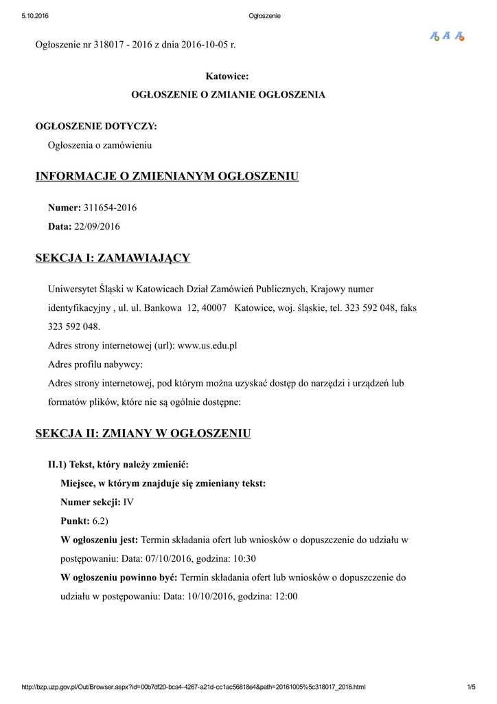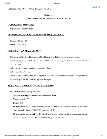 5.10.2016 Ogłoszenie Ogłoszenie nr 318017 2016 z dnia 20161005 r. Katowice: OGŁOSZENIE O ZMIANIE OGŁOSZENIA OGŁOSZENIE DOTYCZY: Ogłoszenia o zamówieniu INFORMACJE O ZMIENIANYM OGŁOSZENIU Numer: 3116542016 Data: 22/09/2016 SEKCJA I: ZAMAWIAJĄCY Uniwersytet Śląski w Katowicach Dział Zamówień Publicznych, Krajowy numer identyfikacyjny , ul. ul. Bankowa 12, 40007 Katowice, woj. śląskie, tel. 323 592 048, faks 323 592 048. Adres strony internetowej (url): www.us.edu.pl Adres profilu nabywcy: Adres strony internetowej, pod którym można uzyskać dostęp do narzędzi i urządzeń lub formatów plików, które nie są ogólnie dostępne: SEKCJA II: ZMIANY W OGŁOSZENIU II.1) Tekst, który należy zmienić: Miejsce, w którym znajduje się zmieniany tekst: Numer sekcji: IV Punkt: 6.2) W ogłoszeniu jest: Termin składania ofert lub wniosków o dopuszczenie do udziału w postępowaniu: Data: 07/10/2016, godzina: 10:30 W ogłoszeniu powinno być: Termin składania ofert lub wniosków o dopuszczenie do udziału w postępowaniu: Data: 10/10/2016, godzina: 12:00 http://bzp.uzp.gov.pl/Out/Browser.aspx?id=00b7df20bca44267a21dcc1ac56818e4&path=20161005%5c318017_2016.html 1/5 5.10.2016 Ogłoszenie http://bzp.uzp.gov.pl/Out/Browser.aspx?id=00b7df20bca44267a21dcc1ac56818e4&path=20161005%5c318017_2016.html 2/5 5.10.2016 Ogłoszenie http://bzp.uzp.gov.pl/Out/Browser.aspx?id=00b7df20bca44267a21dcc1ac56818e4&path=20161005%5c318017_2016.html 3/5 5.10.2016 Ogłoszenie http://bzp.uzp.gov.pl/Out/Browser.aspx?id=00b7df20bca44267a21dcc1ac56818e4&path=20161005%5c318017_2016.html 4/5 5.10.2016 Ogłoszenie Zamknij http://bzp.uzp.gov.pl/Out/Browser.aspx?id=00b7df20bca44267a21dcc1ac56818e4&path=20161005%5c318017_2016.html 5/5