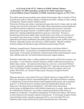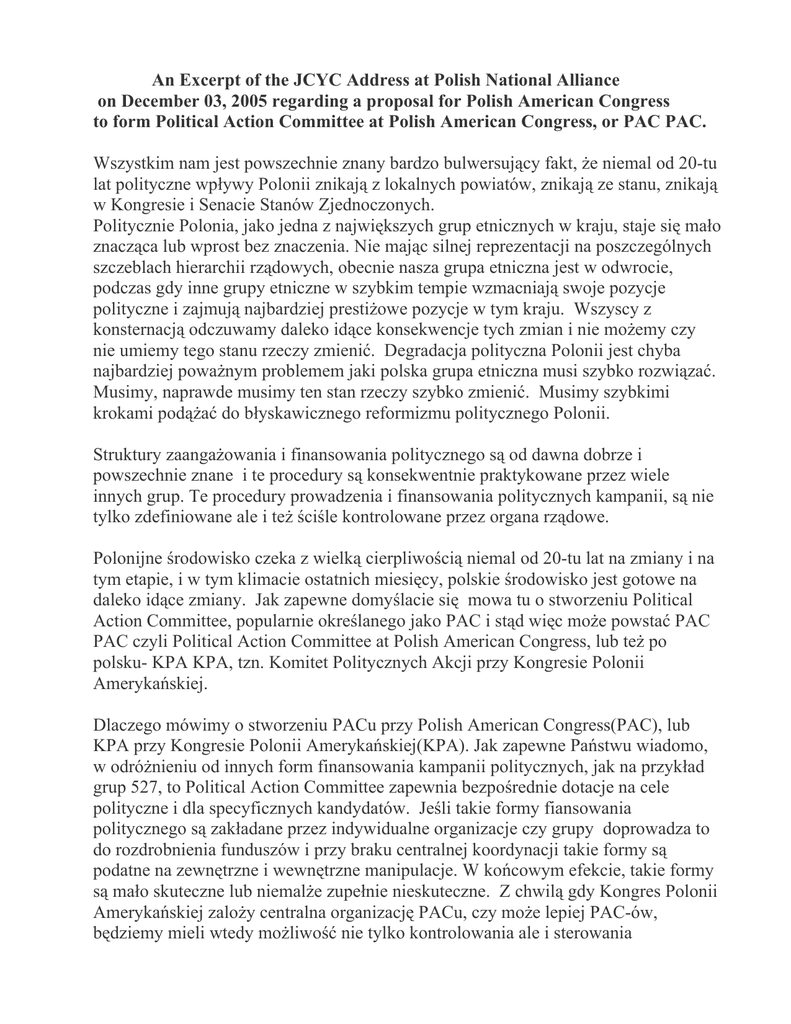 An Excerpt of the JCYC Address at Polish National Alliance on December 03, 2005 regarding a proposal for Polish American Congress to form Political Action Committee at Polish American Congress, or PAC PAC. Wszystkim nam jest powszechnie znany bardzo bulwersujący fakt, że niemal od 20-tu lat polityczne wpływy Polonii znikają z lokalnych powiatów, znikają ze stanu, znikają w Kongresie i Senacie Stanów Zjednoczonych. Politycznie Polonia, jako jedna z największych grup etnicznych w kraju, staje się mało znacząca lub wprost bez znaczenia. Nie mając silnej reprezentacji na poszczególnych szczeblach hierarchii rządowych, obecnie nasza grupa etniczna jest w odwrocie, podczas gdy inne grupy etniczne w szybkim tempie wzmacniają swoje pozycje polityczne i zajmują najbardziej prestiżowe pozycje w tym kraju. Wszyscy z konsternacją odczuwamy daleko idące konsekwencje tych zmian i nie możemy czy nie umiemy tego stanu rzeczy zmienić. Degradacja polityczna Polonii jest chyba najbardziej poważnym problemem jaki polska grupa etniczna musi szybko rozwiązać. Musimy, naprawde musimy ten stan rzeczy szybko zmienić. Musimy szybkimi krokami podążać do błyskawicznego reformizmu politycznego Polonii. Struktury zaangażowania i finansowania politycznego są od dawna dobrze i powszechnie znane i te procedury są konsekwentnie praktykowane przez wiele innych grup. Te procedury prowadzenia i finansowania politycznych kampanii, są nie tylko zdefiniowane ale i też ściśle kontrolowane przez organa rządowe. Polonijne środowisko czeka z wielką cierpliwością niemal od 20-tu lat na zmiany i na tym etapie, i w tym klimacie ostatnich miesięcy, polskie środowisko jest gotowe na daleko idące zmiany. Jak zapewne domyślacie się mowa tu o stworzeniu Political Action Committee, popularnie określanego jako PAC i stąd więc może powstać PAC PAC czyli Political Action Committee at Polish American Congress, lub też po polsku- KPA KPA, tzn. Komitet Politycznych Akcji przy Kongresie Polonii Amerykańskiej. Dlaczego mówimy o stworzeniu PACu przy Polish American Congress(PAC), lub KPA przy Kongresie Polonii Amerykańskiej(KPA). Jak zapewne Państwu wiadomo, w odróżnieniu od innych form finansowania kampanii politycznych, jak na przykład grup 527, to Political Action Committee zapewnia bezpośrednie dotacje na cele polityczne i dla specyficznych kandydatów. Jeśli takie formy fiansowania politycznego są zakładane przez indywidualne organizacje czy grupy doprowadza to do rozdrobnienia funduszów i przy braku centralnej koordynacji takie formy są podatne na zewnętrzne i wewnętrzne manipulacje. W końcowym efekcie, takie formy są mało skuteczne lub niemalże zupełnie nieskuteczne. Z chwilą gdy Kongres Polonii Amerykańskiej zaloży centralna organizację PACu, czy może lepiej PAC-ów, będziemy mieli wtedy możliwość nie tylko kontrolowania ale i sterowania finansowego głęboko posuniętych i przemyślanych akcji politycznych dotyczących naszego środowiska. Kongres Polonii Amerykańskiej jest jedyną polonijną organizacją, która ma mocno rozbudowaną sieć organizacyjną niemalże w całych Stanach Zjednoczonych. KPA i ZNP to dwie bratnie organizacje, które slużą całej Polonii i które są jej wspólnym ogniwem. Stworzenie PAC-ów pod egida KPA jest jedyną szansą dla Polonii aby wykorzystać w szybkim tempie nasz wlasny potencjał polityczny przez lansowanie i finansowanie polityków polskiego pochodzenia czy też popierania polityków przychylnych polskiemu środowisku. Aby osiągnać ten cel, musimy przyjąć prostą zasadę, którą można by wyrazić tak: Wszyskie pieniądze idą do jednej puli, Wszystkie pieniądze idą do Prezesa Spuli. Na pewno wielu może nie lubić tej lekko brzmiącej maximy, ale bez wspólnego i skoordynowanego działania, niestety pozostaniemy na marginesie życia politycznego i ekonomicznego w tym kraju. Po prostu, nie mamy innego wyboru, jeśli mamy ambicje i aspiracje jako grupa etniczna aby podnieść swój status w tym kraju. Żeby KPA mogło podjąć się takiego przedsięwzięcia, to zależy to nie tylko od KPA, ale przede wszystkim od Nas Wszystkich. Zależy to przede wszystkim od istniejących Organizacji Polonijnych, które muszą, muszą być prekursorami tego procesu. Istniejące Organizacje Polonijne mogą w szybkim tempie pod egidą KPA finansować centralny organ PACu, czy PAC-ów. Zapewne niektórzy zapytają, a co my będziemy z tego mieć? Odpowiem tak, że jeśli dołożymy starań żeby ten proces finasowania PAC PACu zaczął się od dziś, to jeśli za kilka lat któryś z uczestnków dzisiejszego “Konkursu Konradowskiego” zadecyduje o karierze politycznej, to ten kandydat może liczyć na fundusze konieczne do prowadzenia całej kampanii wyborczej. I to jest właśnie sedno sprawy, żeby PAC PAC mógł finasować CAŁOŚĆ kamapanii wyborczej a nie liczyć na drobne dotacje od często skłóconych ze sobą i mało znaczących PAC-ów. Należy też oczekiwać, że przy takim stanie rzeczy, będzie też dużo większe zainteresowanie karierami politycznymi w środowisku naszej Polonii. Po tej długiej litanii i żeby nie być gołosłownym, Joseph Conrad Yacht Club(JCYC) pragnie jako pierwsza organizacja polonijna zadeklarować gotowość sponsorowania PAC PACu, przekazując na tej cel 1,285 dolarów. Mimo, że KPA nie ma obecnie założonych i odpowienio zarejestrowanych struktur PACu, co jest, jak powiedziałem, wymagane i kontolowane przez organa rządowe, to jednak, jest to dla naszego Klubu spawa najwyższej wagi, żeby zaczać budować podwaliny funduszu na ten cel, i to właśnie od dziś. Administracja oraz członkowie JCYC pragną aby ta skromna suma 1,285-ciu dolarów stała się kamieniem węgielnym pod: “WIELKĄ RZECZ, POSPOLITĄ RZECZ” a więc: “(Nie Bójmy Się!), Wstańmy Razem i Chodźmy Razem, Chodźmy Szybciej!” W tym miescju pragnę poprosić Skarbnika JCYC, kolegę Antoniego Czuprynę, o