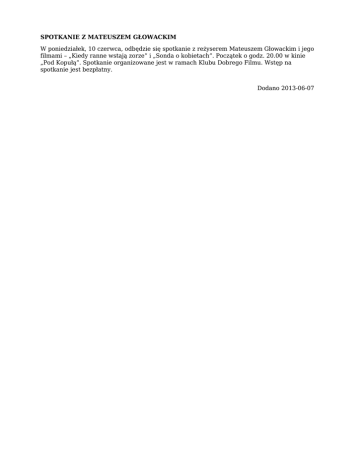 SPOTKANIE Z MATEUSZEM GŁOWACKIM W poniedziałek, 10 czerwca, odbędzie się spotkanie z reżyserem Mateuszem Głowackim i jego filmami – „Kiedy ranne wstają zorze” i „Sonda o kobietach”. Początek o godz. 20.00 w kinie „Pod Kopułą”. Spotkanie organizowane jest w ramach Klubu Dobrego Filmu. Wstęp na spotkanie jest bezpłatny. Dodano 2013-06-07