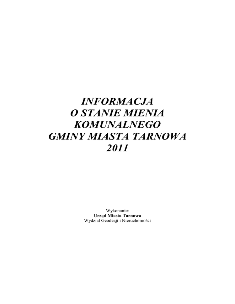 INFORMACJA O STANIE MIENIA KOMUNALNEGO GMINY MIASTA TARNOWA 2011 Wykonanie: Urząd Miasta Tarnowa Wydział Geodezji i Nieruchomości 1. Stan mienia komunalnego na dzień 31.12.2010 r. Ogólna wartość majątku Gminy Miasta Tarnowa na dzień 31.12.2010 r. wynosiła: 953 160 555,28 zł 2. Stan mienia komunalnego na dzień 31.12.2011 r. Ogólna wartość majątku Gminy Miasta przekroczyła kwotę 1 miliarda złotych i wynosi: Tarnowa na dzień 31.12.2011 r. 1 047 867 625,64 zł co stanowi wzrost o 10 % w stosunku do poprzedniego okresu. Mieniem komunalnym według ustawy o samorządzie gminnym 1 „jest własność i inne prawa majątkowe należące do poszczególnych gmin i ich związków oraz mienie innych komunalnych osób prawnych, w tym przedsiębiorstw”. Na mienie Gminy Miasta Tarnowa składają się: majątek jednostek i zakładów budżetowych, majątek szkół podstawowych i ponadpodstawowych, majątek przedszkoli, majątek instytucji kultury, udziały i akcje Gminy w spółkach, grunty stanowiące własność Gminy, zarówno te będące przedmiotem użytkowania wieczystego, użytkowania, trwałego zarządu jak i te które, pozostają w zasobie i są oddane w dzierżawę, najem i użyczenie, bądź są przygotowywane do zagospodarowania, budynki i budowle, urządzenia, środki transportu i pozostałe składniki majątku trwałego. 1 Ustawa z dnia 8 marca 1990 r. o samorządzie gminnym ( Jednolity tekst Dz. U. 01.142.1591 ) 2 Mienie komunalne 2011 Wielkość poszczególnych składników mienia przedstawia się następująco: 2.1 Mienie rozdysponowane: 2.1.1 Jednostki i zakłady budżetowe (z wyłączeniem szkół i przedszkoli) 393 227 357,31 zł. 2.1.2 Szkoły podstawowe 27 411 482,67 zł. 2.1.3 Szkoły ponadpodstawowe 92 872 613,09 zł. 2.1.4 Przedszkola 19 939 789,20 zł. 2.1.5 Instytucje kultury 10 656 319,57 zł. 2.1.6 Udziały w Spółkach Gminy 139 274 602,00 zł. 2.1.7 Udziały i akcje Gminy w innych spółkach 27 883 648,00 zł 2.2 Mienie nierozdysponowane: 2.2.1 Budynki pozostające w zasobie i budynki administrowane przez MZB Sp. z o. o.: 136 183 188,06 zł 2.2.2 Inne środki trwałe i pozostałe środki trwałe ( sieci i inne urządzenia) 56 683 226,72 zł 2.3 Grunty o wartości 143 780 399,02 zł 3 Mienie komunalne 2011 3. Zmiany w stanie mienia komunalnego w okresie od 31.12.2010 do 31.12.2011. Przez cały okres objęty niniejszą informacją, dokonywano zakupów, uzupełniano zasób nieruchomości stanowiących własność Gminy, mających na celu podnoszenie efektywności działania jednostek gminy, spółek komunalnych, równocześnie prowadzono sprzedaż lokali mieszkalnych, nieruchomości zabudowanych i niezabudowanych, przekazywano aportem, dokonywano likwidacji środków trwałych, przez co zmianie uległa wartość majątku komunalnego. Struktura zmian przedstawia się następująco: 3.1 W mieniu rozdysponowanym: 3.1.1 Majątek jednostek i zakładów budżetowych (z wyłączeniem szkół) zwiększył się o łączną kwotę: 36 802 984,30 zł z powodu: * zakupu wyposażenia pomieszczeń Domu Pomocy Społecznej, * zakończenia budowy placu targowego Chyszów przez Targowiska Miejskie – etap II, * zakupem pawilonu handlowego na Placu „Burek”, * zakończenia inwestycji modernizacji drogowych prowadzonych przez Tarnowski Zarząd Dróg Miejskich w szczególności: budowy połączenia węzła autostrady A4 z drogą wojewódzką 977 etap połączenia ul. Starodąbrowskiej z ul. Gumniską i ul. Ziaji, modernizacji ul. Wojska Polskiego modernizacji ul. Reymonta, modernizacji ul. Żurawiej, modernizacji ul. Szujskiego, modernizacji ul. Dworcowej, przebudowa skrzyżowania ul. Szkotnik- Szujskiego, modernizacji ul. Nowodąbrowskiej, modernizacji ul. Kwiatkowskiego, modernizacji Os. 25-lecia, budowy ul. Mostowej – parking. * modernizacji i rozbudowy monitoringu miasta przez Straż Miejską, * zakupu wyposażenia przez Bursę Międzyszkolną, * zakupu wyposażenia i oprogramowania przez Tarnowskie Centrum Kształcenia Praktycznego, * modernizacji obiektu Żłobka Nr 5, * modernizacji budynku Powiatowego Urzędu Pracy, * zakupu sprzętu i wyposażenia przez Powiatowy Urząd Pracy, * modernizacji budynku Tarnowskiego Centrum Informacji dla potrzeb Małopolskiego Systemu Informacji Turystycznej, * zakupu wyposażenia, sprzętu i oprogramowania przez Urząd Miasta Tarnowa, * modernizacji obiektów Tarnowskiego Ośrodka Sportu i Rekreacji, * modernizacji alei na Starym Cmentarzu oraz modernizacji biura przez Miejski Zarząd Cmentarzy, * modernizacji wiat przystankowych przez Zarząd Komunikacji Miejskiej, * zakupu sprzętu komputerowego, * zakupu mebli i pozostałego wyposażenia. 4 Mienie komunalne 2011 3.1.2 Majątek szkół podstawowych zwiększył się o łączną kwotę: 1 551 026,43 zł z powodu: * budowy placy zabaw w Szkołach Podstawowych Nr 3,5,8,18,19, * modernizacji kuchni w budynku Szkoły Podstawowej Nr 3, * modernizacji sanitariatów w budynku Szkoły Podstawowej Nr 8, * modernizacji boiska sportowego przy Szkole Podstawowej Nr 9, * zakupu sprzętu komputerowego, * zakupu mebli i pozostałego wyposażenia. 3.1.3 Majątek szkół ponadpodstawowych zwiększył się o łączną kwotę: 5 896 402,37 zł z powodu: * zwiększenia wartości budynku Zespołu Szkół Ogólnokształcących Nr 2 – budowa parkingu, * zakupu wyposażenia dla potrzeb Zespołu Szkół Budowlanych, * zwiększenia wartości budynku VII Liceum Ogólnokształcącego – termomodernizacja, * przejecia majątku Szkoły Podstawowej Nr 17 przez Zespół Szkól Ogólnokształcących Nr 1, * zwiększenia wartości budynku Zespołu Szkół Technicznych – modernizacja instalacji co i p. poż., * zwiększenia wartości budynków Zespołu Szkół Plastycznych – rozbudowa obiektów szkoły etap II, * zakupu sprzętu komputerowego, * zakupu mebli i pozostałego wyposażenia . 3.1.4 Majątek przedszkoli zwiększył się o łączną kwotę: 421 113,68 zł z powodu: * zakupu mebli i pozostałego wyp