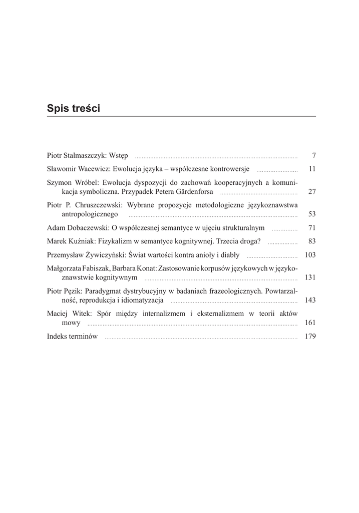 Spis treści Piotr Stalmaszczyk: Wstęp 7 Sławomir Wacewicz: Ewolucja języka – współczesne kontrowersje 11 Szymon Wróbel: Ewolucja dyspozycji do zachowań kooperacyjnych a komunikacja symboliczna. Przypadek Petera Gärdenforsa 27 Piotr P. Chruszczewski: Wybrane propozycje metodologiczne językoznawstwa antropologicznego 53 Adam Dobaczewski: O współczesnej semantyce w ujęciu strukturalnym 71 Marek Kuźniak: Fizykalizm w semantyce kognitywnej. Trzecia droga? 83 Przemysław Żywiczyński: Świat wartości kontra anioły i diabły 103 Małgorzata Fabiszak, Barbara Konat: Zastosowanie korpusów językowych w językoznawstwie kognitywnym 131 Piotr Pęzik: Paradygmat dystrybucyjny w badaniach frazeologicznych. Powtarzalność, reprodukcja i idiomatyzacja 143 Maciej Witek: Spór między internalizmem i eksternalizmem w teorii aktów mowy 161 Indeks terminów 179