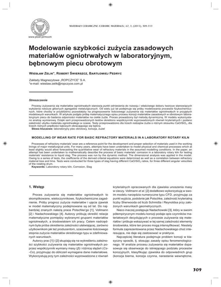 MATERIA£Y CERAMICZNE /CERAMIC MATERIALS/, 67, 3, (2015), 309-313 www.ptcer.pl/mccm Modelowanie szybkości zużycia zasadowych materiałów ogniotrwałych w laboratoryjnym, bębnowym piecu obrotowym W Z *, R Ś ,B P Zakłady Magnezytowe „ROPCZYCE” S.A. *e-mail: [email protected] Streszczenie Procesy zużywania się materiałów ogniotrwałych stanowią punkt odniesienia do rozwoju i właściwego doboru tworzyw stanowiących wyłożenia robocze głównych agregatów metalurgicznych. Od wielu już lat podejmuje się próby modelowania procesów fizykochemicznych, które choćby w przybliżeniu pozwalałyby na prognozowanie ilościowego zużywania się materiałów ogniotrwałych w przyjętych modelowych warunkach. W artykule podjęto próbę matematycznego opisu procesu korozji materiałów zasadowych w obrotowym laboratoryjnym piecu do badania odporności materiałów na ciekłe żużle. Proces prowadzony był metodą dynamiczną. W modelu wykorzystano analizę wymiarową. Dzięki serii przeprowadzonych testów określono współczynniki wyprowadzonych równań kryterialnych i podano zależność ubytku materiału ogniotrwałego w czasie. Testy przeprowadzono dla trzech rodzajów żużla o różnym stosunku CaO/SiO2, dla trzech różnych prędkości kątowych obracającego się bębna. Słowa kluczowe: laboratoryjny piec obrotowy, korozja, żużel MODELLING OF WEAR RATE FOR BASIC REFRACTORY MATERIALS IN A LABORATORY ROTARY KILN Processes of refractory materials’ wear are a reference point for the development and proper selection of materials used in the working linings of major metallurgical units. For many years, attempts have been undertaken to model physical and chemical processes which at least slightly would allow forecasting the quantitative wear of refractory materials in the assumed modelling conditions. In the paper, an attempt has been undertaken to mathematically describe the process of basic materials’ corrosion in a laboratory rotary kiln for testing materials’ resistance to liquid slag. The process was run by the dynamic method. The dimensional analysis was applied in the model. Owing to a series of tests, the coefficients of the derived criterial equations were determined as well as a correlation between refractory material loss and time. Tests were conducted for three types of slag having different CaO/SiO2 ratios, for three different angular velocities of the rotating drum. Keywords: Laboratory rotary kiln, Corrosion, Slag 1. Wstęp Proces zużywania się materiałów ogniotrwałych to skomplikowane, wieloczynnikowe, fizykochemiczne zagadnienie. Próby prognoz zużycia materiałów i ujęcia zjawisk w model matematyczny podejmowane są od lat. Do najbardziej znanych należą prace Potschke’go [1], Vollmann [2] i Nadachowskiego [4]. Autorzy próbują określić relacje matematyczne pomiędzy wybranymi grupami materiałów ogniotrwałych, a środowiskiem ich pracy. Celem nadrzędnym była próba określenia zależności ułatwiającej, zarówno użytkownikom jak też producentom, szacowanie ilościowego stopnia zużycia materiałów określonego typu w zdefiniowanych warunkach. Autorzy prac [1] i [2] skupiają się na wykreśleniu zależności szybkości zużywania się materiałów ogniotrwałych poprzez współczynnik wymiany masy (β) i różnicę stężeń (Cs-Co), przyjmując do obliczeń wymagane dane materiałowe. Wykorzystują przy tym zależności wyprowadzone z równań kryterialnych opracowanych dla zjawiska unoszenia masy w cieczy. Vollmann et al. [2] dodatkowo wykorzystują w swoim modelu narzędzia numeryczne typu CFD, przyjmując za punkt wyjścia, podobnie jak Potschke, zależność kryterialną liczby Sherwooda od liczb Schmidta i Reynoldsa przy założonych warunkach geometrycznych. Nieco inaczej postępuje Nadachowski [3], który w swoim półempirycznym modelu korozji podaje opis czynników materiałowych decydujących o procesie zużywania się materiałów i próbuje wskazywać w tej samej zależności elementy środowiska, które ten proces mogą intensyfikować. Niestety formuła zaprezentowana przez Nadachowskiego choć interesująca, nie daje się zastosować w praktyce. Najczęściej literatura podejmuje problem korozji w klasyczny sposób, tj. stosując zasady opisu fenomenologicznego. W analizie procesu zużywania się materiałów dopasowuje się obserwacje do istniejącego podziału procesów korozyjnych, klasyfikując zjawiska do odpowiednich grup (korozja bierna, korozja czynna, narastanie wewnętrzne, 309 W. Z , R. Ś , B. P Rys. 1. Wykres zależności C(t). Fig. 1. Graph of C(t) relationship. Rys. 2. Piec obrotowy wykorzystany w testach laboratoryjnych. Fig. 2. A laboratory rotary kiln used in experiments. narastanie zewnętrzne, itd.). Dokonuje się tego, obserwując bezpośrednio urządzenia podczas pracy lub bardziej skutecznie poprzez tak zwaną analizę Post Mortem, w której bada się obszary kształtki zdemontowanej z urządzenia – warstwa po warstwie. Ta ostatnia metoda pozostaje w dalszym ciągu głównym źródłem informacji o warunkach pracy materiału ogniotrwałego, będąc podstawą procesów decyzyjnych związanych z technologią produkcji tworzyw. W literaturowym opisie procesów korozyjnych cytuje się często wzór Nernsta: czołowy. Tym samym przyjęto, że dominującym zjawiskiem jest proces unoszenia masy w kierunku przesuwającej się cieczy. Nie uwzględnia on reakcji powstających na powierzchni czołowej kształtki oraz mechanizmów narastania czy zjawisk kapilarnych. Do testów wykorzystano laboratoryjny piec obrotowy do badań odporności korozyjnej metodą dynamiczną (Rys. 2). Piec jest opalany mieszaniną propan-tlen i posiada możliwość regulacji prędkości obrotowej w zakresie 1-50 obr./min. Założenia konstrukcyjne i procesowe urządzenia oparte są na brytyjskiej normie BS 1902-513: „Materiały ogniotrwałe – oznaczanie odporności na działanie żużla”. Wytyczne do prowadzenia te