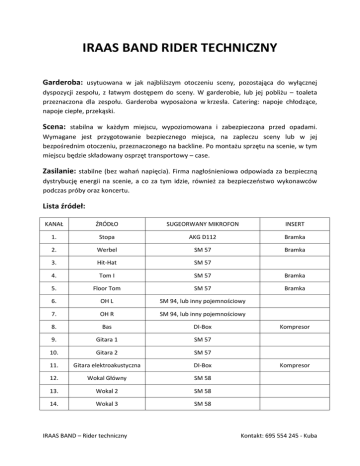 IRAAS BAND RIDER TECHNICZNY Garderoba: usytuowana w jak najbliższym otoczeniu sceny, pozostająca do wyłącznej dyspozycji zespołu, z łatwym dostępem do sceny. W garderobie, lub jej pobliżu – toaleta przeznaczona dla zespołu. Garderoba wyposażona w krzesła. Catering: napoje chłodzące, napoje ciepłe, przekąski. Scena: stabilna w każdym miejscu, wypoziomowana i zabezpieczona przed opadami. Wymagane jest przygotowanie bezpiecznego miejsca, na zapleczu sceny lub w jej bezpośrednim otoczeniu, przeznaczonego na backline. Po montażu sprzętu na scenie, w tym miejscu będzie składowany osprzęt transportowy – case. Zasilanie: stabilne (bez wahań napięcia). Firma nagłośnieniowa odpowiada za bezpieczną dystrybucję energii na scenie, a co za tym idzie, również za bezpieczeństwo wykonawców podczas próby oraz koncertu. Lista źródeł: KANAŁ ŹRÓDŁO SUGEORWANY MIKROFON INSERT 1. Stopa AKG D112 Bramka 2. Werbel SM 57 Bramka 3. Hit-Hat SM 57 4. Tom I SM 57 Bramka 5. Floor Tom SM 57 Bramka 6. OH L SM 94, lub inny pojemnościowy 7. OH R SM 94, lub inny pojemnościowy 8. Bas DI-Box 9. Gitara 1 SM 57 10. Gitara 2 SM 57 11. Gitara elektroakustyczna DI-Box 12. Wokal Główny SM 58 13. Wokal 2 SM 58 14. Wokal 3 SM 58 IRAAS BAND – Rider techniczny Kompresor Kompresor Kontakt: 695 554 245 - Kuba Plan sceny: IRAAS BAND – Rider techniczny Kontakt: 695 554 245 - Kuba