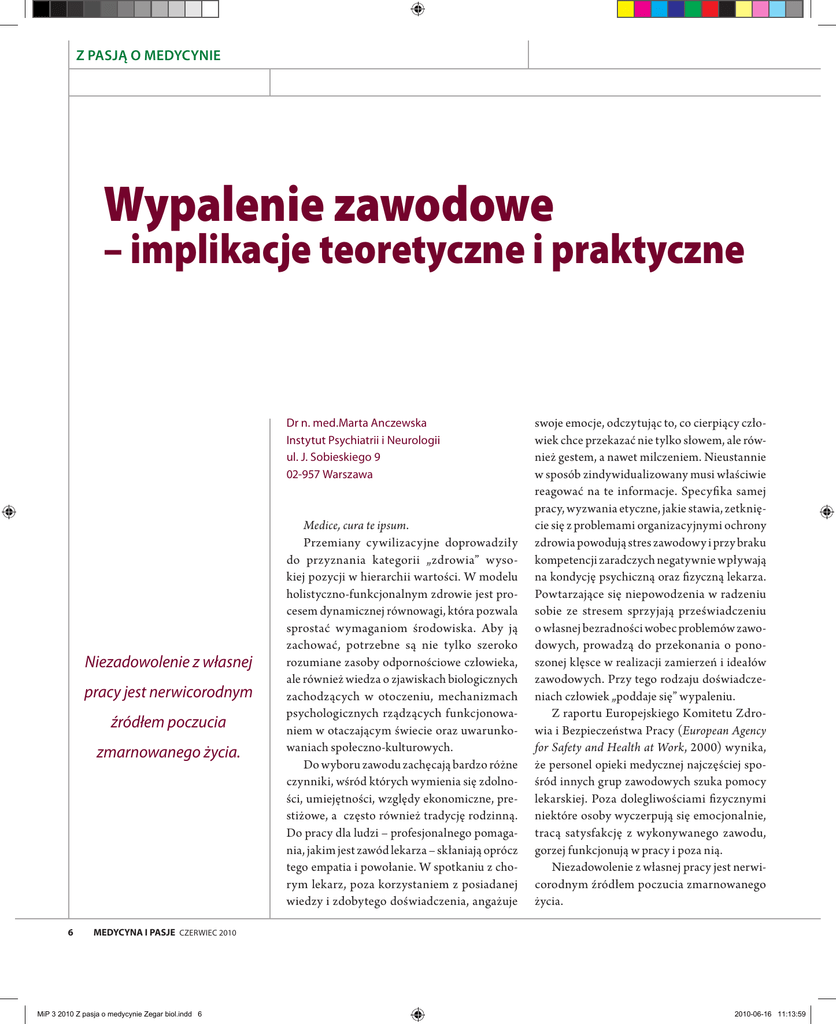 Z PasjĄ o medycynie Wypalenie zawodowe – implikacje teoretyczne i praktyczne Dr n. med.Marta Anczewska Instytut Psychiatrii i Neurologii ul. J. Sobieskiego 9 02-957 Warszawa Niezadowolenie z własnej pracy jest nerwicorodnym źródłem poczucia zmarnowanego życia. 6 Medice, cura te ipsum. Przemiany cywilizacyjne doprowadziły do przyznania kategorii „zdrowia” wyso‑ kiej pozycji w hierarchii wartości. W modelu holistyczno‑funkcjonalnym zdrowie jest pro‑ cesem dynamicznej równowagi, która pozwala sprostać wymaganiom środowiska. Aby ją zachować, potrzebne są nie tylko szeroko rozumiane zasoby odpornościowe człowieka, ale również wiedza o zjawiskach biologicznych zachodzących w otoczeniu, mechanizmach psychologicznych rządzących funkcjonowa‑ niem w otaczającym świecie oraz uwarunko‑ waniach społeczno‑kulturowych. Do wyboru zawodu zachęcają bardzo różne czynniki, wśród których wymienia się zdolno‑ ści, umiejętności, względy ekonomiczne, pre‑ stiżowe, a często również tradycję rodzinną. Do pracy dla ludzi – profesjonalnego pomaga‑ nia, jakim jest zawód lekarza – skłaniają oprócz tego empatia i powołanie. W spotkaniu z cho‑ rym lekarz, poza korzystaniem z posiadanej wiedzy i zdobytego doświadczenia, angażuje swoje emocje, odczytując to, co cierpiący czło‑ wiek chce przekazać nie tylko słowem, ale rów‑ nież gestem, a nawet milczeniem. Nieustannie w sposób zindywidualizowany musi właściwie reagować na te informacje. Specyfika samej pracy, wyzwania etyczne, jakie stawia, zetknię‑ cie się z problemami organizacyjnymi ochrony zdrowia powodują stres zawodowy i przy braku kompetencji zaradczych negatywnie wpływają na kondycję psychiczną oraz fizyczną lekarza. Powtarzające się niepowodzenia w radzeniu sobie ze stresem sprzyjają przeświadczeniu o własnej bezradności wobec problemów zawo‑ dowych, prowadzą do przekonania o pono‑ szonej klęsce w realizacji zamierzeń i ideałów zawodowych. Przy tego rodzaju doświadcze‑ niach człowiek „poddaje się” wypaleniu. Z raportu Europejskiego Komitetu Zdro‑ wia i Bezpieczeństwa Pracy (European Agency for Safety and Health at Work, 2000) wynika, że personel opieki medycznej najczęściej spo‑ śród innych grup zawodowych szuka pomocy lekarskiej. Poza dolegliwościami fizycznymi niektóre osoby wyczerpują się emocjonalnie, tracą satysfakcję z wykonywanego zawodu, gorzej funkcjonują w pracy i poza nią. Niezadowolenie z własnej pracy jest nerwi‑ corodnym źródłem poczucia zmarnowanego życia. MEDYCYNA I PASJE czerwiec 2010 MiP 3 2010 Z pasja o medycynie Zegar biol.indd 6 2010-06-16 11:13:59 Definicja „wypalenia” od początku budziła wiele kontrowersji. Objawy tego zespołu odno‑ szą się bowiem do emocjonalnych, motywacyj‑ nych, poznawczych i fizycznych aspektów życia człowieka. Herbert Freudenberger, amerykański psy‑ chiatra, jako pierwszy wprowadził termin „wypalenie” (burnout) do języka naukowego. U początkowo pełnych zapału i zaangażowa‑ nia pracowników w ośrodku dla osób uzależ‑ nionych od narkotyków obserwował w miarę upływu czasu wiele negatywnych zmian zwią‑ zanych z wykonywanym zawodem – pogłębia‑ jący się stan wyczerpania fizycznego, psychicz‑ nego i emocjonalnego. Maslach, uznawana za autorytet w tej dziedzinie, definiuje zespół wypalenia jako przedłużoną reakcję na przewlekłe emocjo‑ nalne i interpersonalne stresory w zawodach „ukierunkowanych na ludzi”, zwraca uwagę na relacje między „udzielającymi pomocy” i „otrzymującymi pomoc”, a także na sto‑ sunek osoby pomagającej do samej siebie. Ten interpersonalny aspekt wypalenia jest jej zdaniem najważniejszy dla zrozumienia koncepcji. Emener i wsp. zwracają uwagę na znacze‑ nie negatywnych uczuć dotyczących pracy i własnego obrazu przy powstawaniu objawów wypalenia, obciążeń, które towarzyszą pracy dla innych. Pines uważa, że proces wypalenia jest wynikiem niepowodzenia w poszukiwaniu sensu życia w pracy. Zdaniem autorki wypa‑ lenie dotyczy osób stawiających sobie w pracy ambitne cele oraz zaangażowanych w ich reali‑ zację. War unkiem wystąpienia objawów jest subiektywne poczucie porażki, które unie‑ Z PasjĄ o medycynie n Definicje MEDYCYNA I PASJE czerwiec 2010 MiP 3 2010 Z pasja o medycynie Zegar biol.indd 7 7 2010-06-16 11:14:02