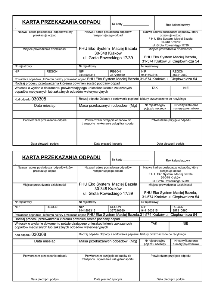 KARTA PRZEKAZANIA ODPADU Nr karty Rok kalendarzowy . Nazwa i adres posiadacza odpadów,który przekazuje odpad Nazwa i adres posiadacza odpadów ransportującego odpad Miejsce prowadzenia działalności FHU Eko System Maciej Bazela 30-348 Kraków ul. Grota Roweckiego 17/39 Nr rejestrowy Nr rejestrowy NIP REGON NIP 9441503315 Posiadacz odpadów , któremu należy przekazać odpad 030308 FHU Eko System Maciej Bazela, 31-574 Kraków ul. Ciepłownicza 54 Nr rejestrowy REGON 357210560 NIP 9441503315 REGON 357210560 FHU Eko System Maciej Bazela,31-574 Kraków ul. Ciepłownicza 54 Rodzaj procesu przetwarzania któremu powinien zostać poddany odpad Wniosek o wydanie dokumentu potwierdzającego unieszkodliwienie zakazanych odpadów medycznych lub zakaźnych odpadów weterynaryjnych Kod odpadu Nazwa i adres posiadacza odpadów, który przejmuje odpad F H U Eko System Maciej Bazela 30-348 Kraków ul. Grota Roweckiego 17/39 Miejsce prowadzenia działalności TAK NIE Rodzaj odpadu Odpady z sortowania papieru i tektury przeznaczone do recyklingu Nr rejestracyjny pojazdu naczepy Nr certyfikatu oraz numery pojemników Data miesiąc Masa przekazanych odpadów (Mg) Potwierdzam przekazanie odpadu Potwierdzam przejęcie odpadów do transportu i wykonanie usługi transportu Potwierdzam przyjęcie odpadu Data pieczęć i podpis Data pieczęć i podpis Data pieczęć i podpis KARTA PRZEKAZANIA ODPADU Nr karty Rok kalendarzowy . Nazwa i adres posiadacza odpadów,który przekazuje odpad Nazwa i adres posiadacza odpadów ransportującego odpad Miejsce prowadzenia działalności FHU Eko System Maciej Bazela 30-348 Kraków ul. Grota Roweckiego 17/39 Nr rejestrowy Nr rejestrowy NIP REGON NIP 9441503315 Posiadacz odpadów , któremu należy przekazać odpad 030308 FHU Eko System Maciej Bazela, 31-574 Kraków ul. Ciepłownicza 54 Nr rejestrowy REGON 357210560 NIP 9441503315 REGON 357210560 FHU Eko System Maciej Bazela,31-574 Kraków ul. Ciepłownicza 54 Rodzaj procesu przetwarzania któremu powinien zostać poddany odpad Wniosek o wydanie dokumentu potwierdzającego unieszkodliwienie zakazanych odpadów medycznych lub zakaźnych odpadów weterynaryjnych Kod odpadu Nazwa i adres posiadacza odpadów, który przejmuje odpad F H U Eko System Maciej Bazela 30-348 Kraków ul. Grota Roweckiego 17/39 Miejsce prowadzenia działalności TAK NIE Rodzaj odpadu Odpady z sortowania papieru i tektury przeznaczone do recyklingu Nr rejestracyjny pojazdu naczepy Nr certyfikatu oraz numery pojemników Data miesiąc Masa przekazanych odpadów (Mg) Potwierdzam przekazanie odpadu Potwierdzam przejęcie odpadów do transportu i wykonanie usługi transportu Potwierdzam przyjęcie odpadu Data pieczęć i podpis Data pieczęć i podpis Data pieczęć i podpis