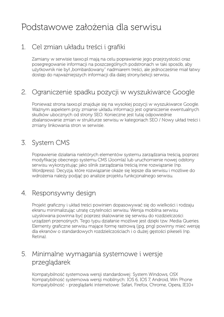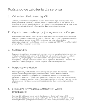 Podstawowe założenia dla serwisu 1. Cel zmian układu treści i grafiki Zamiany w serwisie taxxo.pl mają na celu poprawienie jego przejrzystości oraz posegregowanie informacji na poszczególnych podstronach w taki sposób, aby użytkownik nie był „bombardowany” nadmiarem treści, ale jednocześnie miał łatwy dostęp do najważniejszych informacji dla dalej strony/sekcji serwisu. 2. Ograniczenie spadku pozycji w wyszukiwarce Google Ponieważ strona taxxo.pl znajduje się na wysokiej pozycji w wyszukiwarce Google. Ważnym aspektem przy zmianie układu informacji jest ograniczenie ewentualnych skutków ubocznych od strony SEO. Konieczne jest tutaj odpowiednie zbalansowanie zmian w strukturze serwisu w kategoriach SEO / Nowy układ treści i zmiany linkowania stron w serwisie. 3. System CMS Poprawienie działania niektórych elementów systemu zarządzania treścią, poprzez modyfikację obecnego systemu CMS (Joomla) lub uruchomienie nowej odsłony serwisu wykorzystując jako silnik zarządzania treścią inne rozwiązanie (np. Wordpress). Decyzja, które rozwiązanie okaże się lepsze dla serwisu i możliwe do wdrożenia należy podjąć po analizie projektu funkcjonalnego serwisu. 4. Responsywny design Projekt graficzny i układ treści powinien dopasowywać się do wielkości i rodzaju ekranu minimalizując utratę czytelności serwisu. Wersja mobilna serwisu uzyskiwana powinna być poprzez skalowanie się serwisu do rozdzielczości urządzeń przenośnych. Tego typu działanie możliwe jest dzięki tzw. Media Queries. Elementy graficzne serwisu mające formę rastrową (jpg, png) powinny mieć wersję dla ekranów o standardowych rozdzielczościach i o dużej gęstości pikeseli (np. Retina). 5. Minimalne wymagania systemowe i wersje przeglądarek Kompatybilność systemowa wersji standardowej: System Windows, OSX Kompatybilność systemowa wersji mobilnych: IOS 6, IOS 7, Android, Win Phone Kompatybilność - przeglądarki internetowe: Safari, Firefox, Chrome, Opera, IE10+ 6. Projekt graficzny Styl graficzny nowej odsłony serwisu taxxo.pl powinien być prosty i przejrzysty; tzw. Flat design. Grafika powinna brać pod uwagę ograniczenia wynikające z wybranych rozwiązań programistycznych i zarządzania treścią, jak również ograniczenia dotyczące minimalnych wymagań systemowych i wersji przeglądarek internetowych. Fonty użyte w serwisie powinny być lekkie i delikatne - pod względem technicznym nie powinny być zagnieżdżone bezpośrednio w kodzie strony lecz pobierane z zewnętrznych serwisów (np. Google Web Fonts). Dobór odpowiedniego rozwiązania dotyczącego fontów jest zależny od rocznego budżetu właściciela strony na utrzymanie serwisu. 7. Proponowane technologie Podstawowe: HTML5, CCS4, Java Script, PHP5, Framework: Zend, Bootstrap, jQuery Zabronione: Flash CMS: Joomla, WordPress Dla każdego zewnętrznego rozwiązania (skrypt, framework etc.) powinna być dostarczona zewnętrzna licencja określająca warunki jego użytkowania. Diagram podstron dla serwisu 1. Podział serwisu na sekcje Serwis internetowy Taxxo.pl podzielony zostanie na trzy główne sekcje: dla firm, dla biur rachunkowych, inne strony serwisu (home, kontakt, mapa strony etc.) Niektóre z elementów serwisu będą wspólne dla wszystkich sekcji, ale wewnątrz tych elementów wydzielone zostaną podsekcje dla biur rachunkowych i dla firm (Blog i Baza wiedzy) 2. Ogólny diagram serwisu (do 2 poziomu) 3. Szczegółowy diagram sekcji: Dla firm 4. Szczegółowy diagram sekcji: Dla biur księgowych 5. Szczegółowy diagram sekcji ogólnej Informacje dotyczące poszczególnych podstron serwisu taxxo.pl 1. Nagłówek strony (logo, menu główne, menu górne, wyszukiwarka) Nagłówek strony jest elementem powtarzającym się na każdej stronie serwisu. Niezależnie od tego gdzie użytkownik aktualnie znajduje się w serwisie, wszystkie elementy nagłówka strony są w tych samych miejscach i działają w ten sam sposób, dla danej wersji językowej. • Logo: jest linkiem do głównej strony serwisu (Home) • Menu główne: podzielone jest na trzy części: a. Dla firm - drugi poziom menu zwiera wszystkie podstrony sekcji „dla firm” b. Dla biur rachunkowych - drugi poziom menu zawiera wszystkie podstrony sekcji „dla biur”. c. Strony ogólne - bez zagłębień, ułożone bezpośrednio na głównym poziomie menu • Menu górne: koszyk, wersje językowe, zaloguj się do aplikacji • Wyszukiwarka: proste pole typu input + guzik z akcją szukaj 2. Stopka strony (menu tekstowe, social media) Stopka strony jest elementem powtarzającym się na każdej stronie serwisu. Niezależnie od tego gdzie użytkownik aktualnie znajduje się w serwisie, wszystkie elementy stopki strony są w tych samych miejscach i działają w ten sam sposób, dla danej wersji językowej. • Infolinia: numer telefonu, e-mail • Menu tekstowe: zawiera linki do najważniejszych elementów serwisu, jak również linki do stron ważnych dla SEO i stron wymaganych przez prawo. Częścią menu mogą być konkretne produkty i podział na miasta. • Social Media: Komponent Facebooka • Referencje Licznik biur: Do sieci Taxxo należy już 51 biur, które obsługują 2316 firm Podział na dwie części: dla firm, dla biur (teksty - cytaty) slider nagrody: loga Partnerzy: loga • Newsletter tekst: do uzupełnienia przez klienta (zachęcający do podania e-maila) input: e-mail checkbox: Polityka prywatności button: Zapisz się • Copyright (prosty) + Cookies (jak w youtube.com) 3. Home - strona główna Strona główna serwisu taxxo.pl ma charakter informacyjny. Jej głównym celem jest przedstawienie dwóch grup docelowych, dla których Taxxo oferuje swoje produkty/ rozwiązania. Grupy te są równie ważne, a przypisane do nich produkty są na tyle różne, że konieczny jest wyraźny podział wizualny pozwalający użytkownikowi, już na poziomi kodu graficznego rozróżnić z którą sekcją ma do czynienia. • Slid