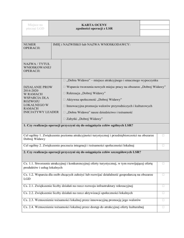 Miejsce na pieczęć LGD NUMER OPERACJI: KARTA OCENY zgodności operacji z LSR IMIĘ i NAZWISKO lub NAZWA WNIOSKODAWCY: NAZWA / TYTUŁ WNIOSKOWANEJ OPERACJI: „Dobra Widawa” – miejsce atrakcyjnego i smacznego wypoczynku DZIAŁANIE PROW 2014-2020 W RAMACH WSPARCIA DLA ROZWOJU LOKALNEGO W RAMACH INICJATYWY LEADER Wsparcie tworzenia nowych miejsc pracy na obszarze „Dobrej Widawy” Rekreacja „Dobrej Widawy” Aktywna społeczność „Dobrej Widawy” Innowacyjna promocja walorów przyrodniczych i kulturowych „Dobra Widawa” nasze dziedzictwo i tożsamość Zabytki „Dobrej Widawy” 1. Czy realizacja operacji przyczyni się do osiągnięcia celów ogólnych LSR? Cel ogólny 1. Zwiększenie poziomu atrakcyjności turystycznej i przedsiębiorczości na obszarze Dobrej Widawy Cel ogólny 2. Zwiększenie poczucia integracji i tożsamości społeczności lokalnej 2. Czy realizacja operacji przyczyni się do osiągnięcia celów szczegółowych LSR? Cs. 1.1. Stworzenie atrakcyjnej i konkurencyjnej oferty turystycznej, w tym rozwijającej ofertę produktów i usług lokalnych Cs. 1.2. Wsparcia dla osób chcących założyć lub rozwijać działalność gospodarczą na obszarze LGD Cs. 2.1. Zwiększenie liczby działań na rzecz rozwoju infrastruktury rekreacyjnej Cs. 2.2. Zwiększenie liczby działań na rzecz aktywizacji społeczności lokalnych Cs. 2.3. Wzmocnienie tożsamości lokalnej przez innowacyjną promocję jego walorów Cs. 2.4. Wzmocnienie tożsamości lokalnej przez dostęp do atrakcyjnej oferty kulturalnej Cs. 2.5. Wzmocnienie tożsamości lokalnej przez poprawę stanu obiektów zabytkowych 3. Czy realizacja operacji przyczyni się do osiągnięcia przedsięwzięć ? P.1 „Dobra Widawa” – miejsce atrakcyjnego i smacznego wypoczynku P.2 Wsparcie tworzenia nowych miejsc pracy na obszarze „Dobrej Widawy” P. 3 Rekreacja „Dobrej Widawy” P. 4 Aktywna społeczność „Dobrej Widawy” P.5 Innowacyjna promocja walorów przyrodniczych i kulturowych P. 6 „Dobra Widawa” nasze dziedzictwo i tożsamość P. 7 Zabytki „Dobrej Widawy” Głosuję za uznaniem operacji za zgodną/niezgodną* z LSR (niepotrzebne skreślić) IMIĘ I NAZWISKO CZŁONKA RADY: MIEJSCE: DATA: PODPIS SEKRETARZ A RADY: CZYTELNY PODPIS: PODPIS PRZEWODNICZĄCEGO: INSTRUKCJA WYPEŁNIANIA KARTY OCENY OPERACJI ZA ZGODNOŚĆ Z LSR 1. Pola zaciemnione wypełnia elektronicznie biuro LGD przed rozpoczęciem procesu oceny (przed posiedzeniem Rady) 2. Pola białe wypełnia Członek RADY LGD biorący udział w ocenie zgodności, po podpisaniu deklaracji poufności i bezstronności a) Kartę należy wypełnić piórem lub długopisem b) Ocena zgodności polega na wpisaniu znaku „x” w kratce po prawej stronie przy celu ogólnym, celu szczegółowym i przedsięwzięciu, z którym dana operacja jest zgodna. Operacja zostanie uznana za zgodną z LSR, jeżeli będzie zgodna z: - jednym przedsięwzięciem, - jednym celem szczegółowym przypisanym do danego przedsięwzięcia - jednym celem ogólnym przypisanym do danego celu szczegółowego i przedsięwzięcia c)Nie wpisanie imienia, nazwiska, miejsca, daty i czytelnego podpisu skutkuje nieważnością karty