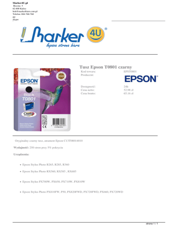 Marker4U.pl Boczna 5 62-800 Kalisz [email protected] Telefon: 884-760-760 gg: skype: Tusz Epson T0801 czarny Kod towaru: Producent: EPST0801 Dostępność: Cena netto: Cena brutto: 24h 52.98 zł 65.16 zł Oryginalny czarny tusz, atrament Epson C13T08014010 Wydajność: 250 stron przy 5% pokryciu Urządzenia: Epson Stylus Photo R265, R285, R360 Epson Stylus Photo RX560, RX585 , RX685 Epson Stylus PX700W, PX650, PX710W, PX810W Epson Stylus Photo PX810FW, P50, PX820FWD, PX720FWD, PX660, PX720WD strona 1 / 1 Powered by TCPDF (www.tcpdf.org)