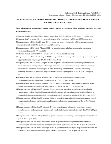 Załącznik Nr 1 do Zarządzenia Nr 8/I/2013 Burmistrza Miasta i Gminy Ślesin z dnia 2 kwietnia 2013 roku OCZEKIWANIA CO DO OPRACOWANIA ARKUSZA ORGANIZACJI PRACY SZKOŁY NA ROK SZKOLNY 2013/2014 Przy planowaniu organizacji pracy szkoły należy uwzględnić obowiązujące przepisy prawa, a w szczególności: 1.Ustawa z dnia 26 stycznia 1982 r. – Karta Nauczyciela (Dz. U. z 2006 r. Nr 97, poz. 674 z późn. zm.), 2.Ustawa z dnia 7 września 1991 r. o systemie oświaty (Dz. U. z 2004r. Nr 256, poz.2572 z późn. zm.) 3.Rozporządzenie MEN z dnia 21 maja 2001 r. w sprawie ramowych statutów publicznego przedszkola oraz publicznych szkół (Dz. U. Nr 61, poz. 624 ze zm.), 4.Rozporządzenie MEN z dnia 7 lutego 2012 r. w sprawie ramowych planów nauczania w szkołach publicznych (Dz. U. Nr 37, poz. 204), 5.Ustawa z dnia 25 czerwca2010 r. o sporcie (Dz. U. Nr 127, poz.857 ze zm.) 6.Rozporządzenie MEN z dnia 9 sierpnia 2011 r. w sprawie dopuszczalnych form realizacji obowiązkowych zajęć wychowania fizycznego (Dz. U. Nr 175, poz. 1042). 7.Rozporządzenie MEN z dnia 12 sierpnia 1999 r. w sprawie sposobu nauczania szkolnego oraz zakresu treści dotyczących wiedzy o życiu seksualnym człowieka, o zasadach świadomego i odpowiedzialnego rodzicielstwa, o wartości rodziny, życia w fazie prenatalnej oraz metodach i środkach świadomej prokreacji zawartych w podstawie programowej kształcenia ogólnego (Dz. U. Nr 67 poz. 756 z późn. zm.), 8.Rozporządzenie MEN z dnia 18 września 2008 r. w sprawie sposobu i trybu organizowania indywidualnego nauczania dzieci i młodzieży (Dz. U. Nr 175, poz. 1086), 9.Rozporządzenie MEN z dnia 14 kwietnia 1992 r. w sprawie warunków i sposobu organizowania nauki religii w publicznych szkołach i przedszkolach (Dz. U. Nr 36, poz. 155 ze zmianami), 10.Rozporządzenie MEN z dnia 17 listopada 2010 r. w sprawie warunków organizowania kształcenia, wychowania i opieki dla dzieci i młodzieży niepełnosprawnych oraz niedostosowanych społecznie w przedszkolach, szkołach i oddziałach ogólnodstępnych lub integracyjnych (Dz. U. Nr 228, poz.1490). 11.Rozporządzenie MEN z dnia 18 września 2008r. w sprawie orzeczeń i opinii wydawanych przez zespoły orzekające działające w publicznych poradniach psychologiczno-pedagogicznych (Dz. U. Nr 173, poz. 1072), 12.Rozporządzenie MEN z dnia 17 listopada 2010r. w sprawie zasad udzielania i organizacji pomocy psychologiczno-pedagogicznej w publicznych przedszkolach, szkołach i placówkach (Dz. U. Nr 228 poz. 1487), 13.Rozporządzenie MEN z 3 lutego 2009 r. w sprawie organizacji wczesnego wspomagania rozwoju dzieci (Dz. U. Nr 23, poz. 133), 14.Rozporządzenie MENiS z dnia 9 kwietnia 2002 r. w sprawie warunków prowadzenia działalności innowacyjnej i eksperymentalnej przez publiczne szkoły i placówki (Dz. U. Nr 56, poz. 506 ze zm.) 15.Rozporządzenie MENiS z dnia 20 lutego 2004 r. w sprawie warunków i trybu przyjmowania uczniów do szkół oraz przechodzenia z jednych typów szkół do innych (Dz. U. Nr 26, poz. 232 ze zm.), 16.Rozporządzenie MEN z dnia 12 marca 2009 r. w sprawie szczegółowych kwalifikacji wymaganych od nauczycieli oraz określenia szkół i wypadków, w których można zatrudnić nauczycieli niemających wyższego wykształcenia lub ukończonego zakładu kształcenia nauczycieli (Dz. U. Nr 50, poz. 400 z późn. zm.), 17.Uchwała Nr 142/XVI/12 r. Rady Miejskiej Gminy Ślesin z dnia 07 marca 2012 r. w sprawie ustalenia rozmiaru obniżek tygodniowego obowiązkowego wymiaru godzin zajęć dydaktycznych, wychowawczych i opiekuńczych dla nauczycieli pełniących funkcje kierownicze oraz ustalenia tygodniowego obowiązkowego wymiaru godzin zajęć dla niektórych nauczycieli w szkołach dla których organem prowadzącym jest Gmina Ślesin. I. Podstawą przygotowania arkusza organizacji szkoły są: 1. Opracowany plan nauczania na cały cykl kształcenia dla szkoły podstawowej, zespołu szkolnoprzedszkolnego i gimnazjum na podstawie obowiązujących ramowych planów nauczania; 2. Dokumenty związane z organizacją placówki, które należy dołączyć do arkusza organizacji szkoły m.in.: - ramowe plany nauczania dla poszczególnych roczników, - aktualny ilościowy wykaz orzeczeń o potrzebie kształcenia specjalnego lub indywidualnego nauczania (przypisanych do poszczególnych klas, data wydania orzeczenia, na jaki okres) wydanych przez poradnię psychologiczno-pedagogiczną, - pisemna zgoda organu prowadzącego na finansowanie planowanych dodatkowych działań (programy własne, innowacje wymagające przyznania szkole dodatkowych środków budżetowych), - informacja o nauczycielach przystępujących do postępowań kwalifikacyjnych lub egzaminacyjnych w roku szkolnym, którego dotyczy dany arkusz organizacyjny ze wskazaniem terminów złożenia przez nauczycieli wniosków o podjęcie tych postępowań, - wykaz imienny nauczycieli zatrudnionych w szkole z określeniem ich stażu pracy, kwalifikacji oraz stopnia awansu zawodowego, - wykaz imienny pracowników administracji i obsługi (wymiar zatrudnienia i stanowisko), 3. Jeżeli wstępne opracowanie arkusza wskazuje na konieczność odstępstw od ustalonych zasad, przed umieszczeniem w arkuszu organizacyjnym należy je uzgodnić w formie pisemnej z organem prowadzącym do 30 kwietnia 2013 r. 4. Aneks nr 1 obowiązujący od 1 września 2013 r., uwzględniający wszelkie zmiany w planowanej organizacji szkoły należy złożyć w Dziale Oświaty wraz z obowiązującymi dokumentami w terminie nie przekraczającym 25 sierpnia 2013 r. W przypadku kolejnych zmian w trakcie roku szkolnego do pisma przewodniego należy dołączyć niezbędne dokumenty potwierdzające konieczność zmiany, uzyskać akceptację i przedłożyć stosowny aneks; 5. Nauczanie indywidualne można wdrożyć do realizacji z chwilą uzgodnienia z organem prowadzącym, następnie wprowadzić zmianę aneksem; 6. Wszelkie zmiany w organizacji pracy szkoły, powstałe w trakcie roku 