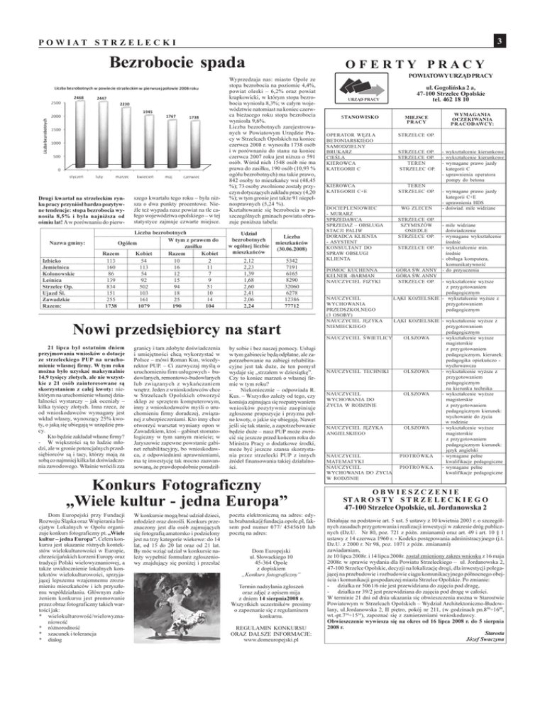 3 POWIAT STR Z E LE C K I Bezrobocie spada Drugi kwarta³ na strzeleckim rynku pracy przyniós³ bardzo pozytywne tendencje: stopa bezrobocia wynosi³a 8,5% i by³a najni¿sza od omiu lat! A w porównaniu do pierw- szego kwarta³u tego roku by³a ni¿sza o dwa punkty procentowe. Niele te¿ wypada nasz powiat na tle ca³ego województwa opolskiego w tej statystyce zajmuje czwarte miejsce. Wyprzedzaja nas: miasto Opole ze stopa bezrobocia na poziomie 4,4%, powiat oleski 6,2% oraz powiat krapkowicki, w którym stopa bezrobocia wynios³a 8,3%; w ca³ym województwie natomiast na koniec czerwca bie¿acego roku stopa bezrobocia wynios³a 9,6%. Liczba bezrobotnych zarejestrowanych w Powiatowym Urzêdzie Pracy w Strzelcach Opolskich na koniec czerwca 2008 r. wynosi³a 1738 osób i w porównaniu do stanu na koniec czerwca 2007 roku jest ni¿sza o 591 osób. Wród nich 1548 osób nie ma prawa do zasi³ku, 190 osób (10,93 % ogó³u bezrobotnych) ma takie prawo, 842 osoby to mieszkañcy wsi (48,45 %); 73 osoby zwolnione zosta³y przyczyn dotycz¹cych zak³adu pracy (4,20 %); w tym gronie jest tak¿e 91 niepe³nosprawnych (5,24 %). Kszta³towanie siê bezrobocia w poszczególnych gminach powiatu obrazuje poni¿sza tabela: OFERTY PRACY POWIATOWY URZ¥D PRACY ul. Gogoliñska 2 a, 47-100 Strzelce Opolskie tel. 462 18 10 STANOWISKO OPERATOR WÊZ£A BETONIARSKIEGO SAMODZIELNY BRUKARZ CIELA KIEROWCA KATEGORII C STRZELCE OP. KIEROWCA KATEGORII C+E TEREN STRZELEC OP. DOCIEPLENIOWIEC - MURARZ SPRZEDAWCA SPRZEDA¯ OBS£UGA STACJI PALIW DORADCA KLIENTA - ASYSTENT KONSULTANT DO SPRAW OBS£UGI KLIENTA POMOC KUCHENNA KELNER -BARMAN NAUCZYCIEL FIZYKI Nowi przedsiêbiorcy na start 21 lipca by³ ostatnim dniem przyjmowania wniosków o dotacje ze strzeleckiego PUP na uruchomienie w³asnej firmy. W tym roku mo¿na by³o uzyskaæ maksymalnie 14,9 tysiêcy z³otych, ale nie wszystkie z 21 osób zainteresowane s¹ skorzystaniem z ca³ej kwoty: niektórym na uruchomienie w³asnej dzia³alnoci wystarczy jak ocenia³y kilka tysiêcy z³otych. Inna rzecz, ¿e od wnioskodawców wymagany jest wk³ad w³asny, wynosz¹cy 25% kwoty, o jak¹ siê ubiegaj¹ w urzêdzie pracy. Kto bêdzie zak³ada³ w³asne firmy? - W wiêkszoci s¹ to ludzie m³odzi, ale w gronie potencjalnych przedsiêbiorców s¹ i tacy, którzy maj¹ za sob¹ co najmniej kilka lat dowiadczenia zawodowego. W³anie wrócili zza granicy i tam zdobyte dowiadczenia i umiejêtnoci chc¹ wykorzystaæ w Polsce mówi Roman Kus, wicedyrektor PUP. Ci zazwyczaj myl¹ o uruchomieniu firm us³ugowych - budowlanych, remontowo-budowlanych lub zwi¹zanych z wykañczaniem wnêtrz. Jeden z wnioskodawców chce w Strzelcach Opolskich otworzyæ sklep ze sprzêtem komputerowym, inny z wnioskodawców myli o uruchomieniu firmy doradczej, zwi¹zanej z ubezpieczeniami. Kto inny chce otworzyæ warsztat wymiany opon w Zawadzkiem, kto gabinet stomatologiczny w tym samym miecie; w Jaryszowie zapewne powstanie gabinet rehabilitacyjny, bo wnioskodawca, z odpowiednimi uprawnieniami, ma tê inwestycjê tak mocno zaawansowan¹, ¿e prawdopodobnie poradzi³- by sobie i bez naszej pomocy. Us³ugi w tym gabinecie bêd¹ odp³atne, ale zapotrzebowanie na zabiegi rehabilitacyjne jest tak du¿e, ¿e ten pomys³ wydaje siê strza³em w dziesi¹tkê. Czy to koniec marzeñ o w³asnej firmie w tym roku? Niekoniecznie odpowiada R. Kus. Wszystko zale¿y od tego, czy komisja zajmuj¹ca siê rozpatrywaniem wniosków pozytywnie zaopiniuje zg³oszone propozycje i przyzna pe³ne kwoty, o jakie siê ubiegaj¹. Nawet jeli siê tak stanie, a zapotrzebowanie bêdzie du¿e nasz PUP mo¿e zwróciæ siê jeszcze przed koñcem roku do Ministra Pracy o dodatkowe rodki, mo¿e byæ jeszcze szansa skorzystania przez strzelecki PUP z innych róde³ finansowania takiej dzia³alnoci. Konkurs Fotograficzny Wiele kultur - jedna Europa Dom Europejski przy Fundacji Rozwoju l¹ska oraz Wspierania Inicjatyw Lokalnych w Opolu organizuje konkurs fotograficzny pt. Wiele kultur jedna Europa. Celem konkursu jest ukazanie ró¿nych kontekstów wielokulturowoci w Europie, chrzecijañskich korzeni Europy oraz tradycji Polski wielowyznaniowej, a tak¿e uwidocznienie lokalnych kontekstów wielokulturowoci, sprzyjaj¹cej lepszemu wzajemnemu zrozumieniu mieszkañców i ich przysz³emu wspó³dzia³aniu. G³ównym za³o¿eniem konkursu jest promowanie przez obraz fotograficzny takich wartoci jak: * wielokulturowoæ/wielowyznaniowoæ * ró¿norodnoæ * szacunek i tolerancja * dialog W konkursie mog¹ braæ udzia³ dzieci, m³odzie¿ oraz doroli. Konkurs przeznaczony jest dla osób zajmuj¹cych siê fotografi¹ amatorsko i podzielony jest na trzy kategorie wiekowe: do 14 lat, od 15 do 20 lat oraz od 21 lat. By móc wzi¹æ udzia³ w konkursie nale¿y wype³niæ formularz zg³oszeniowy znajduj¹cy siê poni¿ej i przes³aæ poczta elektroniczn¹ na adres: [email protected], faksem pod numer 077/ 4545610 lub poczt¹ na adres: Dom Europejski ul. S³owackiego 10 45-364 Opole z dopiskiem Konkurs fotograficzny Termin nadsy³ania zg³oszeñ oraz zdjêæ z opisem mija z dniem 14 sierpnia2008 r. Wszystkich uczestników prosimy o zapoznanie siê z regulaminem konkursu. REGULAMIN KONKURSU ORAZ DALSZE INFORMACJE: www.domeuropejski.pl MIEJSCE PRACY NAUCZYCIEL WYCHOWANIA PRZEDSZKOLNEGO (3 OSOBY) NAUCZYCIEL JÊZYKA NIEMIECKIEGO STRZELCE OP. STRZELCE OP. TEREN STRZELEC OP. WG ZLECEÑ WYMAGANIA OCZEKIWANIA PRACODAWCY: - wykszta³cenie kierunkowe - wykszta³cenie kierunkowe - wymagane prawo jazdy kategorii C - uprawnienia operatora pompy do betonu - wymagane prawo jazdy kategorii C+E - uprawnienia HDS - dowiad. mile widziane STRZELCE OP. SZYMISZÓW OSIEDLE STRZELCE OP. - mile widziane dowiadczenie - wymagane wykszta³cenie rednie STRZELCE OP. - wykszta³cenie min. rednie - obs³uga komputera, komunikatywnoæ GÓRA W. ANNY - do przyuczenia GÓRA W. ANNY STRZELCE OP. - wykszta³cenie wy¿sze z przygotowaniem pedagogicznym £¥KI KOZIELSKIE - wykszta³cenie wy¿sze z pr