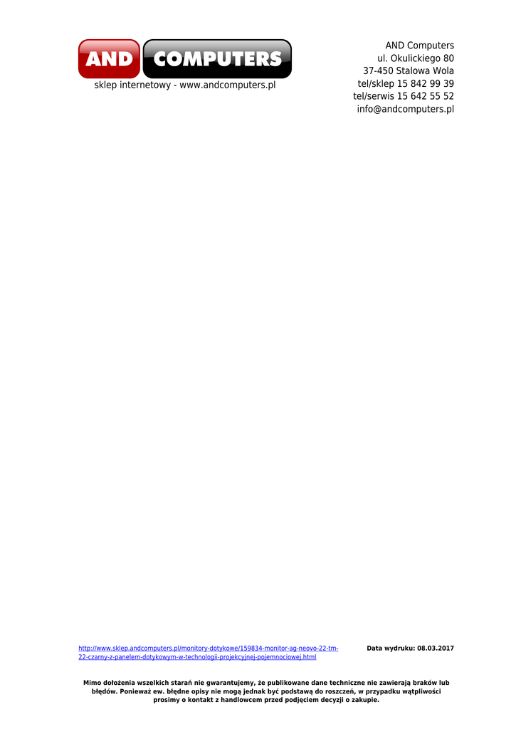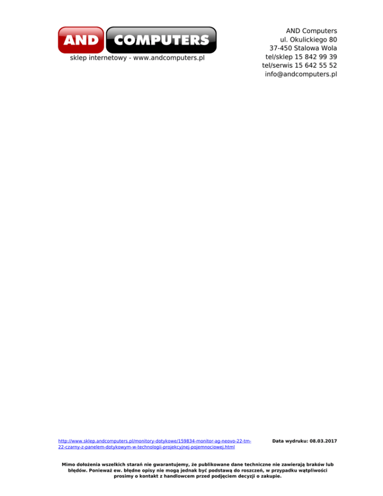 sklep internetowy - www.andcomputers.pl http://www.sklep.andcomputers.pl/monitory-dotykowe/159834-monitor-ag-neovo-22-tm22-czarny-z-panelem-dotykowym-w-technologii-projekcyjnej-pojemnociowej.html AND Computers ul. Okulickiego 80 37-450 Stalowa Wola tel/sklep 15 842 99 39 tel/serwis 15 642 55 52 [email protected] Data wydruku: 08.03.2017 Mimo dołożenia wszelkich starań nie gwarantujemy, że publikowane dane techniczne nie zawierają braków lub błędów. Ponieważ ew. błędne opisy nie mogą jednak być podstawą do roszczeń, w przypadku wątpliwości prosimy o kontakt z handlowcem przed podjęciem decyzji o zakupie.