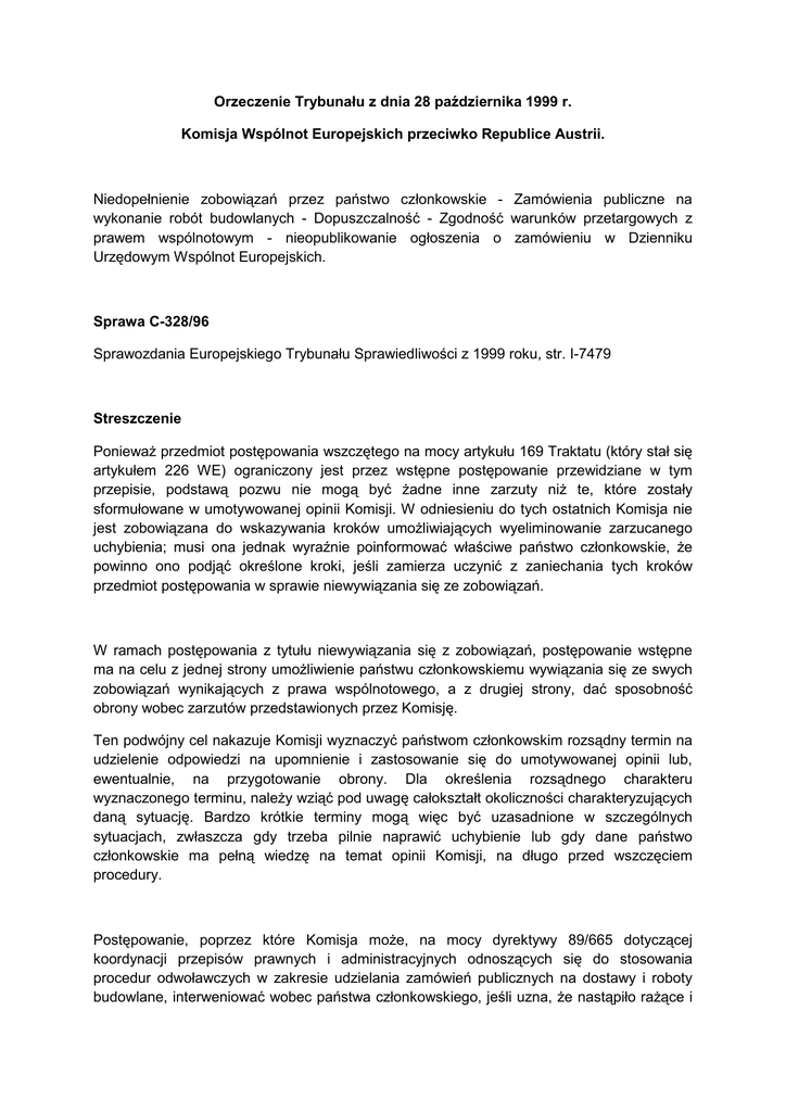 Orzeczenie Trybunału z dnia 28 października 1999 r. Komisja Wspólnot Europejskich przeciwko Republice Austrii. Niedopełnienie zobowiązań przez państwo członkowskie - Zamówienia publiczne na wykonanie robót budowlanych - Dopuszczalność - Zgodność warunków przetargowych z prawem wspólnotowym - nieopublikowanie ogłoszenia o zamówieniu w Dzienniku Urzędowym Wspólnot Europejskich. Sprawa C-328/96 Sprawozdania Europejskiego Trybunału Sprawiedliwości z 1999 roku, str. I-7479 Streszczenie Ponieważ przedmiot postępowania wszczętego na mocy artykułu 169 Traktatu (który stał się artykułem 226 WE) ograniczony jest przez wstępne postępowanie przewidziane w tym przepisie, podstawą pozwu nie mogą być żadne inne zarzuty niż te, które zostały sformułowane w umotywowanej opinii Komisji. W odniesieniu do tych ostatnich Komisja nie jest zobowiązana do wskazywania kroków umożliwiających wyeliminowanie zarzucanego uchybienia; musi ona jednak wyraźnie poinformować właściwe państwo członkowskie, że powinno ono podjąć określone kroki, jeśli zamierza uczynić z zaniechania tych kroków przedmiot postępowania w sprawie niewywiązania się ze zobowiązań. W ramach postępowania z tytułu niewywiązania się z zobowiązań, postępowanie wstępne ma na celu z jednej strony umożliwienie państwu członkowskiemu wywiązania się ze swych zobowiązań wynikających z prawa wspólnotowego, a z drugiej strony, dać sposobność obrony wobec zarzutów przedstawionych przez Komisję. Ten podwójny cel nakazuje Komisji wyznaczyć państwom członkowskim rozsądny termin na udzielenie odpowiedzi na upomnienie i zastosowanie się do umotywowanej opinii lub, ewentualnie, na przygotowanie obrony. Dla określenia rozsądnego charakteru wyznaczonego terminu, należy wziąć pod uwagę całokształt okoliczności charakteryzujących daną sytuację. Bardzo krótkie terminy mogą więc być uzasadnione w szczególnych sytuacjach, zwłaszcza gdy trzeba pilnie naprawić uchybienie lub gdy dane państwo członkowskie ma pełną wiedzę na temat opinii Komisji, na długo przed wszczęciem procedury. Postępowanie, poprzez które Komisja może, na mocy dyrektywy 89/665 dotyczącej koordynacji przepisów prawnych i administracyjnych odnoszących się do stosowania procedur odwoławczych w zakresie udzielania zamówień publicznych na dostawy i roboty budowlane, interweniować wobec państwa członkowskiego, jeśli uzna, że nastąpiło rażące i jawne naruszenie przepisów wspólnotowych dotyczących udzielenia zamówienia publicznego, stanowi środek prewencyjny, który nie może ani uchylić, ani też zastąpić kompetencji Komisji z tytułu artykułu 169 Traktatu (który stał się artykułem 226 WE). Wynika z tego, że warunki, jakim podlega owo szczególne postępowanie, nie mogą wpływać na dopuszczalność skargi wniesionej w oparciu o ten artykuł. Państwo członkowskie o strukturze federalnej może zostać uznane za odpowiedzialne za zachowanie organu zamawiającego w myśl art. 1 lit.b, akapit drugi dyrektywy 93/37 dotyczącej koordynacji procedur udzielania zamówień publicznych na roboty budowlane, w których wszystkie działania są kontrolowane i finansowane przez jednostkę federacyjną tego państwa. W istocie bowiem postanowienia wspólnotowe w zakresie udzielania zamówień publicznych byłyby pozbawione skuteczności, gdyby nie było możliwe uznanie państwa odpowiedzialnym za zachowanie tego rodzaju organu zamawiającego. Strony W sprawie C - 328/96, Komisja Wspólnot Europejskich, reprezentowana przez Pana H. Van Liera, radcę prawnego, i Panią C.Schmidt z Biura Prawnego Komisji, działających jako pełnomocnicy, z adresem do doręczeń w Luksemburgu, w biurze Pana C.Gomeza de la Cruz, z tego samego Biura Prawnego, Centre Wagner, Kirchberg, powód przeciwko Republice Austrii, reprezentowanej przez Pana W.Okreska, Sektionschef w Kancelarii, działającego jako pełnomocnik, z adresem do doręczeń w Luksemburgu, w Ambasadzie Austrii, 3 rue des Bains, pozwany. Wniosek o wydanie orzeczenia, że w ramach budowy w Sankt Polten nowego centrum administracyjno-kulturalnego dla Landu Dolnej Austrii, w czasie procedury udzielania zamówień, które zostały przyznane przed 6 lutego 1996 r., a które 7 marca 1996 r. nie były jeszcze wykonane lub które mogły być w miarę możliwości anulowane, Republika Austrii nie wywiązała się z zobowiązań wynikających z tytułu dyrektyw Rady 93/37EWG z dnia 14 czerwca 1993r. dotyczącej koordynacji procedur udzielania zamówień publicznych na roboty budowlane (OJ L 199, str. 54) i 89/665/EWG z dnia 21 grudnia 1989 r. dotyczącej koordynacji przepisów prawnych i administracyjnych odnoszących się do stosowania procedur odwoławczych w zakresie udzielania zamówień publicznych na dostawy i roboty budowlane (OJ L 395, str. 33) oraz artykułu 30 Traktatu WE (który stał się, po modyfikacji, artykułem 28 WE). TRYBUNAŁ, W składzie: p.p. G.C. Rodriguez Iglesias, przewodniczący, J.C. Moitinho de Almeida, D.A.O. Edward i L.Sevon, Przewodniczący Izby, C.Gulmann (sprawozdawca), J.-P. Puissochet, G. Hirsch, P. Jann i M. Wathelet, sędziowie, Rzecznik Generalny: Pan S.Albe,r Sekretarz: Pani D. Louterman-Hubeau, główny administrator, po rozpatrzeniu sprawozdania z rozprawy, po wysłuchaniu ustnej argumentacji stron, na rozprawie w dniu 10 listopada 1998 r., podczas której Komisja reprezentowana była przez Pana H. Van Liera oraz Mecenasa B.Wagenbaura, adwokata z Hamburga, zaś Republika Austrii przez Panów W. Okreska i C. Kleisera z Amt der Niederosterreichischen Landesregierung, Sankt Polten, działających jako pełnomocnicy, po wysłuchaniu opinii rzecznika generalnego na posiedzeniu w dniu 19 stycznia 1999 r., wydaje następujące orzeczenie Podstawy orzeczenia Poprzez złożenie wniosku w Sekretariacie Trybunału w dniu 7 października 1996 r. Komisja Wspólnot Europejskich wszczęła postępowanie z artykułu 