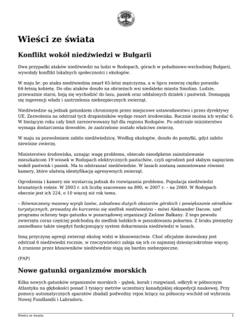 Wieści ze świata Konflikt wokół niedźwiedzi w Bułgarii Dwa przypadki ataków niedźwiedzi na ludzi w Rodopach, górach w południowo-wschodniej Bułgarii, wywołały konflikt lokalnych społeczności i ekologów. W maju br. po ataku niedźwiedzia zmarł 65-letni mężczyzna, a w lipcu zwierzę ciężko poraniło 64-letnią kobietę. Do obu ataków doszło na obrzeżach wsi niedaleko miasta Smolian. Ludzie, przeważnie starsi, boją się wychodzić do lasu, pasiek oraz oddalonych działek i pastwisk. Domagają się ingerencji władz i zastrzelenia niebezpiecznych zwierząt. Niedźwiedzie są jednak gatunkiem chronionym przez miejscowe ustawodawstwo i przez dyrektywy UE. Zezwolenia na odstrzał tych drapieżników wydaje resort środowiska. Rocznie można ich wydać 6. W bieżącym roku cały limit zarezerwowany był dla regionu Rodopów. Po odstrzale ministerstwo wymaga dostarczenia dowodów, że zastrzelone zostało właściwe zwierzę. W maju za pozwoleniem zabito niedźwiedzicę. Według ekologów, doszło do pomyłki, gdyż zabito niewinne zwierzę. Ministerstwo środowiska, uznając wagę problemu, obiecało nieodpłatne zainstalowanie mieszkańcom 19 wiosek w Rodopach elektrycznych pastuchów, czyli ogrodzeń pod słabym napięciem wokół pastwisk i pasiek. Ma to odstraszać niedźwiedzie. W lasach zostaną zamontowane również kamery, które ułatwią identyfikację agresywnych zwierząt. Ogrodzenia i kamery nie wystarczą jednak do rozwiązania problemu. Populacja niedźwiedzi brunatnych rośnie. W 2003 r. ich liczbę szacowano na 890, w 2007 r. – na 2060. W Rodopach obecnie jest ich 224, o 10 więcej niż rok temu. – Równoczesny masowy wyrąb lasów, zabudowa dużych obszarów górskich i powiększanie ośrodków turystycznych, prowadzą do kurczenia się siedlisk niedźwiedzia – mówi Aleksander Dacow, szef programu ochrony tego gatunku w pozarządowej organizacji Zielone Bałkany. Z tego powodu zwierzęta coraz częściej podchodzą do siedlisk ludzkich w poszukiwaniu pokarmu. Z braku pieniędzy zaniedbano także niegdyś funkcjonujący system dokarmiania niedźwiedzi w lasach. Inną przyczynę agresji zwierząt ekolog widzi w kłusownictwie. Choć oficjalnie dozwolony jest odstrzał 6 niedźwiedzi rocznie, w rzeczywistości zabija się ich co najmniej dziesięciokrotnie więcej. A zranione przez kłusowników niedźwiedzie stają się bardzo niebezpieczne. (PAP) Nowe gatunki organizmów morskich Kilka nowych gatunków organizmów morskich – gąbek, korali i rozgwiazd, odkryli w północnym Atlantyku na głębokości ponad 3 tysięcy metrów uczestnicy kanadyjskiej ekspedycji naukowej. Przy pomocy automatycznych aparatów zbadali podwodny rejon leżący na północny wschód od wybrzeża Nowej Fundlandii i Labradoru. Wieści ze świata 1 – Opuszczaliśmy aparaty na głębokość 3 tysięcy metrów – głębiej niż kiedykolwiek wcześniej podczas badań na tych wodach – poinformowała przedstawicielka Bedfordowskiego Instytutu Oceanografii (prowincja Nowa Szkocja), Helen Kenchington. – Na tych głębokościach natrafiliśmy na nowe, wcześniej nieznane nauce gatunki organizmów morskich. Wiele z nich do tej pory nie otrzymało nazw – podkreśliła. Według Kenchington, zebrane podczas ekspedycji dane naukowe zostaną wykorzystane do opracowania zaleceń dotyczących skali połowów przemysłowych na północnym Atlantyku. Takie nowe zalecenia są konieczne – podkreśliła – ponieważ obserwuje się istotne zmiany w liczebności ławic ryb, zaś my nie możemy wyjaśnić tych procesów, nie mając dokładnych danych o stanie całego ekosystemu w tej strefie oceanów i mórz świata. (PAP) Niedźwiedziom polarnym z Zatoki Hudsona pozostało tylko 25 lat życia W ciągu 25 lat całkowicie wymrą niedźwiedzie polarne z największego ich skupiska, Zatoki Hudsona – twierdzi ekipa biologów z Kanady, a informuje o tym portal brytyjskiego dziennika „The Independent”. Zatoka Hudsona stanowi jedno z 19 siedlisk niedźwiedzi polarnych. Jest to przy tym największe siedlisko niedźwiedzi tego gatunku. Ekipa biologów pod kierownictwem dr. Petera K. Molnara i Andrew E. Derochera z University of Alberta badała zachowanie tej populacji w związku z problemem globalnego ocieplenia. Okazało się, że niedźwiedzie w tym regionie tracą średnio 9,1 kg wagi przez dekadę, samice zmniejszyły długość ciała w tym samym okresie średnio o 10%, a cała populacja zmalała z 1200 osobników do nieco ponad 900 w ciągu 30 lat. Zespół Molnara zbadał też mechanizm kojarzenia się niedźwiedzi w pary. Według tych badań, samce odnajdywały niedźwiedzice gotowe do reprodukcji po śladach, jakie zostawiały one na śniegu. Wysycone były one hormonami, przyciągającymi samce. Wraz z cofaniem się lodu i zmniejszeniem masy oraz pogorszeniem stanu zdrowia samic, mechanizm ten zaczął zawodzić – niedźwiedzie nie mogły odnaleźć śladów, gdyż lodu było mniej, słabsze samice zostawiały mniejsze ślady hormonalne, spadła też ich liczba. Stąd populacja zaczęła się szybko zmniejszać, bowiem mniej samic rodziło młode. Pożywieniem niedźwiedzi polarnych nadal pozostają głównie foki, na które polują one na lodzie. Zmniejszenie powierzchni lodu, generalnie jego gorsza jakość i coroczne przesuwanie się granicy lodu na północ, powodują, że niedźwiedzie zamiast polować jak dotychczas, coraz więcej czasu spędzają na stałym lądzie praktycznie głodując. Jak pisze portal „The Independent”, referując wyniki badań, okres ten doszedł już do 5 miesięcy w roku, co fatalnie wpływa na ich kondycję fizyczną oraz zdolności rozrodcze. Andrew E. Derocher uważa, że istnieją dwa scenariusze zmiany sytuacji niedźwiedzi polarnych w Zatoce Hudsona. Pierwszy zakłada, że populacja na skutek wzrostu temperatury i cofania się lodu może zniknąć za około dekadę. Bardziej optymistyczny – że występujące naprzemiennie zimy chłod