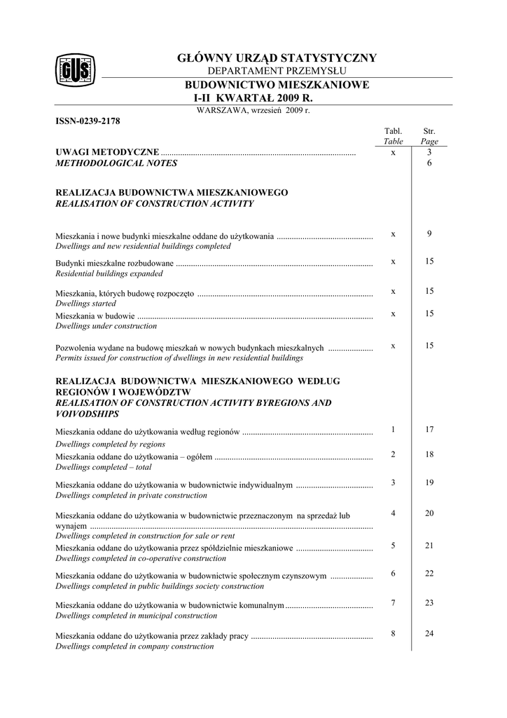 GŁÓWNY URZĄD STATYSTYCZNY DEPARTAMENT PRZEMYSŁU BUDOWNICTWO MIESZKANIOWE I-II KWARTAŁ 2009 R. WARSZAWA, wrzesień 2009 r. ISSN-0239-2178 Tabl. Table Str. Page x 3 6 Mieszkania i nowe budynki mieszkalne oddane do użytkowania ............................................. Dwellings and new residential buildings completed x 9 Budynki mieszkalne rozbudowane ............................................................................................ Residential buildings expanded x 15 Mieszkania, których budowę rozpoczęto .................................................................................. Dwellings started Mieszkania w budowie .............................................................................................................. Dwellings under construction x 15 x 15 Pozwolenia wydane na budowę mieszkań w nowych budynkach mieszkalnych ..................... Permits issued for construction of dwellings in new residential buildings x 15 Mieszkania oddane do użytkowania według regionów ............................................................. Dwellings completed by regions Mieszkania oddane do użytkowania – ogółem .......................................................................... Dwellings completed – total 1 17 2 18 Mieszkania oddane do użytkowania w budownictwie indywidualnym .................................... Dwellings completed in private construction 3 19 Mieszkania oddane do użytkowania w budownictwie przeznaczonym na sprzedaż lub wynajem .................................................................................................................................... Dwellings completed in construction for sale or rent Mieszkania oddane do użytkowania przez spółdzielnie mieszkaniowe .................................... Dwellings completed in co-operative construction 4 20 5 21 Mieszkania oddane do użytkowania w budownictwie społecznym czynszowym .................... Dwellings completed in public buildings society construction 6 22 Mieszkania oddane do użytkowania w budownictwie komunalnym ......................................... Dwellings completed in municipal construction 7 23 Mieszkania oddane do użytkowania przez zakłady pracy ......................................................... Dwellings completed in company construction 8 24 UWAGI METODYCZNE ........................................................................................... METHODOLOGICAL NOTES REALIZACJA BUDOWNICTWA MIESZKANIOWEGO REALISATION OF CONSTRUCTION ACTIVITY REALIZACJA BUDOWNICTWA MIESZKANIOWEGO WEDŁUG REGIONÓW I WOJEWÓDZTW REALISATION OF CONSTRUCTION ACTIVITY BYREGIONS AND VOIVODSHIPS 2 Mieszkania oddane do użytkowania według rodzajów budynków ........................................... Dwellings completed by types of buildings 9 25 Mieszkania, których budowę rozpoczęto .................................................................................. Dwellings started Pozwolenia wydane na budowę mieszkań ................................................................................ Permits issued for dwellings construction 10 26 11 27 12 29 ANEKS Pozwolenia na budowę nowych budynków niemieszkalnych oraz innych obiektów budowlanych ............................................................................................................................. Permits issued for non-residential buildings and for civil engineering works Objaśnienia znaków umownych Symbols Kreska (–) zjawisko nie wystąpiło magnitude zero. Znak „x” w tablicach wg form budownictwa w podziale na województwa - nie jest możliwe wyliczenie wskaźnika dynamiki w stosunku do analogicznego okresu ubiegłego roku, ze względu na to, że na terenie danego województwa nie oddano do użytkowania żadnego mieszkania: in the tables by type of construction and voivodships – calcuclation of indices in comparison with the corresponding period of previous year is not applicable because there was any dwelling completed in that voivodship: Zero: (0,0) w przedstawianym okresie (w rubryce poprzedzającej znak „x” występuje znak „-”), in presented period (there is “-“ in the column preceding “x”) w analogicznym okresie poprzedniego roku (w rubryce poprzedzającej znak „x” występuje wartość liczbowa). in the corresponding period of previous year (there is number in the column preceding “x”) zjawisko istniało w wielkości mniejszej niż 0,05 magnitude not zero, but less than 0,05 of a unit 3 UWAGI METODYCZNE 1. Mieszkanie jest to lokal przeznaczony na stały pobyt ludzi - wybudowany lub przebudowany do celów mieszkalnych; konstrukcyjnie wydzielony trwałymi ścianami w obrębie budynku - do którego prowadzi niezależne wejście z klatki schodowej, ogólnego korytarza, wspólnej sieni bądź bezpośrednio z ulicy, podwórza lub ogrodu; składający się z jednej lub kilku izb (lub zespołów izb) i pomieszczeń pomocniczych (takich jak: przedpokój, hol, łazienka, wc, garderoba, spiżarka, schowek). W budynkach zbiorowego zamieszkania, za mieszkanie uznaje się tylko ten lokal, który przeznaczony jest na stałe zamieszkiwanie właściciela, zarządcy lub pracowników obiektu i ich rodzin prowadzących odrębne gospodarstwa domowe. 2. Przez powierzchnię użytkową mieszkania rozumie się powierzchnię następujących pomieszczeń w mieszkaniu lub w jednomieszkaniowym budynku mieszkalnym: pokoi, kuchni, spiżarni, przedpokoi, alków, holi, korytarzy, łazienek, ubikacji, obudowanej werandy, ganku, garderoby oraz innych pomieszczeń służących mieszkalnym i gospodarczym potrzebom mieszkańców (pracownie artystyczne, pomieszczenia rekreacyjne lub hobby) bez względu na ich przeznaczenie i sposób użytkowania. Nie zalicza się do powierzchni użytkowej mieszkania powierzchni: balkonów, tarasów, loggi, antresoli, szaf i schowków w ścianach, pralni, suszarni, wózkowni, strychów, piwnic i komórek przeznaczonych na przechowyw