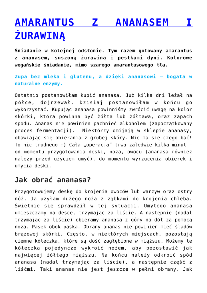 AMARANTUS ŻURAWINĄ Z ANANASEM I Śniadanie w kolejnej odsłonie. Tym razem gotowany amarantus z ananasem, suszoną żurawiną i pestkami dyni. Kolorowe wegańskie śniadanie, mimo szarego amarantusowego tła. Zupa bez mleka i glutenu, a dzięki ananasowi – bogata w naturalne enzymy. Ostatnio postanowiłam kupić ananasa. Już kilka dni leżał na półce, dojrzewał. Dzisiaj postanowiłam w końcu go wykorzystać. Kupując ananasa powinniśmy zwrócić uwagę na kolor skórki, która powinna być żółta lub żółtawa, oraz zapach spodu. Ananas nie powinien pachnieć alkoholem (zapoczątkowany proces fermentacji). Niektórzy omijają w sklepie ananasy, obawiając się obierania z grubej skóry. Nie ma się czego bać! To nic trudnego :) Cała „operacja” trwa zaledwie kilka minut – od momentu przygotowania deski, noża, owocu (ananasa również należy przed użyciem umyć), do momentu wyrzucenia obierek i umycia deski. Jak obrać ananasa? Przygotowujemy deskę do krojenia owoców lub warzyw oraz ostry nóż. Ja użyłam dużego noża z ząbkami do krojenia chleba. Świetnie się sprawdził w tej sytuacji. Umytego ananasa umieszczamy na desce, trzymając za liście. A następnie (nadal trzymając za liście) obieramy ananasa z góry na dół za pomocą noża. Pasek obok paska. Obrany ananas nie powinien mieć śladów brązowej skórki. Często, w niektórych miejscach, pozostają ciemne kółeczka, które są dość zagłębione w miąższu. Możemy te kółeczka pojedynczo wykroić nożem, aby pozostawić jak najwięcej żółtego miąższu. Na końcu należy odkroić spód ananasa (nadal trzymając za liście), a następnie część z liśćmi. Taki ananas nie jest jeszcze w pełni obrany. Jak pozbawimy go wierzchniej skórki, powinniśmy go przekroić wzdłuż, aby wykroić środek ananasa, który jest twardy i łykowaty. Dlatego ananas w puszce ma plastry bez środka :) Tę część (jest ona widoczna, ale również żółta jak miąższ) należy wykroić z całej długości obu połówek ananasa. Po tej czynności, możemy pokroić owoc jak chcemy, tj. w kostkę, paski, połówki plastrów. Nasiona amarantusa ugotowałam na domowym mleku z orzechów ziemnych (niesolonych). Pod koniec gotowania dodałam nasiona chia, stąd szary kolor zupy. Składniki: 3 łyżki nasion amarantusa 1 łyżka nasion chia (opcjonalnie) 300ml mleka roślinnego z nasion lub orzechów (w moim przypadku domowe mleko z orzechów ziemnych, naturalne) 1 łyżka suszonej żurawiny 1 łyżeczka pestek dyni ananas (może być również z puszki we własnym syropie) miód, syrop klonowy lub ksylitol do osłodzenia (opcjonalnie) Przygotowanie Nasiona amarantusa płuczemy i gotujemy na mleku roślinnym. Możemy również ugotować je w gorącej wodzie, a pod koniec gotowania dodać mleko roślinne (tak powinniśmy postąpić w sytuacji wykorzystania np. mleka z nasion słonecznika czy dyni). W tym momencie można również dodać nasiona chia. Jeśli tak postanowimy, należy podgrzewać całość jeszcze kilka minut, a następnie przełożyć ją do głębokiego talerza lub miski. Gdy zupa będzie stygnąć, zlewamy wrzątkiem suszoną żurawinę i pestki dyni. Jeśli zupa jest dla nas zbyt mało wyrazista, możemy lekko ją dosłodzić. Osobiście lubię naturalny smak żywności, niemal nigdy nie dosładzam potraw, ale jeśli ktoś pragnie rozpocząć dzień na słodko, warto użyć miodu czy odrobiny syropu klonowego. Osoby będące na diecie przeciwgrzybiczej powinny wykorzystać ksylitol bądź stewię. W takim też przypadku należy wybrać żurawinę naturalną, bez dodatku cukru. Do ugotowanego amarantusa dodajemy pokrojonego ananasa i posypujemy sparzoną żurawinę i pestki dyni. Dlaczego warto jeść ananasa? Ananas nie tylko ładnie wygląda i jest niezwykły w smaku, ale również jest niskokaloryczny (54 kcal/ 100g), a dzięki zawartym naturalnie enzymom, wspomaga trawienie. Wśród owoców odznacza się również zawartością tiaminy (witaminy B1) – 0,090 mg/100g, która odgrywa ważną rolę m.in. w przemianie węglowodanów. O naturalnych enzymach w owocach można przeczytać również tutaj. Smacznego!