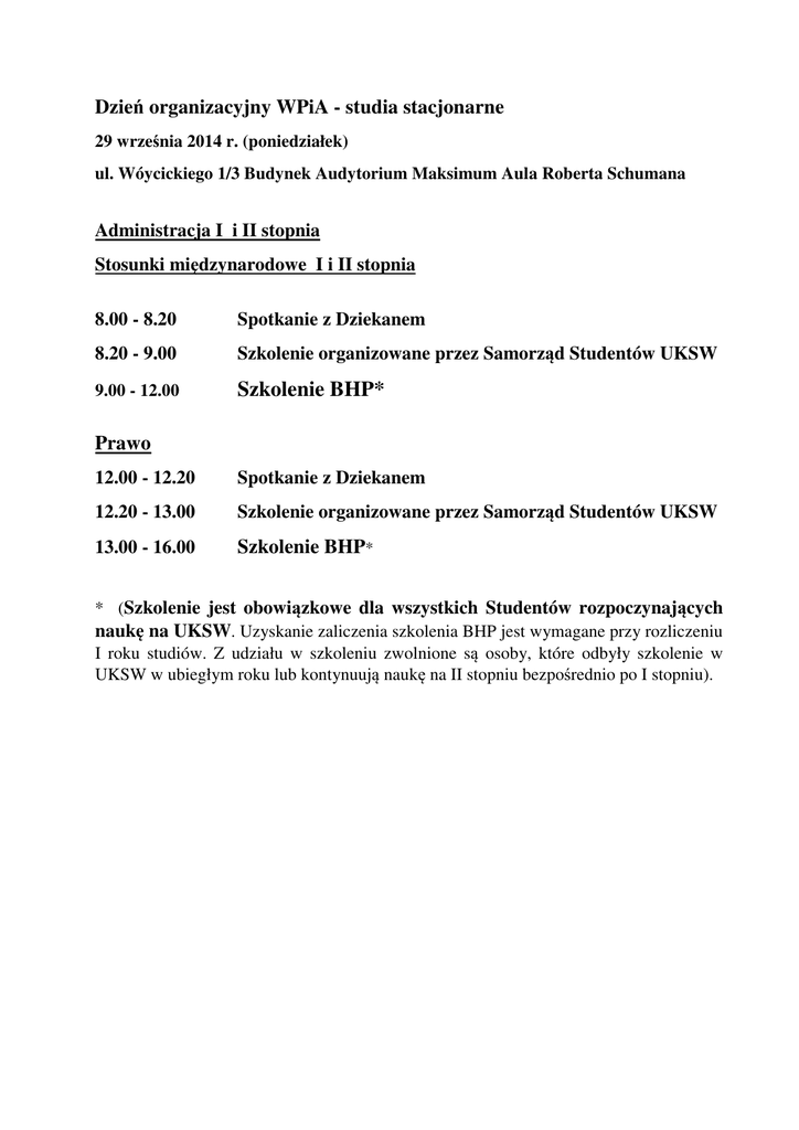 Dzień organizacyjny WPiA - studia stacjonarne 29 września 2014 r. (poniedziałek) ul. Wóycickiego 1/3 Budynek Audytorium Maksimum Aula Roberta Schumana Administracja I i II stopnia Stosunki międzynarodowe I i II stopnia 8.00 - 8.20 Spotkanie z Dziekanem 8.20 - 9.00 Szkolenie organizowane przez Samorząd Studentów UKSW 9.00 - 12.00 Szkolenie BHP* Prawo 12.00 - 12.20 Spotkanie z Dziekanem 12.20 - 13.00 Szkolenie organizowane przez Samorząd Studentów UKSW 13.00 - 16.00 Szkolenie BHP* * (Szkolenie jest obowiązkowe dla wszystkich Studentów rozpoczynających naukę na UKSW. Uzyskanie zaliczenia szkolenia BHP jest wymagane przy rozliczeniu I roku studiów. Z udziału w szkoleniu zwolnione są osoby, które odbyły szkolenie w UKSW w ubiegłym roku lub kontynuują naukę na II stopniu bezpośrednio po I stopniu).