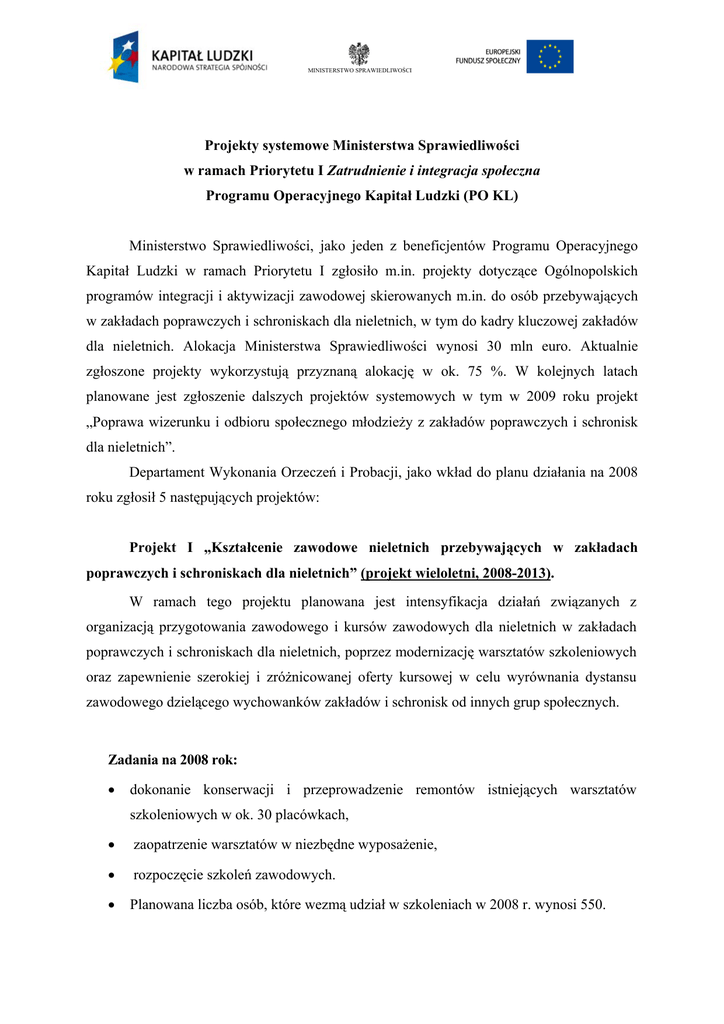 MINISTERSTWO SPRAWIEDLIWOŚCI Projekty systemowe Ministerstwa Sprawiedliwości w ramach Priorytetu I Zatrudnienie i integracja społeczna Programu Operacyjnego Kapitał Ludzki (PO KL) Ministerstwo Sprawiedliwości, jako jeden z beneficjentów Programu Operacyjnego Kapitał Ludzki w ramach Priorytetu I zgłosiło m.in. projekty dotyczące Ogólnopolskich programów integracji i aktywizacji zawodowej skierowanych m.in. do osób przebywających w zakładach poprawczych i schroniskach dla nieletnich, w tym do kadry kluczowej zakładów dla nieletnich. Alokacja Ministerstwa Sprawiedliwości wynosi 30 mln euro. Aktualnie zgłoszone projekty wykorzystują przyznaną alokację w ok. 75 %. W kolejnych latach planowane jest zgłoszenie dalszych projektów systemowych w tym w 2009 roku projekt „Poprawa wizerunku i odbioru społecznego młodzieży z zakładów poprawczych i schronisk dla nieletnich”. Departament Wykonania Orzeczeń i Probacji, jako wkład do planu działania na 2008 roku zgłosił 5 następujących projektów: Projekt I „Kształcenie zawodowe nieletnich przebywających w zakładach poprawczych i schroniskach dla nieletnich” (projekt wieloletni, 2008-2013). W ramach tego projektu planowana jest intensyfikacja działań związanych z organizacją przygotowania zawodowego i kursów zawodowych dla nieletnich w zakładach poprawczych i schroniskach dla nieletnich, poprzez modernizację warsztatów szkoleniowych oraz zapewnienie szerokiej i zróżnicowanej oferty kursowej w celu wyrównania dystansu zawodowego dzielącego wychowanków zakładów i schronisk od innych grup społecznych. Zadania na 2008 rok: • dokonanie konserwacji i przeprowadzenie remontów istniejących warsztatów szkoleniowych w ok. 30 placówkach, • zaopatrzenie warsztatów w niezbędne wyposażenie, • rozpoczęcie szkoleń zawodowych. • Planowana liczba osób, które wezmą udział w szkoleniach w 2008 r. wynosi 550. MINISTERSTWO SPRAWIEDLIWOŚCI W kolejnych latach realizacji projektu planowana jest: • kontynuacja szkoleń w warunkach zmodernizowanych i lepiej wyposażonych warsztatów szkoleniowych. Budżet projektu: ok. 31 702 000 złotych. Organizowanie kształcenia zawodowego w zakładach i schroniskach stanowi jedną z najskuteczniejszych form resocjalizacji nieletnich. Zdobycie kwalifikacji teoretycznych i praktycznych w toku przygotowania zawodowego zwiększa szanse na znalezienie zatrudnienia po opuszczeniu zakładu lub schroniska, przyczynia się do aktywizacji zawodowej nieletnich oraz w konsekwencji zwiększa szanse na pełna integrację społeczną po opuszczeniu placówki. Niezbędnym warunkiem nabycia przez nieletnich kwalifikacji zawodowych umożliwiających znalezienie zatrudnienia po opuszczeniu zakładów i schronisk jest zwiększenie i dywersyfikacja oferty zawodowej poprzez, modernizację bazy szkoleniowo-dydaktycznej warsztatów szkolnych. Dlatego też jednym z elementów projektu będzie unowocześnienie istniejących warsztatów oraz stworzenie nowych stanowisk warsztatowych. Zwiększenie oferty szkoleniowej da nieletnim możliwość wyboru rodzaju kształcenia zawodowego lub zdobycia kwalifikacji zawodowych nie tylko w odniesieniu do jednego zawodu. Rezultaty twarde: przeszkolenie zawodowe w okresie 2008-2013 ok. 4000 osób przebywających w zakładach poprawczych i schroniskach dla nieletnich (w tym ok. 660 w 2008r.); modernizacja warsztatów szkolnych w ok. 30 placówkach (w 2008 r.); zapewnienie oferty przygotowania zawodowego obejmującej ok. 25 typów kursów (do wykorzystania w zależności od zapotrzebowania zgłoszonego przez daną placówkę). Rezultaty miękkie: ułatwienie usamodzielniania się i osiągnięcia stabilizacji zawodowej nieletnich opuszczających zakłady poprawcze i schroniska dla nieletnich; umożliwienie nieletniemu zdobycie i podnoszenie kwalifikacji zawodowych w czasie pobytu i zwiększenie szans na doskonalenie zawodowe po opuszczeniu zakładu poprawczego lub schroniska; zwiększenie motywacji do poszukiwania pracy i podniesienie poczucia własnej wartości, zdobycie przez nieletnich praktycznych umiejętności potrzebnych w pozyskiwaniu zatrudnienia, podwyższenie skuteczności pracy wychowawczej z nieletnimi. MINISTERSTWO SPRAWIEDLIWOŚCI Projekt II „Podnoszenie kwalifikacji zawodowych kluczowych pracowników pedagogicznych i niepedagogicznych zakładów poprawczych i schronisk dla nieletnich” (projekt wieloletni, 2008-2013). W ramach projektu planowane jest organizowanie specjalistycznych kursów i szkoleń, w tym zawodowych, podejmowanie przez kluczowych pracowników zakładów i schronisk studiów uzupełniających lub podyplomowych, związanych z zakresem wykonywanych obowiązków oraz udział w tematycznych konferencjach i sympozjach. Doskonalenie zawodowe będzie odbywać się równolegle w różnych formach, uzależnionych od potrzeb poszczególnych kluczowych pracowników pedagogicznych i niepedagogicznych zakładów oraz schronisk dla nieletnich. Zadania na 2008 rok: podniesienie kwalifikacji zawodowych w różnych formach kształcenia przez ok. 200 pracowników zakładów i schronisk. W kolejnych latach: kontynuacja doskonalenia zawodowego kluczowych pracowników. Budżet projektu: 16.268.700 złotych Zmieniające się realia życia codziennego oraz rozwój poszczególnych dziedzin nauki (oprócz nauk technicznych także pedagogiczne, socjologiczne itp.) powodują, że kwalifikacje zawodowe kadry pedagogicznej i niepedagogicznej pozostającej w bezpośredniej, stałej styczności z nieletnimi wymagają ciągłego doskonalenia i uzupełniania. Dokonać się to może poprzez organizowanie specjalistycznych kursów, szkoleń, w tym szkoleń modułowych, doradztwa, studiów uzupełniających, studiów podyplomowych oraz wizyt studyjnych. Ponadto praca z nieletnimi umieszczonymi w zakładach poprawczych i schroniskach dla nieletnich wymaga wyższych niż przeciętne umiejętności pedagogicznych i dydaktycznych. Wykorzystywanie najnows