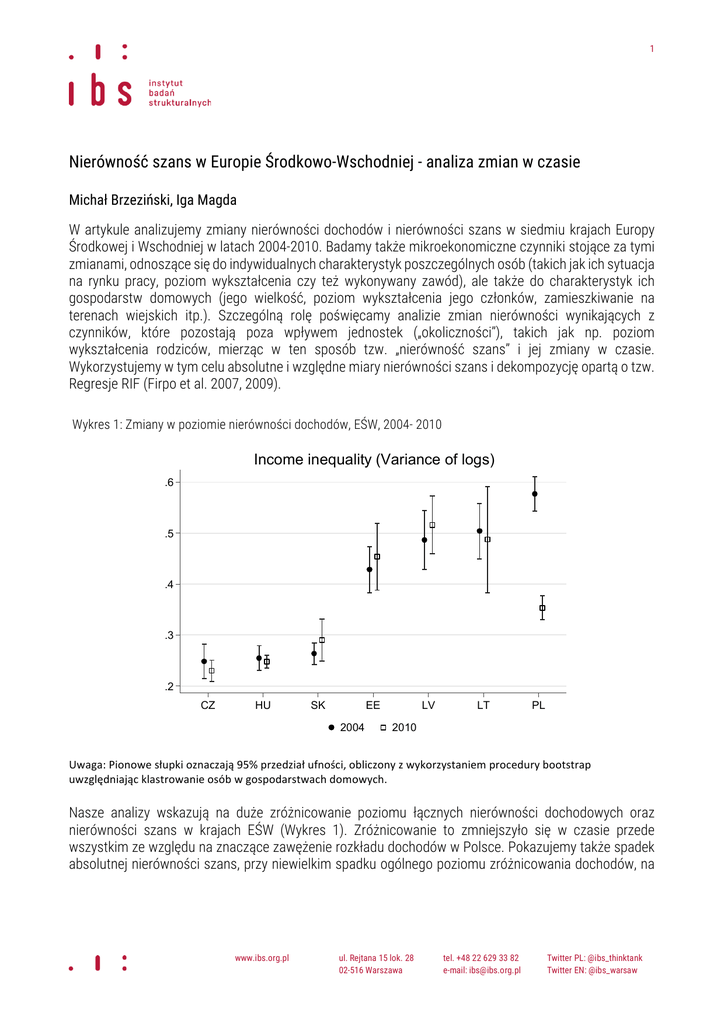 1 Nierówność szans w Europie Środkowo-Wschodniej - analiza zmian w czasie Michał Brzeziński, Iga Magda W artykule analizujemy zmiany nierówności dochodów i nierówności szans w siedmiu krajach Europy Środkowej i Wschodniej w latach 2004-2010. Badamy także mikroekonomiczne czynniki stojące za tymi zmianami, odnoszące się do indywidualnych charakterystyk poszczególnych osób (takich jak ich sytuacja na rynku pracy, poziom wykształcenia czy też wykonywany zawód), ale także do charakterystyk ich gospodarstw domowych (jego wielkość, poziom wykształcenia jego członków, zamieszkiwanie na terenach wiejskich itp.). Szczególną rolę poświęcamy analizie zmian nierówności wynikających z czynników, które pozostają poza wpływem jednostek („okoliczności”), takich jak np. poziom wykształcenia rodziców, mierząc w ten sposób tzw. „nierówność szans” i jej zmiany w czasie. Wykorzystujemy w tym celu absolutne i względne miary nierówności szans i dekompozycję opartą o tzw. Regresje RIF (Firpo et al. 2007, 2009). Wykres 1: Zmiany w poziomie nierówności dochodów, EŚW, 2004- 2010 Income inequality (Variance of logs) .6 .5 .4 .3 .2 CZ HU SK EE 2004 LV LT PL 2010 Uwaga: Pionowe słupki oznaczają 95% przedział ufności, obliczony z wykorzystaniem procedury bootstrap uwzględniając klastrowanie osób w gospodarstwach domowych. Nasze analizy wskazują na duże zróżnicowanie poziomu łącznych nierówności dochodowych oraz nierówności szans w krajach EŚW (Wykres 1). Zróżnicowanie to zmniejszyło się w czasie przede wszystkim ze względu na znaczące zawężenie rozkładu dochodów w Polsce. Pokazujemy także spadek absolutnej nierówności szans, przy niewielkim spadku ogólnego poziomu zróżnicowania dochodów, na www.ibs.org.pl ul. Rejtana 15 lok. 28 02-516 Warszawa tel. +48 22 629 33 82 e-mail: [email protected] Twitter PL: @ibs_thinktank Twitter EN: @ibs_warsaw 2 Litwie; oraz stosunkowo wysoki i rosnący udział nierówności szans przy niskim poziomie całkowitego zróżnicowania dochodów na Węgrzech (por. Wykres 2). Wykres 2: Zmiany w poziomie nierówności szans, absolutnej (AIOP) i relatywnej (RIOP). Spadek nierówności dochodów w Polsce wynikał przede wszystkim ze znaczącej poprawy sytuacji na rynku pracy i rosnących wskaźników zatrudnienia. Spadek absolutnej nierówności szans w Polsce i na Litwie wiązał się przede wszystkim ze zmianami w ekonomicznej wycenie „okoliczności” (zmiany w ich strukturze miały mniejsze znaczenie). Podobnie, wzrost względnej nierówności szans na Węgrzech i Słowacji także wynikał ze zmian znaczenia, jakie mają okoliczności rodzinne (np. średnie wykształcenie ojców na Węgrzech) dla udziału nierówności szans w obserwowanym całkowitym zróżnicowaniu dochodów. Pełna wersja artykułu Brzeziński M., Magda I. (2016), Inequality of opportunity in Central and Eastern Europe: accounting for changes over time, IBS Working Paper 05/2016 http://ibs.org.pl/app/uploads/2016/05/IBS_Working_Paper_05_2016.pdf www.ibs.org.pl ul. Rejtana 15 lok. 28 02-516 Warszawa tel. +48 22 629 33 82 e-mail: [email protected] Twitter PL: @ibs_thinktank Twitter EN: @ibs_warsaw