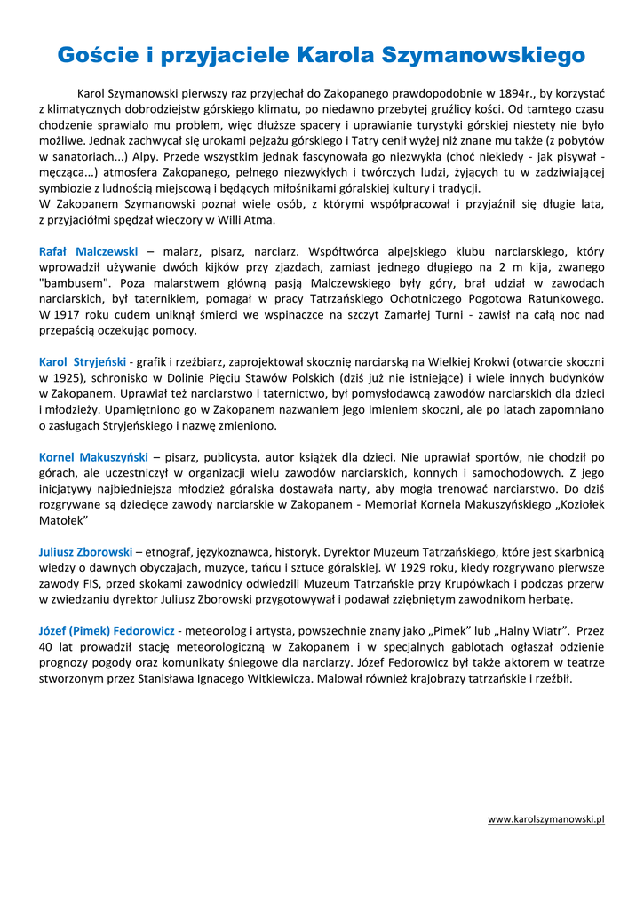 Goście i przyjaciele Karola Szymanowskiego Karol Szymanowski pierwszy raz przyjechał do Zakopanego prawdopodobnie w 1894r., by korzystać z klimatycznych dobrodziejstw górskiego klimatu, po niedawno przebytej gruźlicy kości. Od tamtego czasu chodzenie sprawiało mu problem, więc dłuższe spacery i uprawianie turystyki górskiej niestety nie było możliwe. Jednak zachwycał się urokami pejzażu górskiego i Tatry cenił wyżej niż znane mu także (z pobytów w sanatoriach...) Alpy. Przede wszystkim jednak fascynowała go niezwykła (choć niekiedy - jak pisywał męcząca...) atmosfera Zakopanego, pełnego niezwykłych i twórczych ludzi, żyjących tu w zadziwiającej symbiozie z ludnością miejscową i będących miłośnikami góralskiej kultury i tradycji. W Zakopanem Szymanowski poznał wiele osób, z którymi współpracował i przyjaźnił się długie lata, z przyjaciółmi spędzał wieczory w Willi Atma. Rafał Malczewski – malarz, pisarz, narciarz. Współtwórca alpejskiego klubu narciarskiego, który wprowadził używanie dwóch kijków przy zjazdach, zamiast jednego długiego na 2 m kija, zwanego "bambusem". Poza malarstwem główną pasją Malczewskiego były góry, brał udział w zawodach narciarskich, był taternikiem, pomagał w pracy Tatrzańskiego Ochotniczego Pogotowa Ratunkowego. W 1917 roku cudem uniknął śmierci we wspinaczce na szczyt Zamarłej Turni - zawisł na całą noc nad przepaścią oczekując pomocy. Karol Stryjeński - grafik i rzeźbiarz, zaprojektował skocznię narciarską na Wielkiej Krokwi (otwarcie skoczni w 1925), schronisko w Dolinie Pięciu Stawów Polskich (dziś już nie istniejące) i wiele innych budynków w Zakopanem. Uprawiał też narciarstwo i taternictwo, był pomysłodawcą zawodów narciarskich dla dzieci i młodzieży. Upamiętniono go w Zakopanem nazwaniem jego imieniem skoczni, ale po latach zapomniano o zasługach Stryjeńskiego i nazwę zmieniono. Kornel Makuszyński – pisarz, publicysta, autor książek dla dzieci. Nie uprawiał sportów, nie chodził po górach, ale uczestniczył w organizacji wielu zawodów narciarskich, konnych i samochodowych. Z jego inicjatywy najbiedniejsza młodzież góralska dostawała narty, aby mogła trenować narciarstwo. Do dziś rozgrywane są dziecięce zawody narciarskie w Zakopanem - Memoriał Kornela Makuszyńskiego „Koziołek Matołek” Juliusz Zborowski – etnograf, językoznawca, historyk. Dyrektor Muzeum Tatrzańskiego, które jest skarbnicą wiedzy o dawnych obyczajach, muzyce, tańcu i sztuce góralskiej. W 1929 roku, kiedy rozgrywano pierwsze zawody FIS, przed skokami zawodnicy odwiedzili Muzeum Tatrzańskie przy Krupówkach i podczas przerw w zwiedzaniu dyrektor Juliusz Zborowski przygotowywał i podawał zziębniętym zawodnikom herbatę. Józef (Pimek) Fedorowicz - meteorolog i artysta, powszechnie znany jako „Pimek” lub „Halny Wiatr”. Przez 40 lat prowadził stację meteorologiczną w Zakopanem i w specjalnych gablotach ogłaszał odzienie prognozy pogody oraz komunikaty śniegowe dla narciarzy. Józef Fedorowicz był także aktorem w teatrze stworzonym przez Stanisława Ignacego Witkiewicza. Malował również krajobrazy tatrzańskie i rzeźbił. www.karolszymanowski.pl