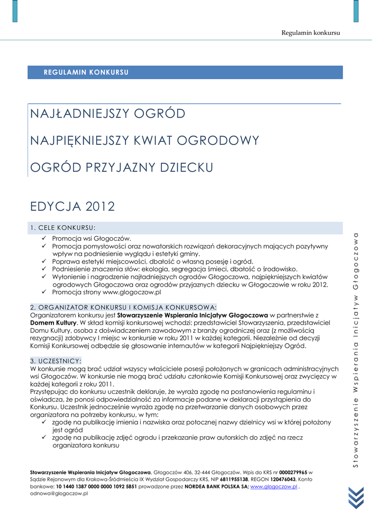 Regulamin konkursu REGULAMIN KONKURSU NAJŁADNIEJSZY OGRÓD NAJPIĘKNIEJSZY KWIAT OGRODOWY OGRÓD PRZYJAZNY DZIECKU EDYCJA 2012 Promocja wsi Głogoczów. Promocja pomysłowości oraz nowatorskich rozwiązań dekoracyjnych mających pozytywny wpływ na podniesienie wyglądu i estetyki gminy. Poprawa estetyki miejscowości, dbałość o własną posesję i ogród. Podniesienie znaczenia słów: ekologia, segregacja śmieci, dbałość o środowisko. Wyłonienie i nagrodzenie najładniejszych ogrodów Głogoczowa, najpiękniejszych kwiatów ogrodowych Głogoczowa oraz ogrodów przyjaznych dziecku w Głogoczowie w roku 2012. Promocja strony www.glogoczow.pl 2. ORG ANI ZATOR KONKURSU I KOMI SJA KONKURSOWA: Organizatorem konkursu jest Stowarzyszenie Wspierania Inicjatyw Głogoczowa w partnerstwie z Domem Kultury. W skład komisji konkursowej wchodzi: przedstawiciel Stowarzyszenia, przedstawiciel Domu Kultury, osoba z doświadczeniem zawodowym z branży ogrodniczej oraz (z możliwością rezygnacji) zdobywcy I miejsc w konkursie w roku 2011 w każdej kategorii. Niezależnie od decyzji Komisji Konkursowej odbędzie się głosowanie internautów w kategorii Najpiękniejszy Ogród. 3. UCZESTNI CY: W konkursie mogą brać udział wszyscy właściciele posesji położonych w granicach administracyjnych wsi Głogoczów. W konkursie nie mogą brać udziału członkowie Komisji Konkursowej oraz zwycięzcy w każdej kategorii z roku 2011. Przystępując do konkursu uczestnik deklaruje, że wyraża zgodę na postanowienia regulaminu i oświadcza, że ponosi odpowiedzialność za informacje podane w deklaracji przystąpienia do Konkursu. Uczestnik jednocześnie wyraża zgodę na przetwarzanie danych osobowych przez organizatora na potrzeby konkursu, w tym: zgodę na publikację imienia i nazwiska oraz potocznej nazwy dzielnicy wsi w której położony jest ogród zgodę na publikację zdjęć ogrodu i przekazanie praw autorskich do zdjęć na rzecz organizatora konkursu Stowarzyszenie Wspierania Inicjatyw Głogoczowa, Głogoczów 406, 32-444 Głogoczów. Wpis do KRS nr 0000279965 w Sądzie Rejonowym dla Krakowa-Śródmieścia IX Wydział Gospodarczy KRS, NIP 6811955138, REGON 120476043, Konto bankowe: 10 1440 1387 0000 0000 1092 5851 prowadzone przez NORDEA BANK POLSKA SA; www.glogoczow.pl , [email protected] Stowarzyszenie Wspierania Inicjatyw Głogoczowa 1. CELE KONKURSU: Regulamin konkursu 4. TRYB ZGŁASZANI A: Warunkiem udziału w konkursie jest zgłoszenie deklaracji przystąpienia do Konkursu wg wzoru stanowiącego załącznik do niniejszego regulaminu. Deklarację można pobrać ze strony internetowej www.glogoczow.pl Do deklaracji należy dołączyć zdjęcia: w przypadku kategorii „Najładniejszy Ogród” – max. 10 zdjęć, z czego jedno zdjęcie powinno zostać zatytułowane "główne" i będzie ono brało udział w głosowaniu internetowym. w przypadku kategorii „Najpiękniejszy Kwiat Ogrodowy” – max. 3 zdjęcia tej samej rośliny, z czego przynajmniej 1 zdjęcie powinno obejmować całą roślinę. w przypadku kategorii „Ogród przyjazny dziecku – max. 3 zdjęcia. Ocenie będzie podlegać widok na zdjęciu. Komisja Konkursowa ma prawo dokonać oględzin ogrodów, jeżeli w ocenie Komisji będzie to niezbędne do wyłonienia zwycięzców. Zgłoszenia należy składać w Domu Kultury lub Bibliotece w godzinach otwarcia placówki w zaklejonej kopercie (deklaracja przystąpienia do Konkursu oraz płyta CD) z napisem „Najładniejszy Ogród” lub „Najpiękniejszy Kwiat Ogrodowy” lub "Ogród Przyjazny Dziecku" . Materiały można również wysłać na adres: Stowarzyszenie Wspierania Inicjatyw Głogoczowa, Głogoczów 406, 32-444 Głogoczów (decyduje data wpływu do Stowarzyszenia). Materiały nie będą zwracane. 5. NAGRODY, PRO MOCJA WYNI KÓW KONKURSU Ogłoszenie, regulamin, przebieg oraz wyniki konkursu popularyzowane będą na stronie internetowej www.glogoczow.pl oraz w formie pisemnej ogłaszane w sposób zwyczajowo przyjęty (np. plakaty, ogłoszenia). Organizator nagrodzi minimum 3 osoby w kategorii Najładniejszy Ogród, minimum 1 osobę w kategorii Najpiękniejszy Kwiat oraz minimum 1 osobę w kategorii Ogród Przyjazny Dziecku. Dodatkowo zostanie przyznana nagroda specjalna dla Najpiękniejszego Ogrodu wybranego przez internautów. Odczytanie wyników oraz wręczenie nagród 20.09.2012 godz. 19:00 WDK. Lista laureatów będzie zamieszczona na stronie internetowej www.glogoczow.pl może być również opublikowana w prasie lokalnej. 6. TERMI NY KONKURSU - od 1.06.2012 do 31.08.2012 - przyjmowanie zgłoszeń - od 12.09.2012 do 19.09.2012 - głosowanie internautów - 20.09.2012 godz. 19:00 – ogłoszenie wyników 7. POSTANOWI ENI A KOŃCOWE Regulamin konkursu jest dostępny na stronie www.glogoczow.pl oraz w Domu Kultury. Regulamin wchodzi w życie z dniem 1 czerwca 2012 i obowiązuje przez czas trwania konkursu. Organizator zastrzega sobie prawo do nanoszenia zmian w Regulaminie. Stowarzyszenie Wspierania Inicjatyw Głogoczowa, Głogoczów 406, 32-444 Głogoczów. Wpis do KRS nr 0000279965 w Sądzie Rejonowym dla Krakowa-Śródmieścia IX Wydział Gospodarczy KRS, NIP 6811955138, REGON 120476043, Konto bankowe: 10 1440 1387 0000 0000 1092 5851 prowadzone przez NORDEA BANK POLSKA SA; www.glogoczow.pl , [email protected] Stowarzyszenie Wspierania Inicjatyw Głogoczowa Zdjęcia należy złożyć w formie cyfrowej. W przypadku złożenia większej liczby zdjęć niż określona w regulaminie, komisja ma prawo zdyskwalifikować zgłoszenie (lub wziąć pod uwagę kolejne zdjęcia do maksymalnej ilości określonej w regulaminie). Zdjęcia nagrodzonych ogrodów i kwiatów będą opublikowane na stronie internetowej www.glogoczow.pl oraz w wydawnictwach i miejscach promujących wieś. Jedna osoba może zgłosić się tylko w jednej kategorii konkursowej. Zgłoszenia mogą być składane do dnia 31.08.2012 przez: właściciela posesji, współwłaściciela (oraz ich pełnole