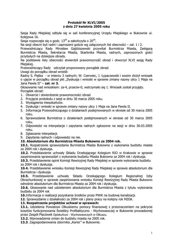 Protokóˇ Nr XLVI/2005 z dnia 27 kwietnia 2005 roku Sesja Rady