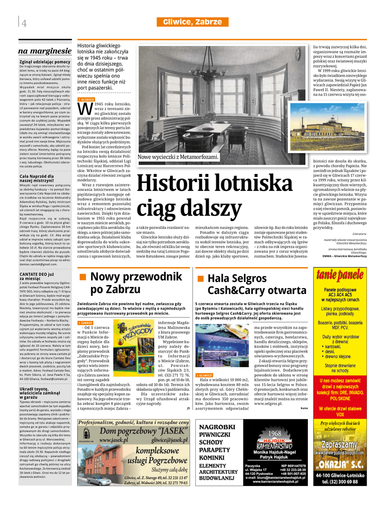 Gliwice, Zabrze 4 na marginesie Zginął udzielając pomocy Do tragicznego zdarzenia doszło tydzień temu, w środę na pasie A4 biegnącym w stronę Katowic. Zginął młody kierowca, który usiłował udzielić pomocy innemu poszkodowanemu. W ypadek mia ł miejs ce oko ło godz. 21.30. Falę nieszczęśliwych zdarzeń zapoczątkował kierujący volkswagenem polo 42-latek z Poznania, który – jak relacjonuje policja - stracił panowanie nad pojazdem, uderzył w bariery energochłonne, po czym zatrzymał się na lewym pasie przeznaczonym do szybkiej jazdy. Wypadek zauważył 24-latek, mieszkaniec województwa kujawsko-pomorskiego. Udało mu się ominąć nieoświetlonego w wyniku awarii volkswagena i zatrzymać przed nim swoje bmw. Mężczyzna wyszedł z samochodu, aby udzielić pomocy ofierze. Niestety, będąc na pasie zieleni został śmiertelnie potrącony przez toyotę kierowaną przez 38-latka z woj. lubuskiego. Okoliczności zdarzenia ustala policja. Cała Naprzód dla naszej mistrzyni! Miejski rajd rowerowy połączony ze zbiórką funduszy – to pomysł Stowarzyszenia Cała Naprzód na zdobycie środków na leczenie Aleksandry Adamskiej-Rylskiej, byłej mistrzyni Śląska w windsurfingu i społeczniczki, od czterech lat zmagającej się z chorobą nowotworową. Rajd rozpocznie się w sobotę, 9 czerwca o godz. 10 na płycie gliwickiego Rynku. Zaplanowano 20 km odcinek trasy, której ukończenie przewiduje się na godz. 13. Aby wziąć udział w imprezie należy zakupić symboliczną cegiełkę, której koszt to zaledwie 10 zł. Na starcie prowadzona będzie również zbiórka do puszek. Chętni do udziału w rajdzie mogą zgłaszać chęć uczestnictwa pisząc na adres: [email protected]. CANTATE DEO już za miesiąc Z wielu powodów tegoroczny Ogólnopolski Festiwal Piosenki Religijnej CANTATE DEO, który odbędzie się 7 i 8 lipca w Gliwicach Sośnicy, będzie miał wyjątkowy charakter. Przede wszystkim będzie to jego jubileuszowa, 25 odsłona. Niestety, towarzyszyć mu będzie również smutna okoliczność – to pierwsza edycja po śmierci jednego z pomysłodawców Festiwalu – Norberta Blachy. Przypomnijmy, że udział w tym tradycyjnym już wydarzeniu wezmą artyści wykonujący muzykę religijną. Na scenie usłyszymy zarówno zespoły jak i solistów. Do udziału w festiwalu można się zgłaszać do 10 czerwca. Należy w tym celu wypełnić formularz zgłoszeniowy pobrany ze strony www.cantate.pl i dostarczyć go do biura Cantate Deo wraz z kasetą lub płytą z nagraniami dwóch piosenek, osobiście, pocztą lub e-mailem. Adres: Festiwal Cantate Deo, ks. Piotr Sikora, ul. Jana Pawła II 5a, 44-100 Gliwice, [email protected]. Ukradł toyotę, właściciela zamknął w garażu Typowy obrazek – mężczyzna zamierza wjechać samochodem (w tym wypadku toyotą yaris) do garażu, wysiada z niego pozostawiając zapalony silnik i podchodzi do bramy. Nietypowe zakończenie – mężczyznę od tyłu atakuje napastnik, zamyka go w garażu i odjeżdża przygotowanym do drogi samochodem. Wszystko to zdarzyło się kilka dni temu w Gliwicach przy ul. Warszawskiej. Informację o rozboju dokonanym na 60-letnim mężczyźnie policja otrzymała około 19.30. Napastnik niedługo cieszył się zdobyczą – powiadomieni drogą radiową policjanci z drogówki zatrzymali go chwilę później na ulicy Kochanowskiego. Za kierownicą siedział 18-latek z Gliwic. Grozi mu do 12 lat pozbawienia wolności. Historia gliwickiego lotniska nie zakończyła się w 1945 roku – trwa do dnia dzisiejszego, choć w ostatnim półwieczu spełnia ono inne nieco funkcje niż port pasażerski. lia trwają zazwyczaj kilka dni, organizowane są rozmaite imprezy wraz z koncertami gwiazd polskiej oraz światowej muzyki rozrywkowej. W 1999 roku gliwickie lotnisko było świadkiem niezwykłego wydarzenia. Swoją wizytę w Gliwicach zapowiedział Papież Jan Paweł II. Niestety, zaplanowana na 15 czerwca wizyta tej oso- ›› gliwice W 1945 roku lotnisko, wraz z terenami ziemi gliwickiej zostało przejęte przez administrację polską. W ciągu kilku pierwszych powojennych lat tereny portu lotniczego zostały zdewastowane, wyburzone zostało większość budynków służących podróżnym. Pod koniec lat czterdziestych na lotnisku swoją działalność rozpoczyna koło lotnicze Politechniki Śląskiej, oddział Ligi Lotniczej oraz Harcerstwo Polskie. Wkrótce w Gliwicach zaczyna działać również związek modelarzy. Wraz z rozwojem zainteresowania lotnictwem w latach pięćdziesiątych następuje odbudowa gliwickiego lotniska wraz z remontem pozostałej infrastruktury i odnowieniem nawierzchni. Dzięki tym działaniom w 1955 roku powstał w naszym mieście aeroklub, początkowo jako filia aeroklubu śląskiego, a nieco później jako samodzielna sekcja. Działalność klubu doprowadziła do wielu sukcesów sportowych klubowiczów, umożliwiała zdobycie doświadczenia i uprawnień lotniczych, Nowe wycieczki z Metamorfozami. Historii lotniska ciąg dalszy a także pozwoliła rozsławić nasze miasto. Gliwickie lotnisko służy dzisiaj nie tylko potrzebom aeroklubu, ale również od kilku lat swoją siedzibę ma tutaj Lotnicze Pogotowie Ratunkowe, niosące pomoc Nowy przewodnik po Zabrzu - Od 1 czerwca w Punkcie Informacji o Mieście dostępny będzie dla dzieci nowy, bezpłatny przewodnik „Zabrzańskie Przygody”. Przewodnik oprócz wielu interesujących informacji o Zabrzu zawiera też szereg zagadek i łamigłówek dla najmłodszych. Ponadto w każdym przewodniku znajduje się specjalny kupon zabawowy. Na jego odwrocie trzeba zebrać komplet 8 pieczątek z tajemniczych miejsc Zabrza – siłownie itp. Raz do roku lotnisko zostaje opanowane przez studentów Politechniki Śląskiej w ramach odbywających się Igrów – z roku na rok impreza organizowana jest z coraz większym rozmachem. Studenckie Juwena- Hala Selgros Cash&Carry otwarta Zwiedzanie Zabrza nie powinno być nudne, zwłaszcza gdy zwiedza