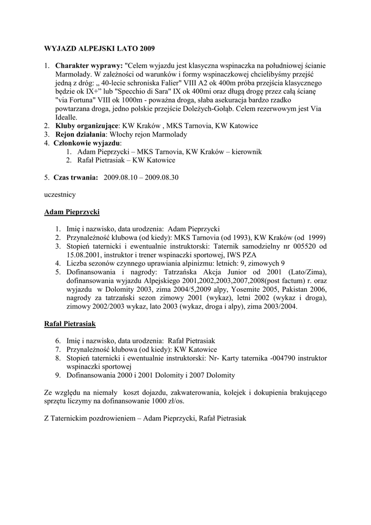 WYJAZD ALPEJSKI LATO 2009 1. Charakter wyprawy: "Celem wyjazdu jest klasyczna wspinaczka na południowej ścianie Marmolady. W zależności od warunków i formy wspinaczkowej chcielibyśmy przejść jedną z dróg: „ 40-lecie schroniska Falier" VIII A2 ok 400m próba przejścia klasycznego będzie ok IX+” lub "Specchio di Sara" IX ok 400mi oraz długą drogę przez całą ścianę "via Fortuna" VIII ok 1000m - poważna droga, słaba asekuracja bardzo rzadko powtarzana droga, jedno polskie przejście Doleżych-Gołąb. Celem rezerwowym jest Via Idealle. 2. Kluby organizujące: KW Kraków , MKS Tarnovia, KW Katowice 3. Rejon działania: Włochy rejon Marmolady 4. Członkowie wyjazdu: 1. Adam Pieprzycki – MKS Tarnovia, KW Kraków – kierownik 2. Rafał Pietrasiak – KW Katowice 5. Czas trwania: 2009.08.10 – 2009.08.30 uczestnicy Adam Pieprzycki 1. Imię i nazwisko, data urodzenia: Adam Pieprzycki 2. Przynależność klubowa (od kiedy): MKS Tarnovia (od 1993), KW Kraków (od 1999) 3. Stopień taternicki i ewentualnie instruktorski: Taternik samodzielny nr 005520 od 15.08.2001, instruktor i trener wspinaczki sportowej, IWS PZA 4. Liczba sezonów czynnego uprawiania alpinizmu: letnich: 9, zimowych 9 5. Dofinansowania i nagrody: Tatrzańska Akcja Junior od 2001 (Lato/Zima), dofinansowania wyjazdu Alpejskiego 2001,2002,2003,2007,2008(post factum) r. oraz wyjazdu w Dolomity 2003, zima 2004/5,2009 alpy, Yosemite 2005, Pakistan 2006, nagrody za tatrzański sezon zimowy 2001 (wykaz), letni 2002 (wykaz i droga), zimowy 2002/2003 wykaz, lato 2003 (wykaz, droga i alpy), zima 2003/2004. Rafał Pietrasiak 6. Imię i nazwisko, data urodzenia: Rafał Pietrasiak 7. Przynależność klubowa (od kiedy): KW Katowice 8. Stopień taternicki i ewentualnie instruktorski: Nr- Karty taternika -004790 instruktor wspinaczki sportowej 9. Dofinansowania 2000 i 2001 Dolomity i 2007 Dolomity Ze względu na niemały koszt dojazdu, zakwaterowania, kolejek i dokupienia brakującego sprzętu liczymy na dofinansowanie 1000 zł/os. Z Taternickim pozdrowieniem – Adam Pieprzycki, Rafał Pietrasiak