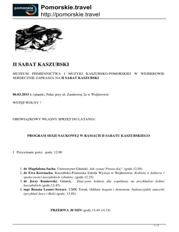 Pomorskie.travel http://pomorskie.travel II SABAT KASZUBSKI MUZEUM PIŚMIENNICTWA I MUZYKI KASZUBSKO-POMORSKIEJ W WEJHEROWIE SERDECZNIE ZAPRASZA NA II SABAT KASZUBSKI 06.03.2015 r. (piątek), Pałac przy ul. Zamkowej 2a w Wejherowie WSTĘP WOLNY ! OBOWIĄZKOWY WŁASNY SPRZĘT DO LATANIA! PROGRAM SESJI NAUKOWEJ W RAMACH II SABATU KASZUBSKIEGO I Przywitanie gości godz. 12.00 1. dr Magdalena Sacha, Uniwersytet Gdański, Jak zostać Prusaczką? (godz.12.05) 2. dr Ewa Kownacka, Kaszubsko-Pomorska Szkoła Wyższa w Wejherowie, Kobieta w kulturze i społeczności kaszubskich rybaków (godz.12.25) 3. dr Jerzy Kuniewski, Gdańsk, Znaczenie kobiety dla wspólnoty na przykładzie kobiet kaszubskich (godz.12.45) 4. mgr Renata Lesner-Szwarc, UMK Toruń, Oddane bogom i demonom. Indonezyjskie tancerki (przykład Jawy i Bali) (godz. 13.05) PRZERWA 30 MIN (godz.13.45-14.15) 1/2 Pomorskie.travel http://pomorskie.travel dr Aleksandra Wierucka, Uniwersytet Gdański, Miejsce i rola kobiet w kulturach tubylczych Amazonii (godz.14.15) mgr Adam Piekarski, Bydgoszcz, Poślubić Indiańską „squaw”. Rola kobiet dawniej i dziś wśród tubylczych plemion Ameryki Północnej (godz.14.35) mgr Michał Ciesielski,Kobiecy pierwiastek w muzyce jazzowej –Jazz i wpływ kobiet na jego rozwój, prezentacja wybranych utworów na fortepian (godz.14.55) II Forum sabatowe – prezentacje sztuk wyzwolonych (godz.15.20-17.00) 1. Prezentacja dokonań Pomorskiego Związku Pań Niezależnych (15.20) 2. Prezentacja Koła Gospodyń Miejskich z Gdyni (15.40) 3. Prezentacja Koła Gospodyń Wiejskich z Chwaszczyna (16.00) 4. Prezentacja KGW Stowarzyszenia Kobiet Niezależnych z Chmielna (16.30) III Wernisaż wystawy ze zbiorów Adama Piekarskiego pt. „Indiańskie oblicza Ameryki” - otwarcie wystawy nastąpi ok. godz. 17.30 Zapraszamy! Anna Kąkol 2/2 Powered by TCPDF (www.tcpdf.org)