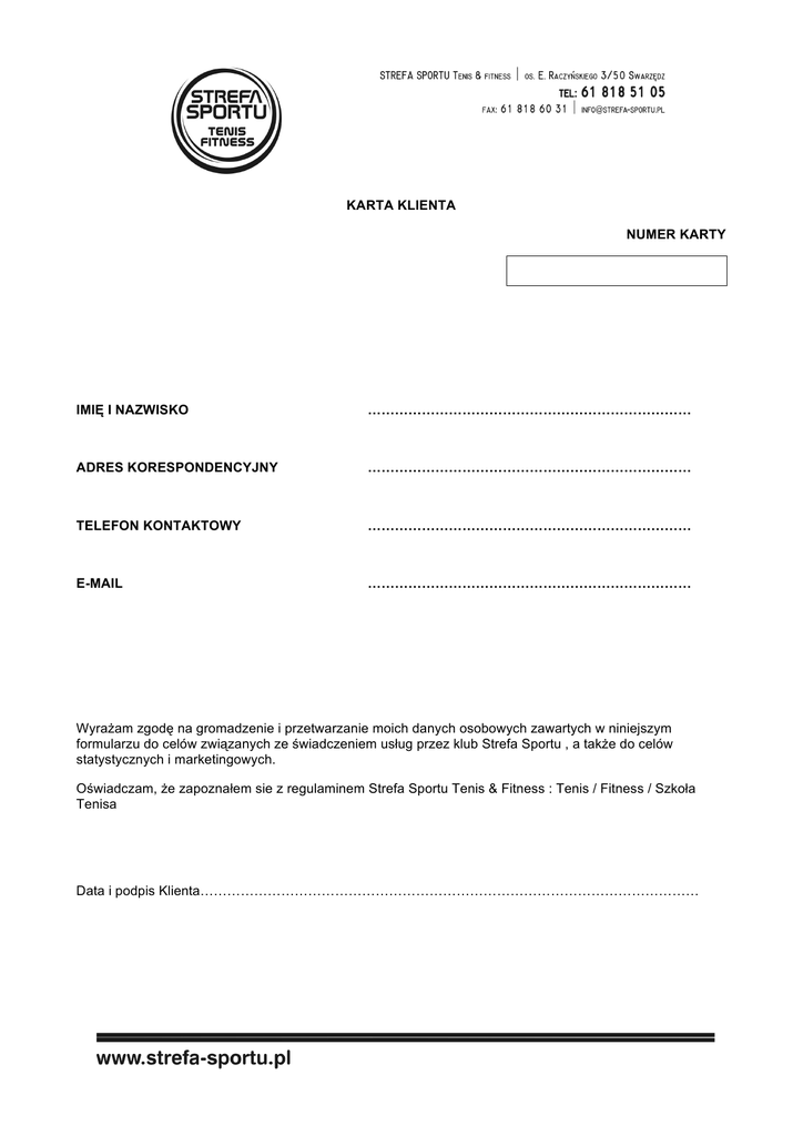 KARTA KLIENTA NUMER KARTY IMIĘ I NAZWISKO ……………………………………………………………… ADRES KORESPONDENCYJNY ……………………………………………………………… TELEFON KONTAKTOWY ……………………………………………………………… E-MAIL ……………………………………………………………… Wyrażam zgodę na gromadzenie i przetwarzanie moich danych osobowych zawartych w niniejszym formularzu do celów związanych ze świadczeniem usług przez klub Strefa Sportu , a także do celów statystycznych i marketingowych. Oświadczam, że zapoznałem sie z regulaminem Strefa Sportu Tenis & Fitness : Tenis / Fitness / Szkoła Tenisa Data i podpis Klienta…………………………………………………………………………………………………
